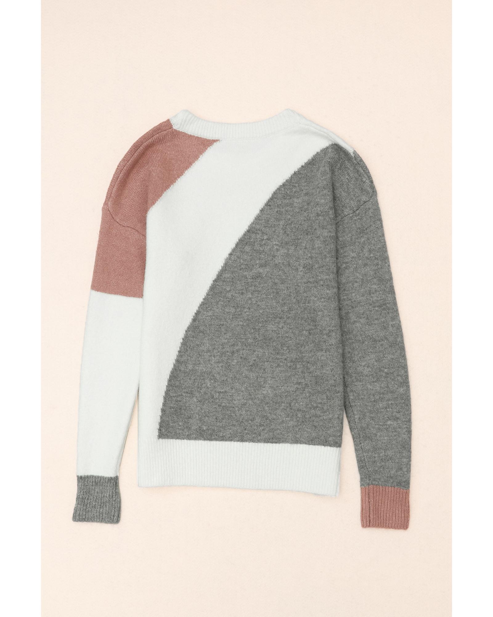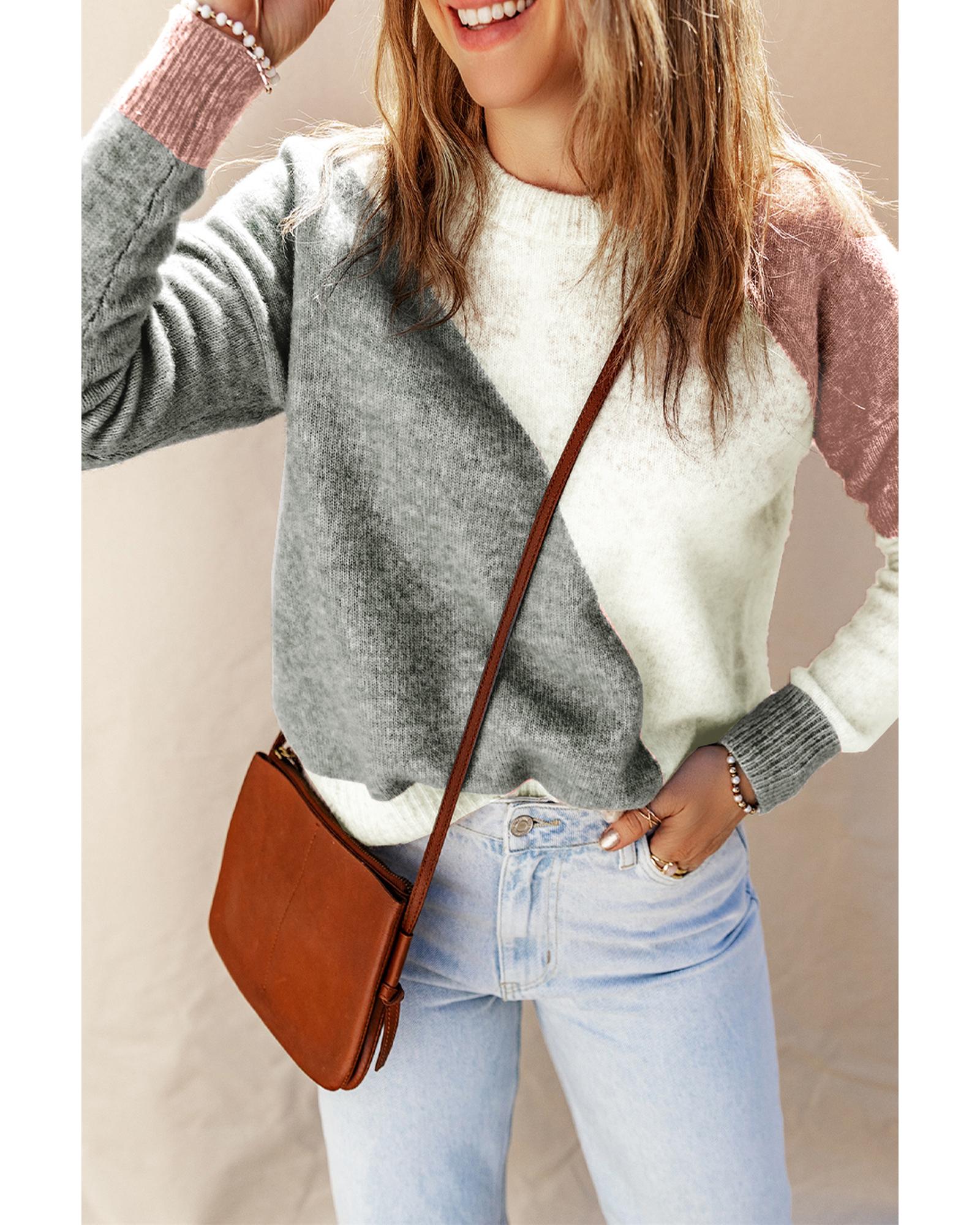 - Gray Colorblock Ribbed Trim Round Neck Sweater