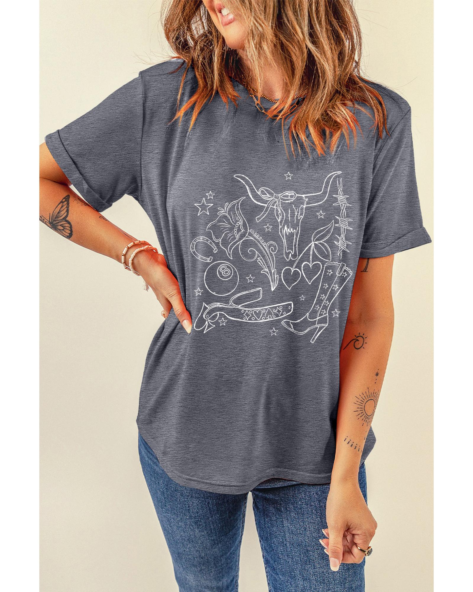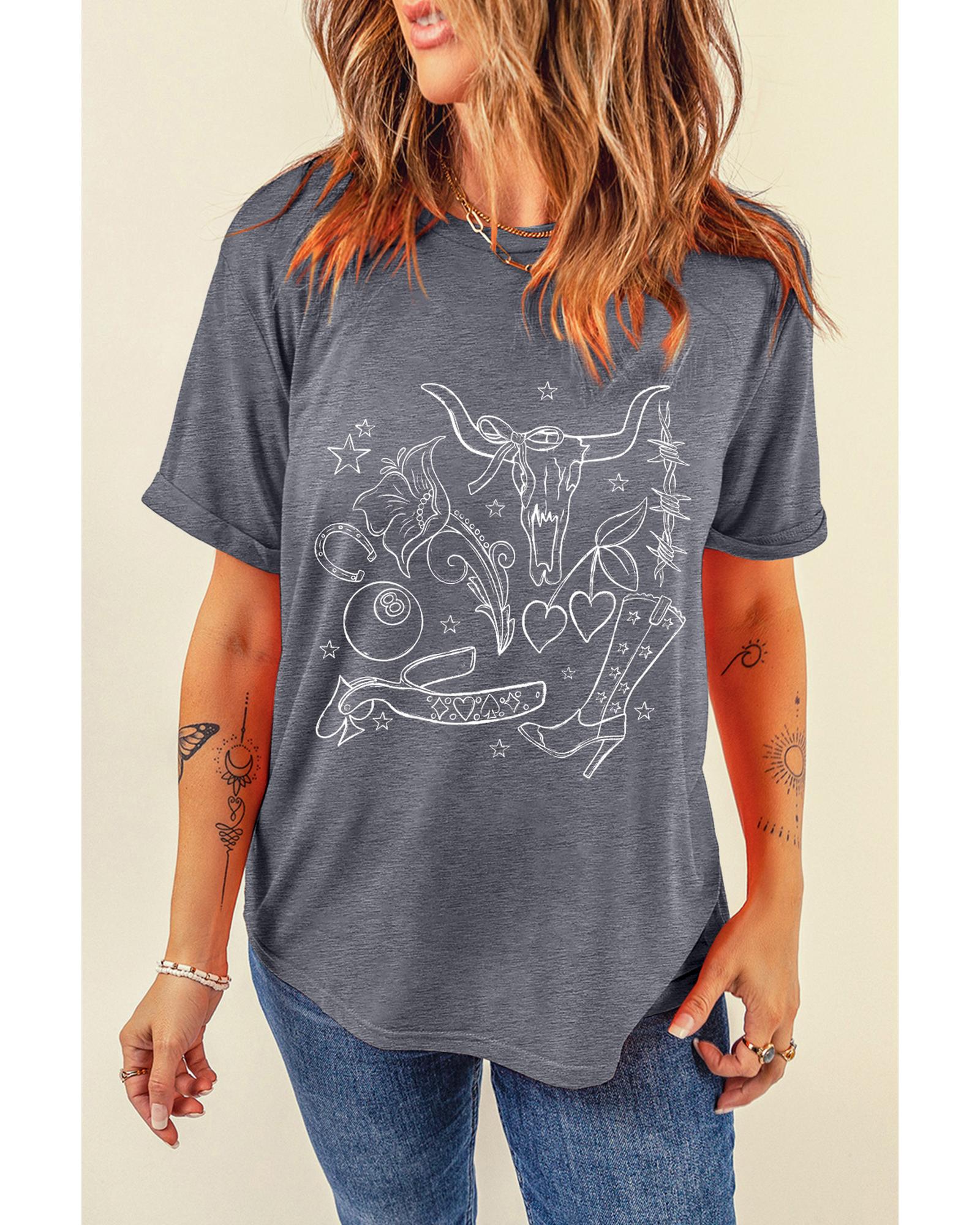Gray Cowgirl Boots OX Head Western Fashion Print Crewneck Tee – L