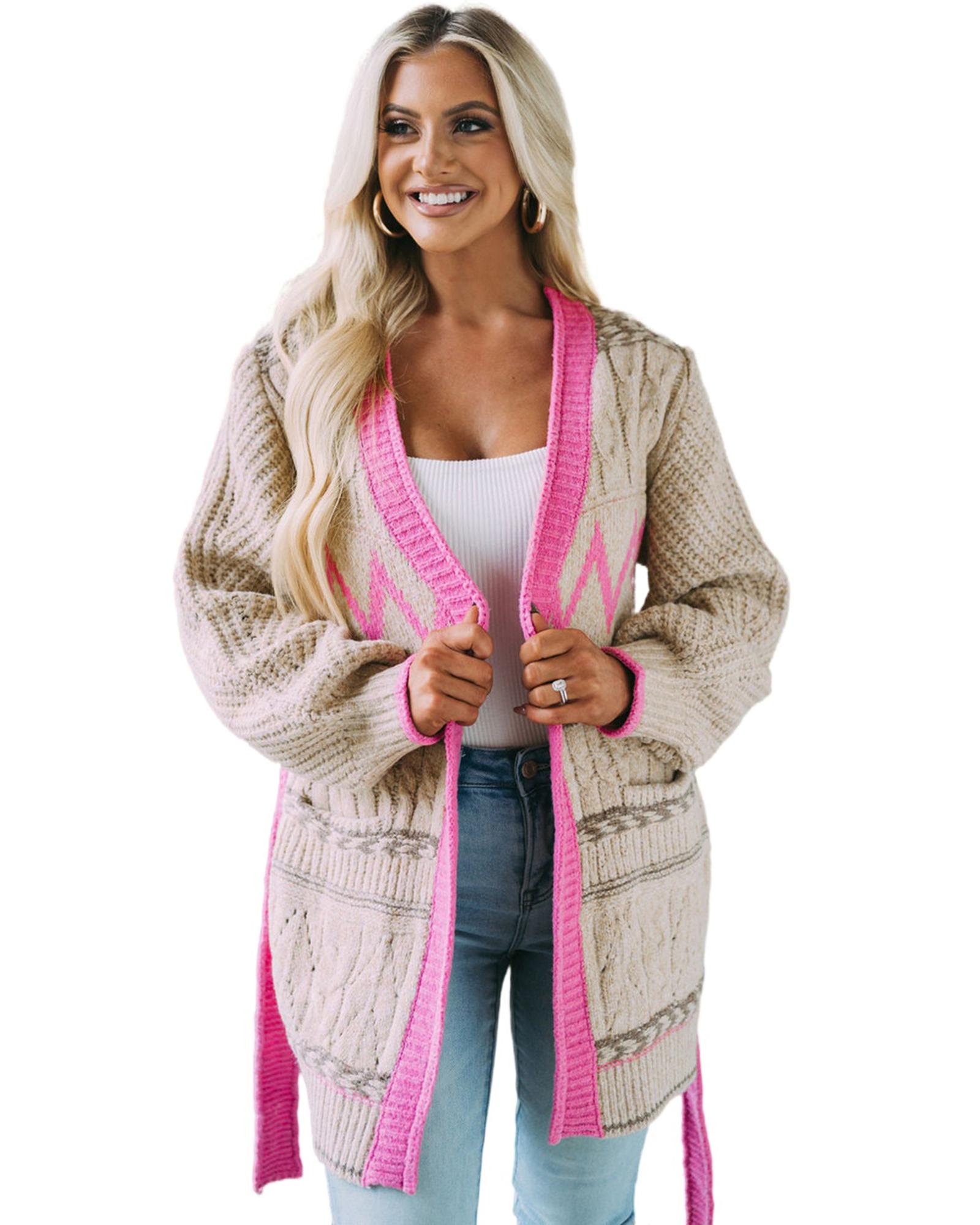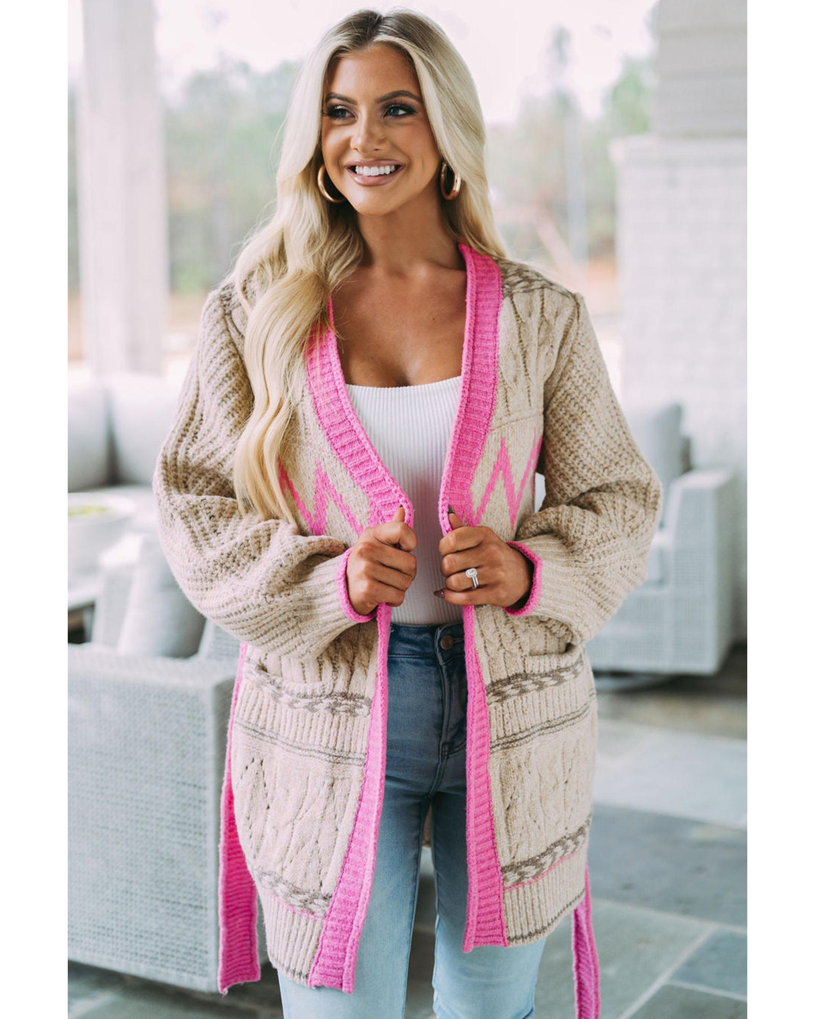 Gray Geometric Cable Knit Pocketed Open Front Cardigan – L