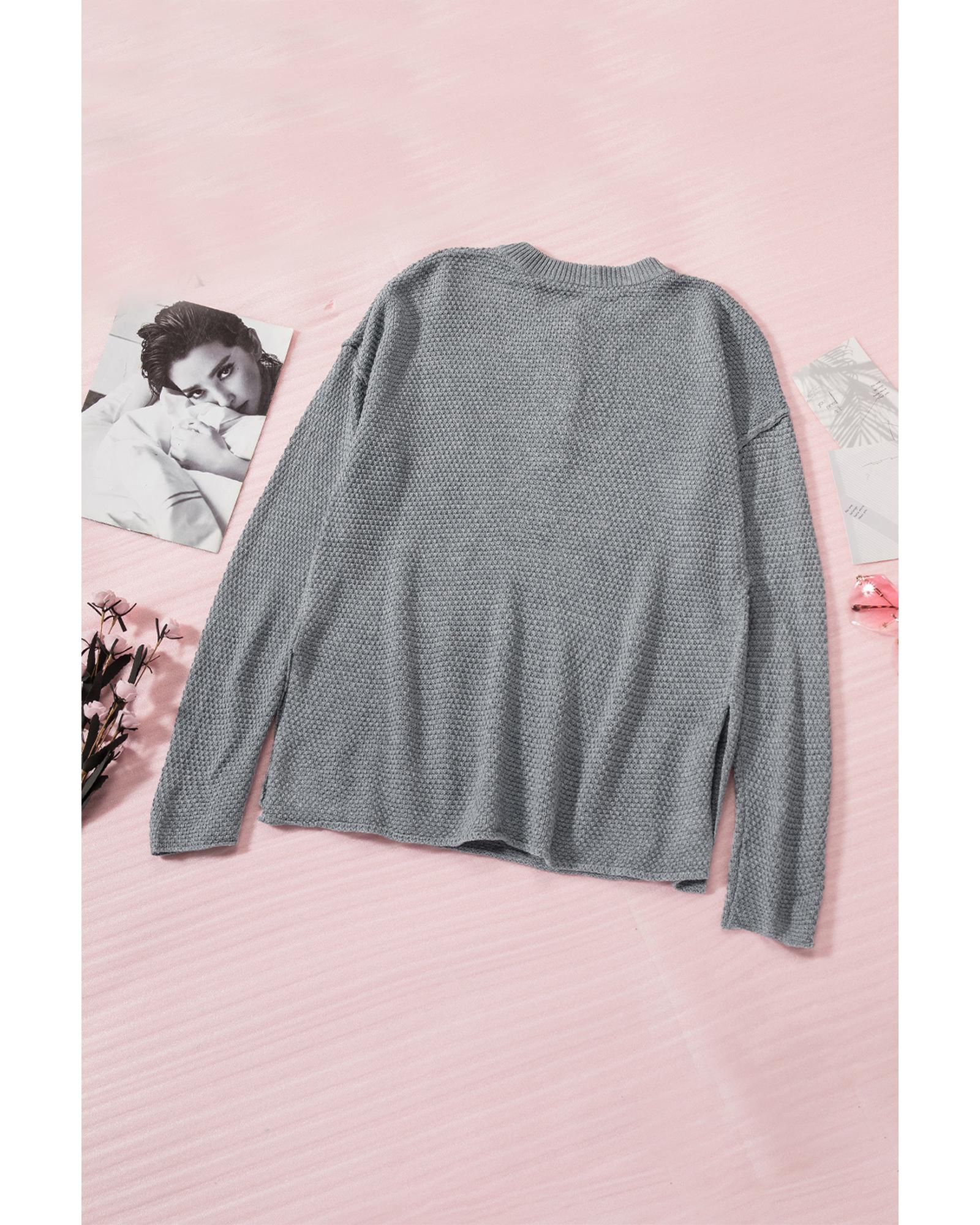 Gray Henley Pullover Drop Shoulder Sweater with Slits – S