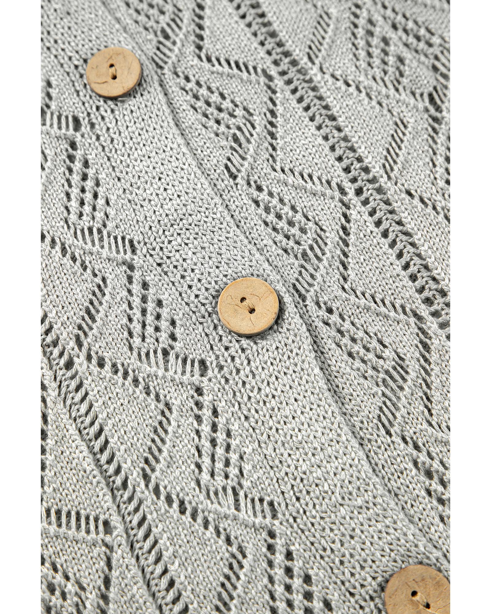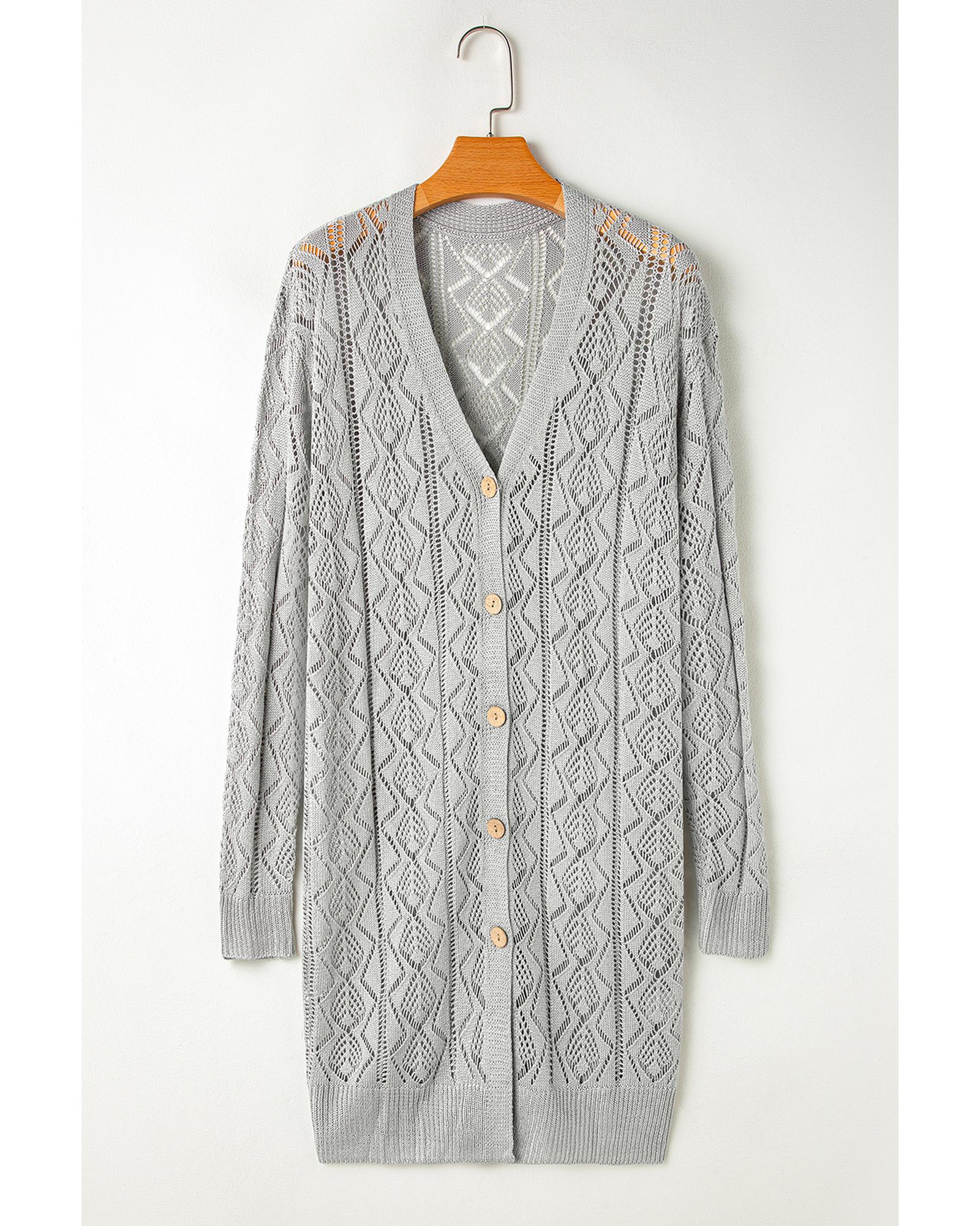 - Gray long cardigan with intricate knit hollow out details