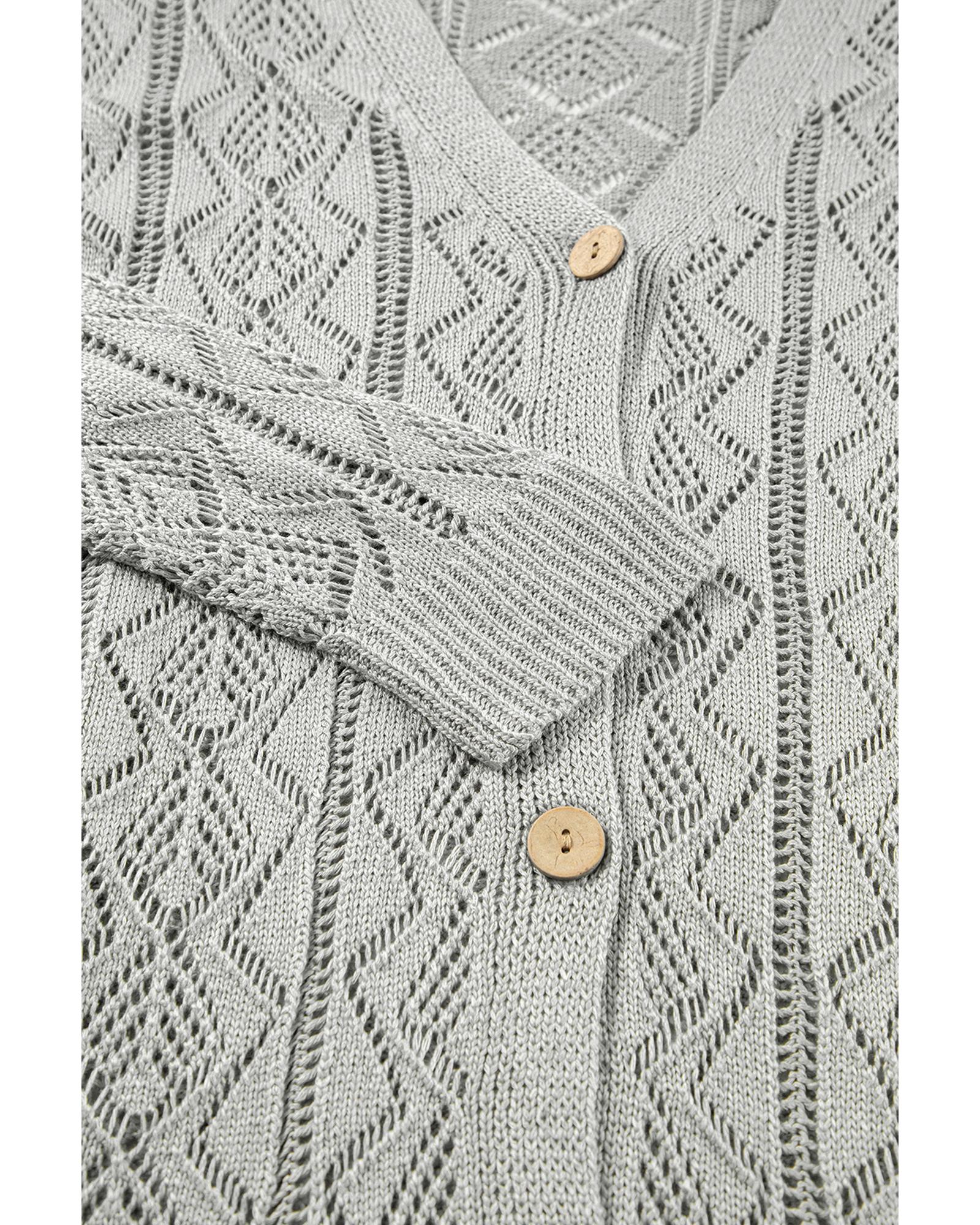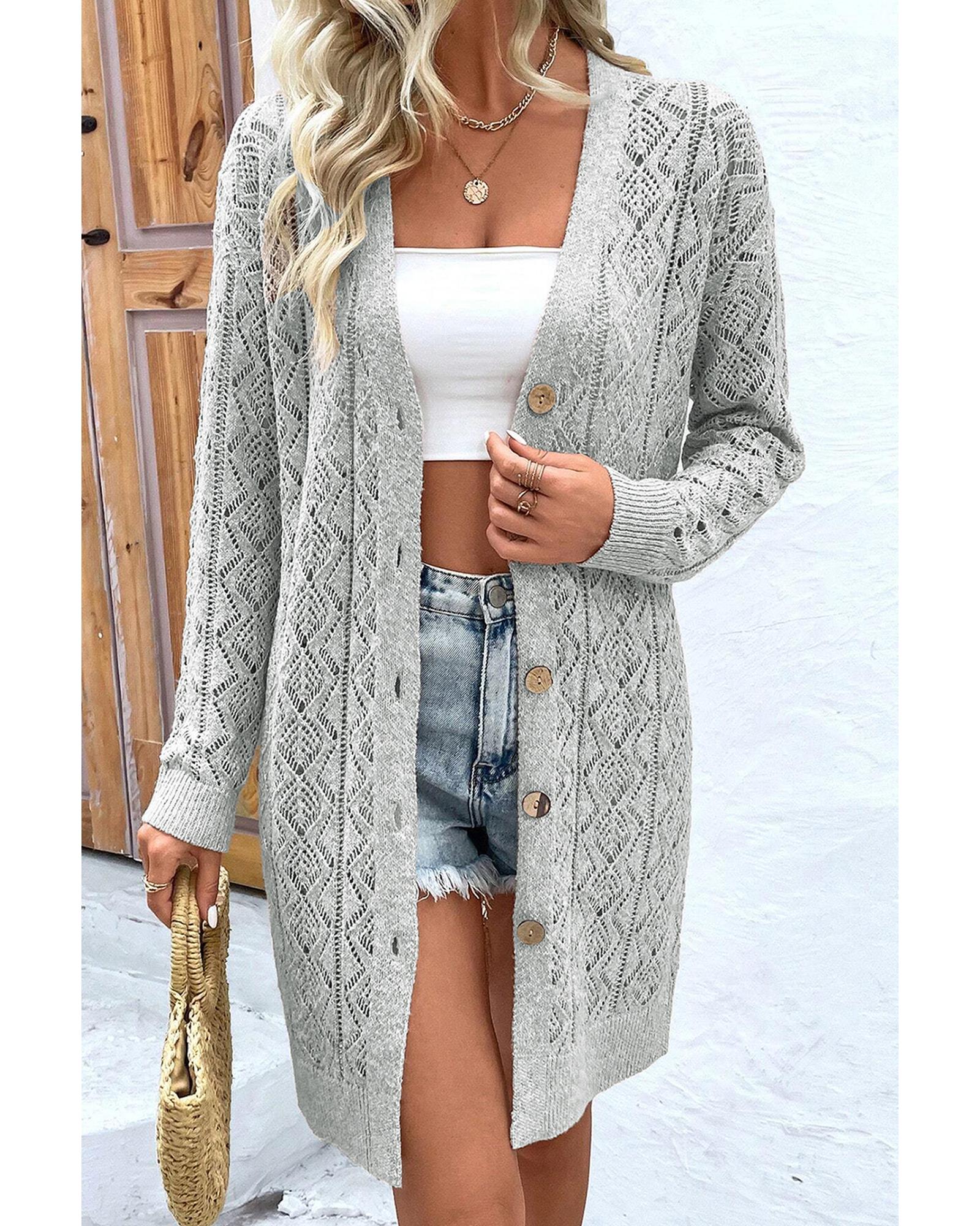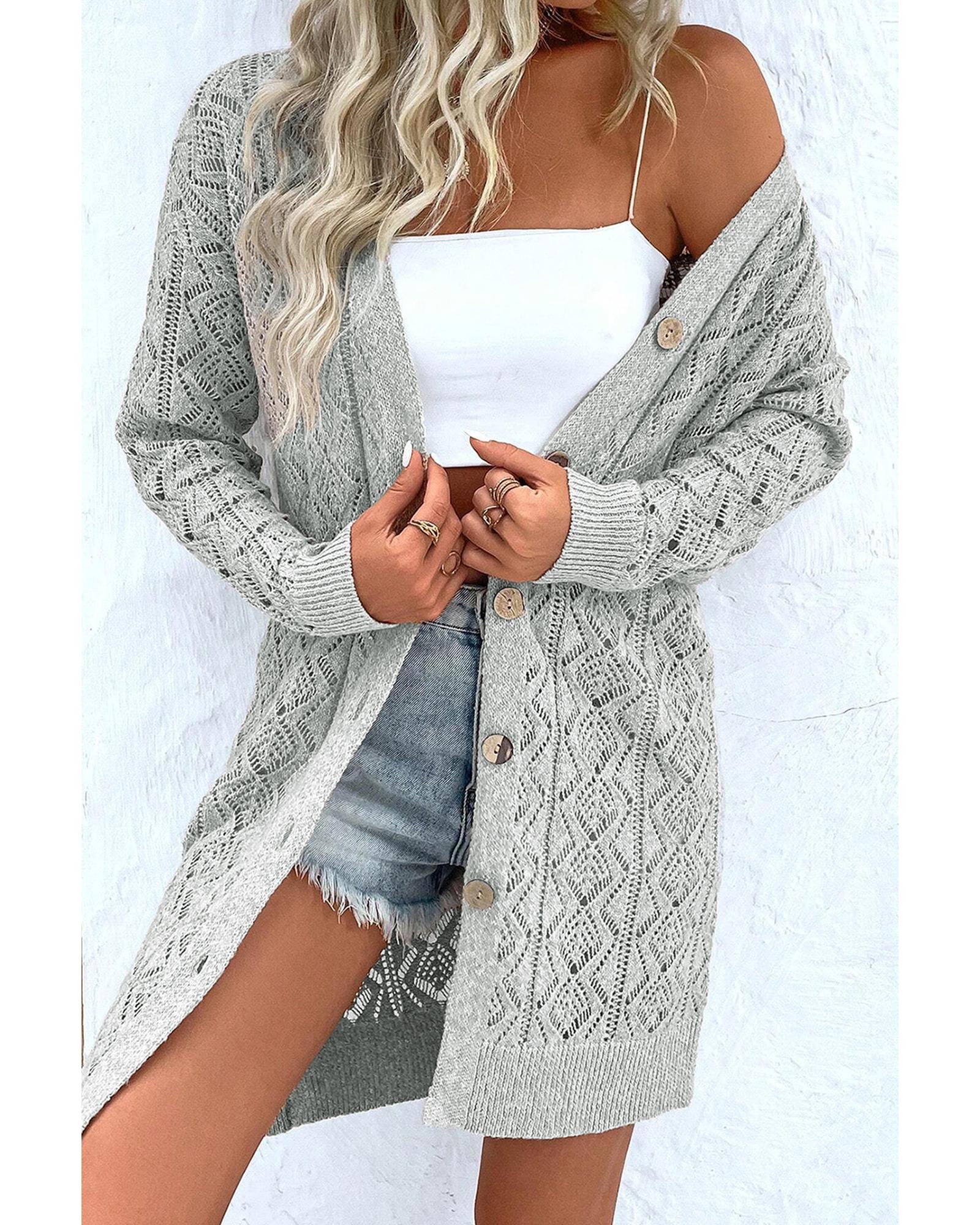 - Gray long cardigan with intricate knit hollow out details