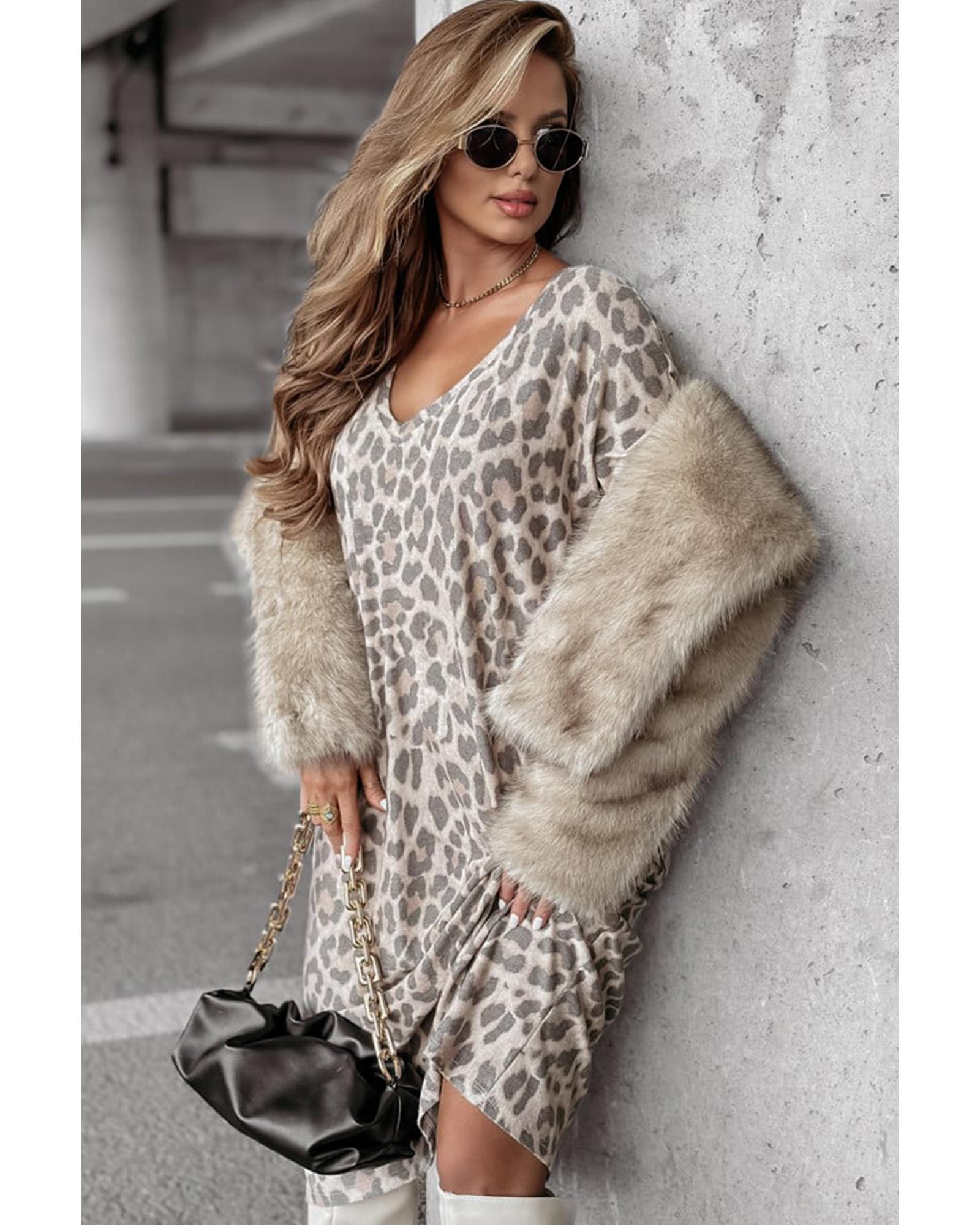 Gray Leopard Print V Neck Loose Fit Mini Dress - S