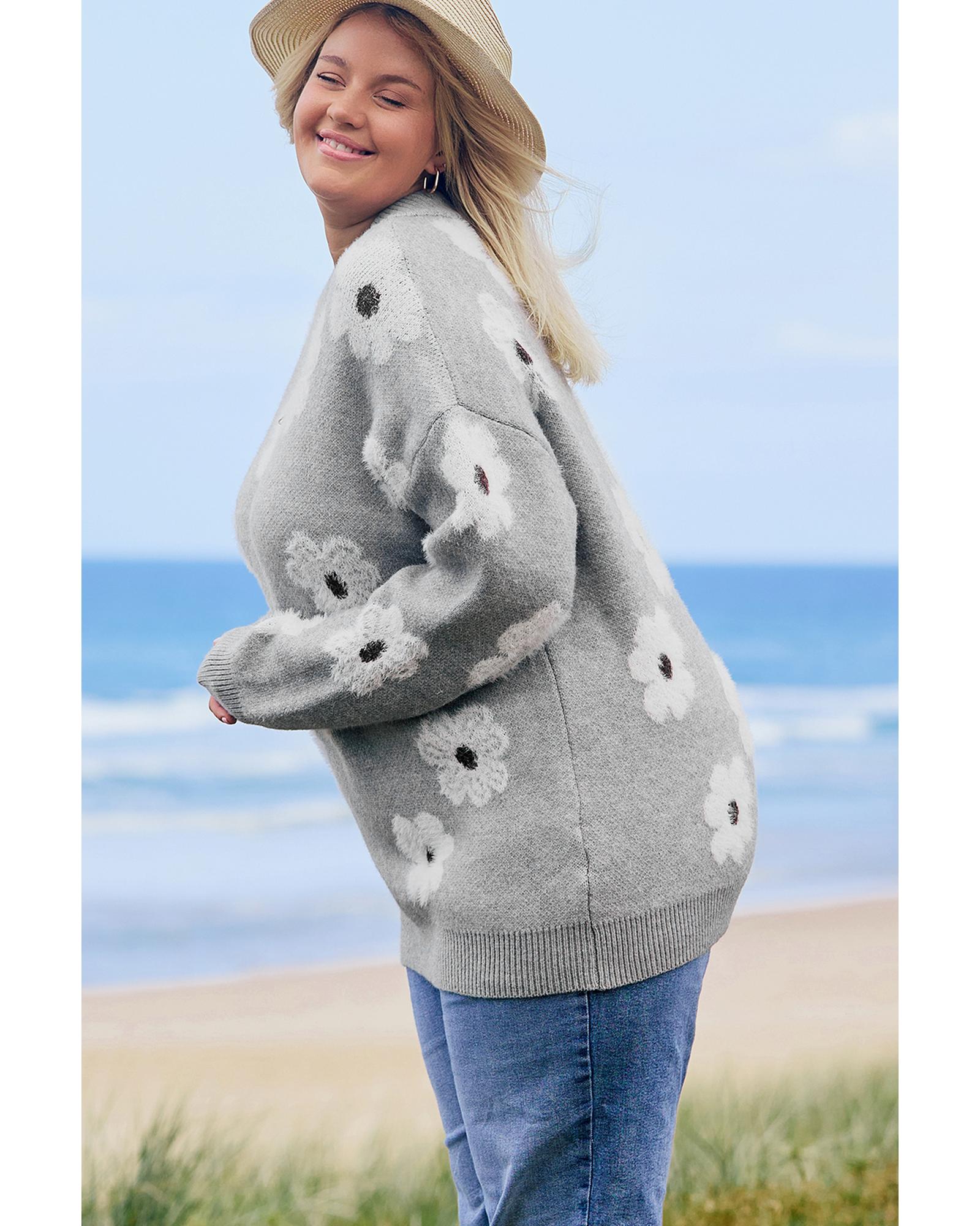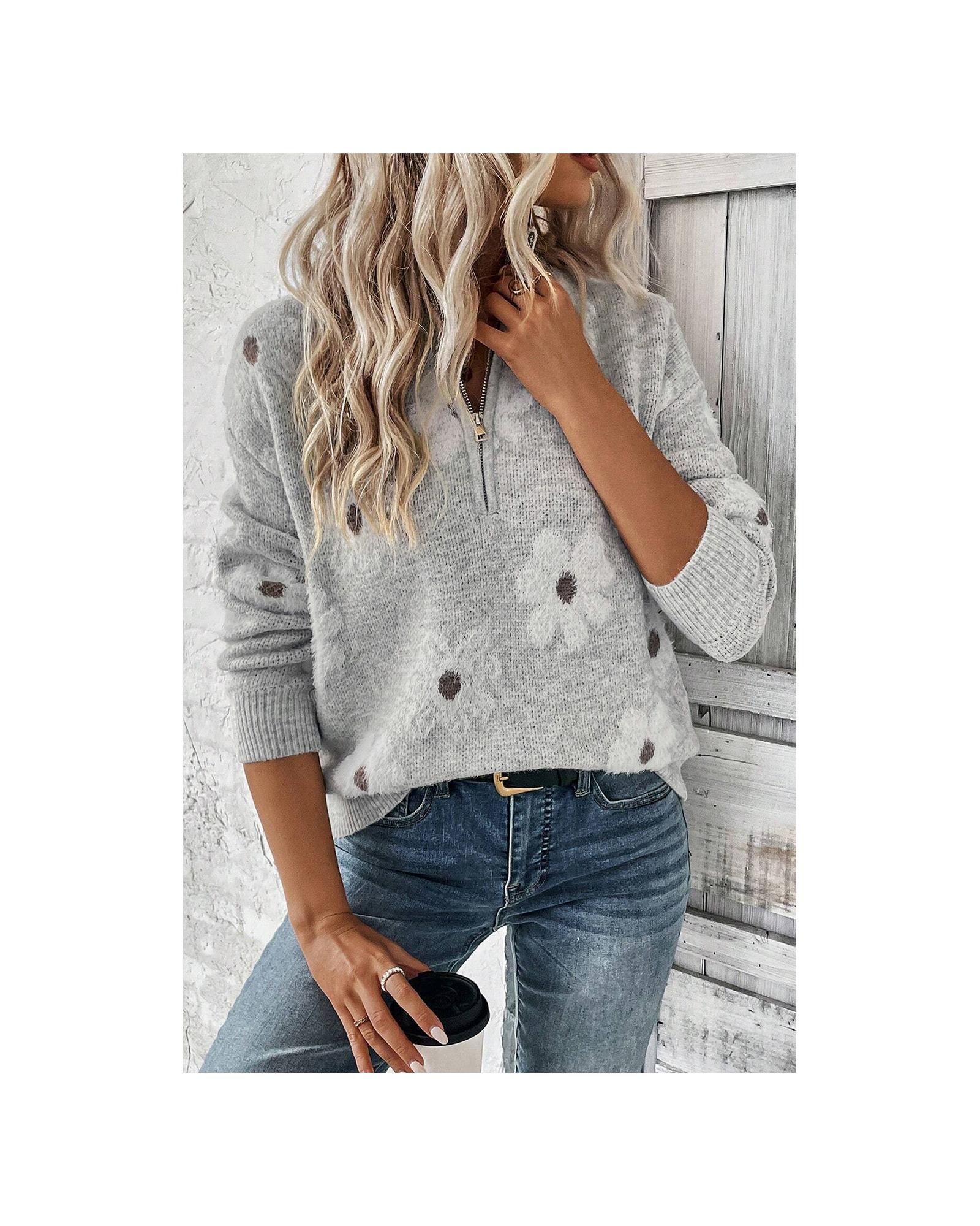 Gray Plus Size Embroidered Floral Pattern Half Zip Sweater – 1X