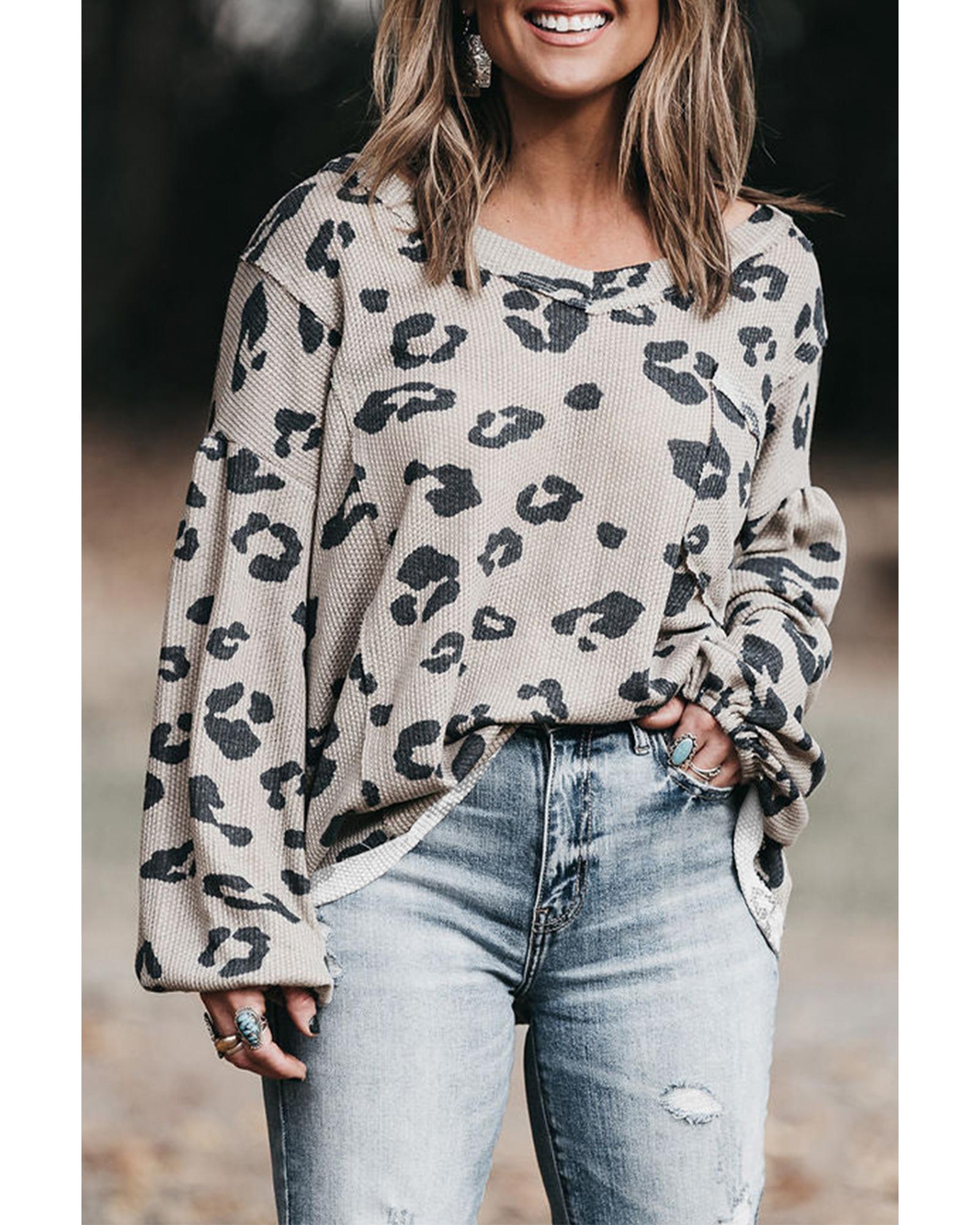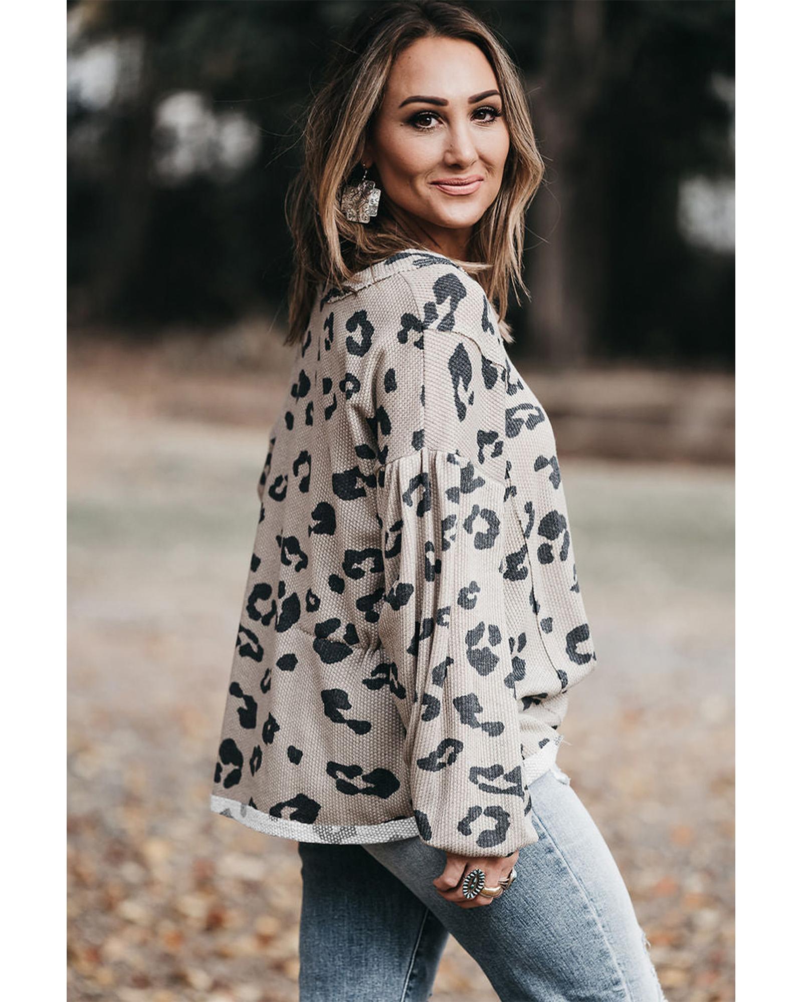 Gray Printed Leopard Balloon Sleeve Thermal Knit Plus Size Top – 1X