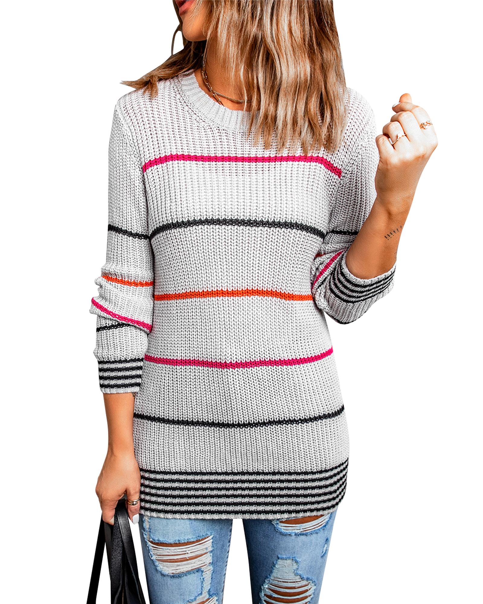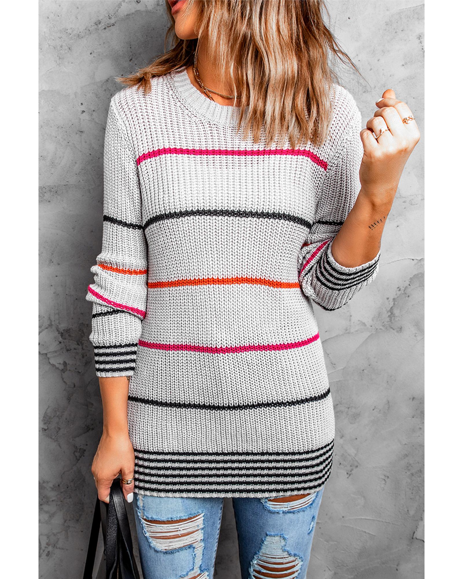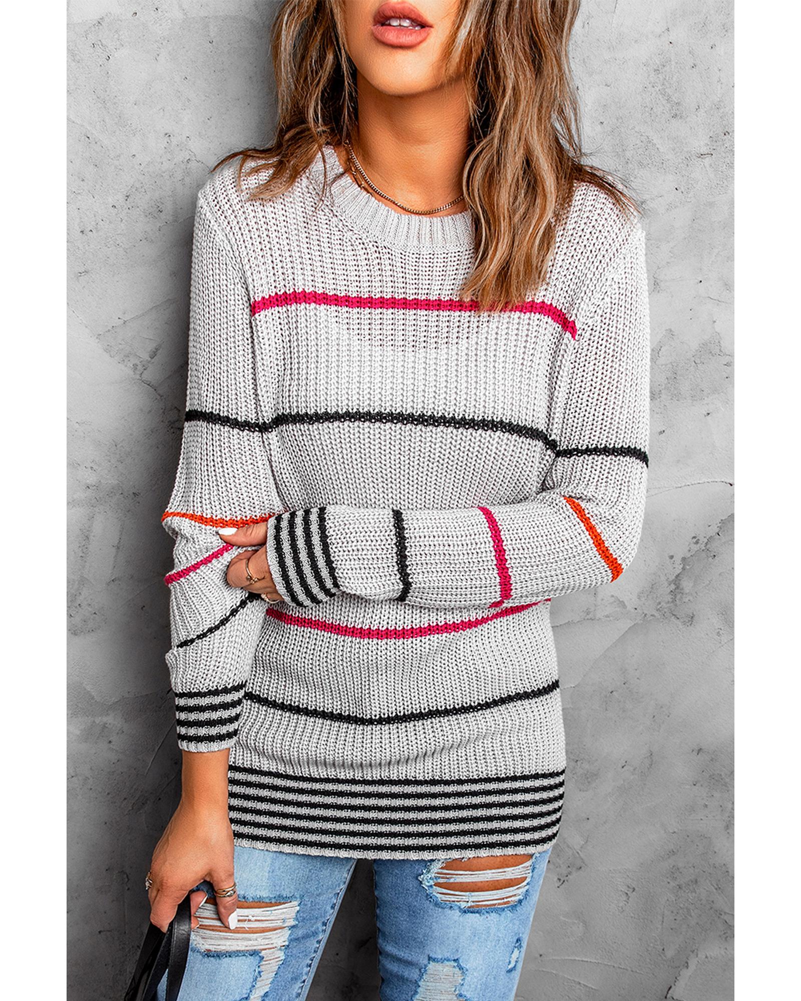 • Colorful stripes design on a gray sweater