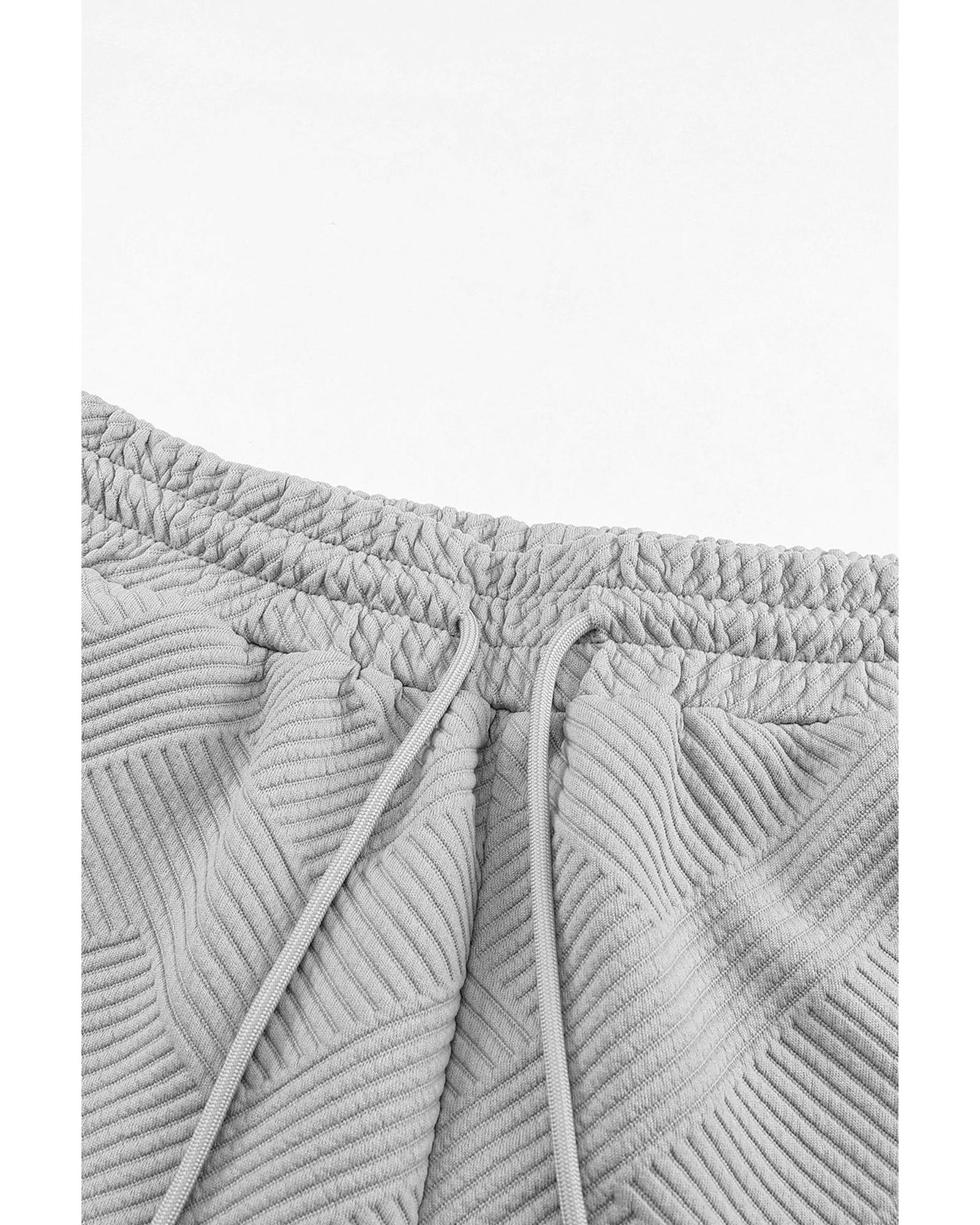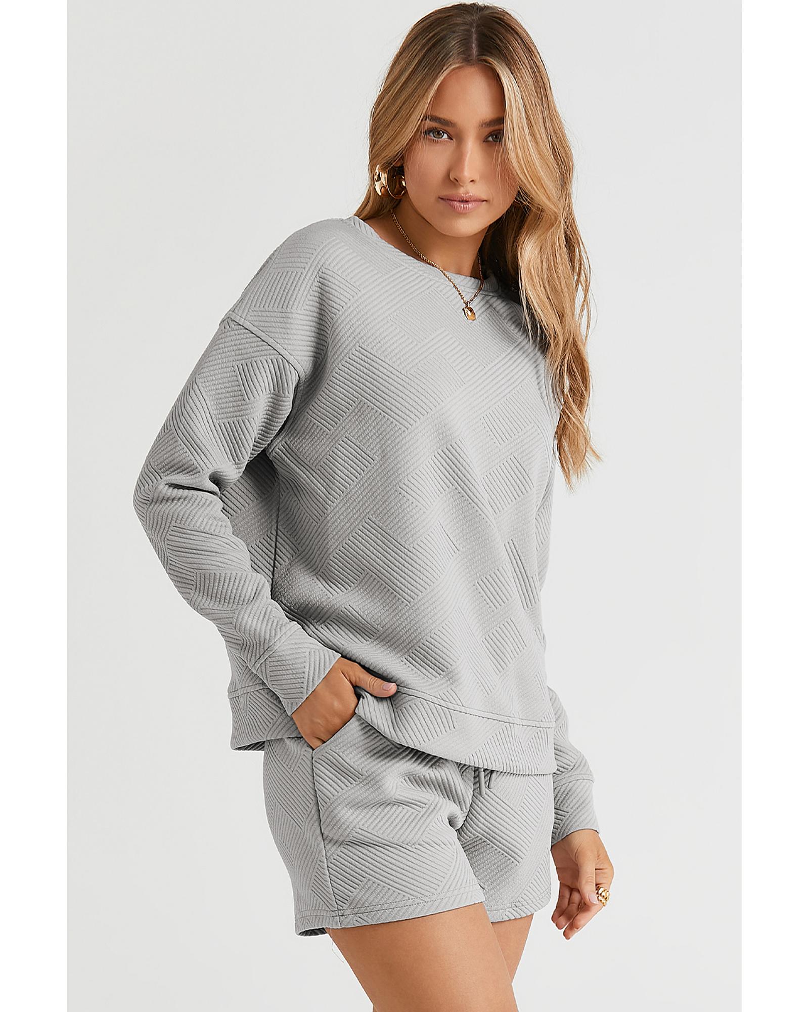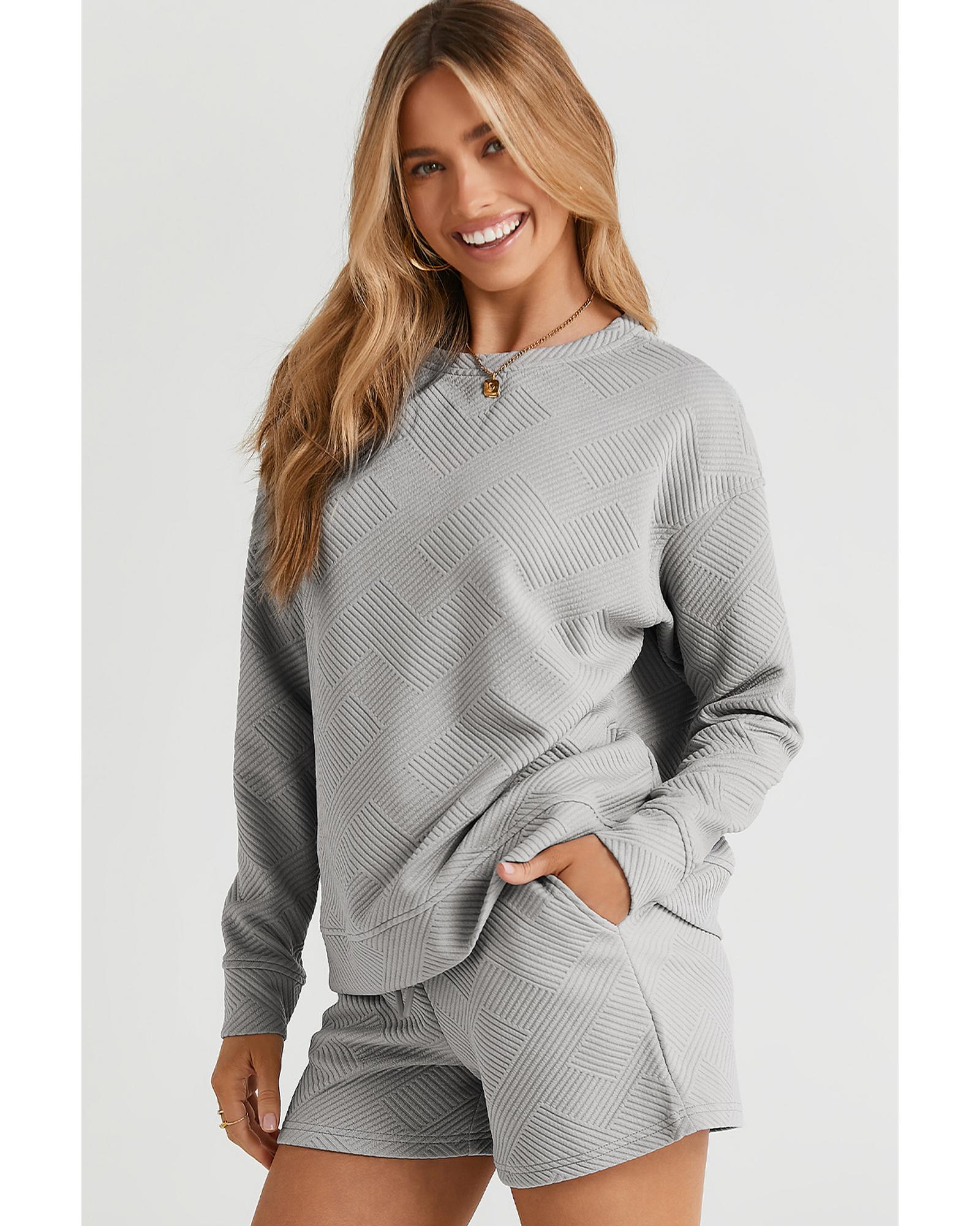 Gray Textured Long Sleeve Top and Drawstring Shorts Set – L
