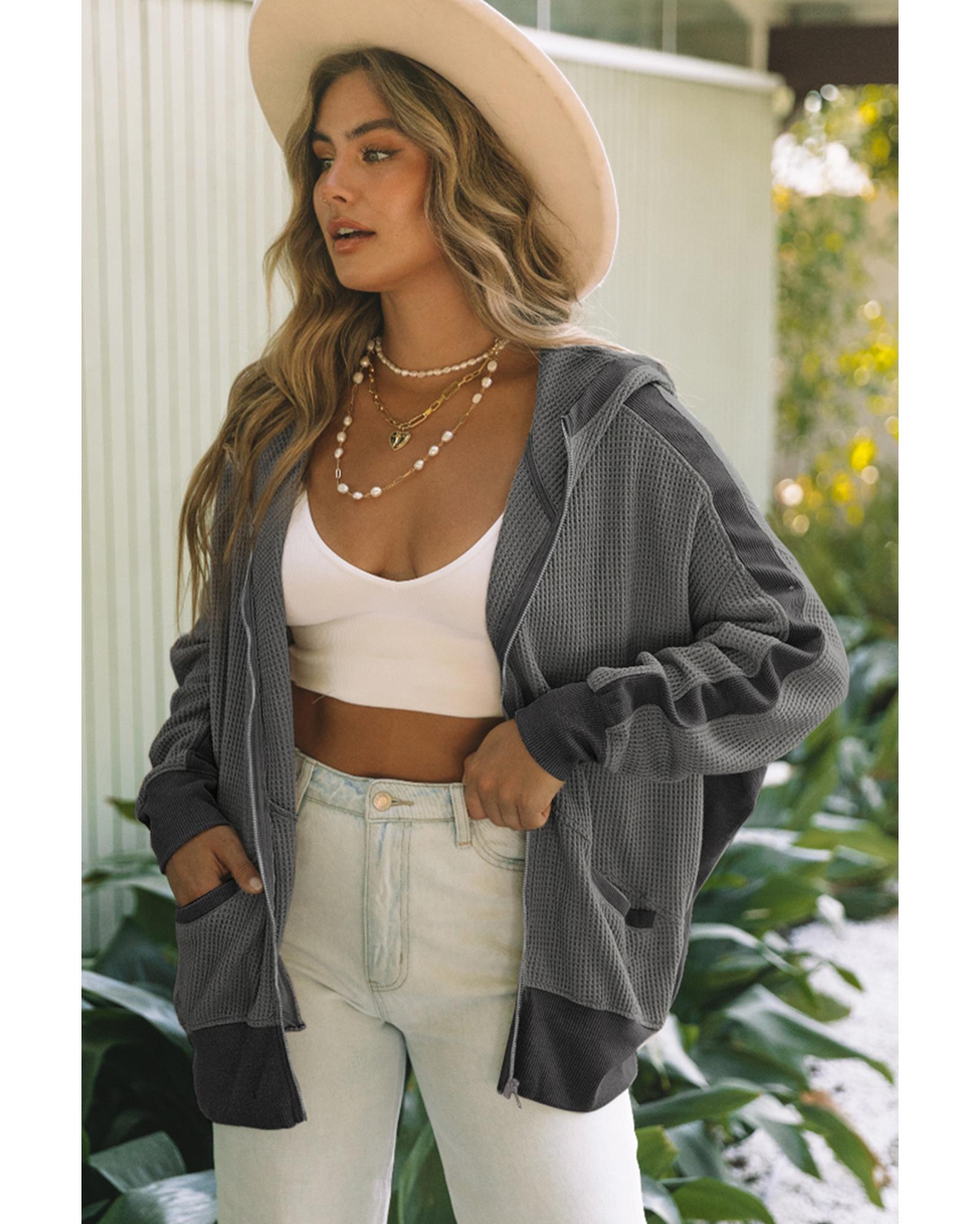 Gray Thermal Waffle Knit Full Zipper Hooded Jacket – M
