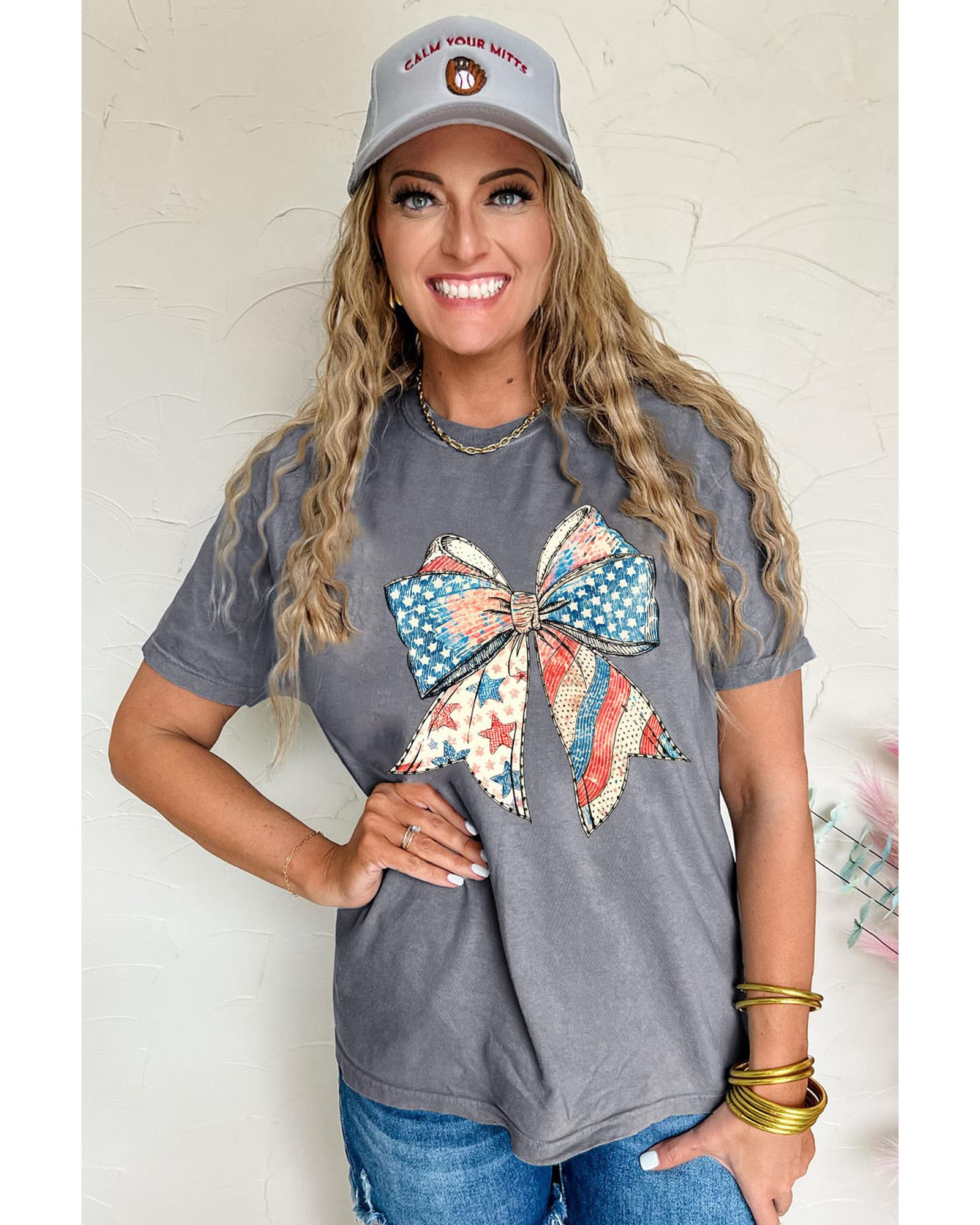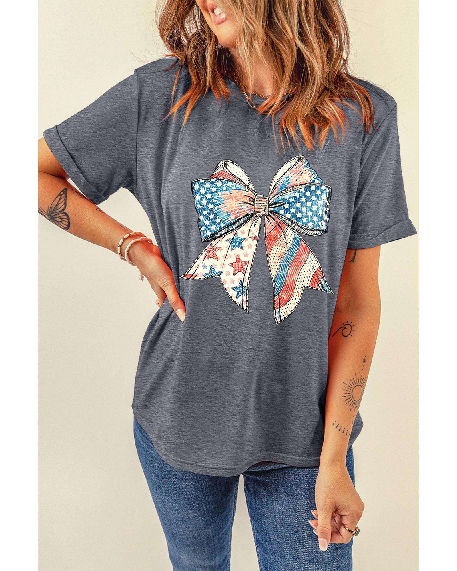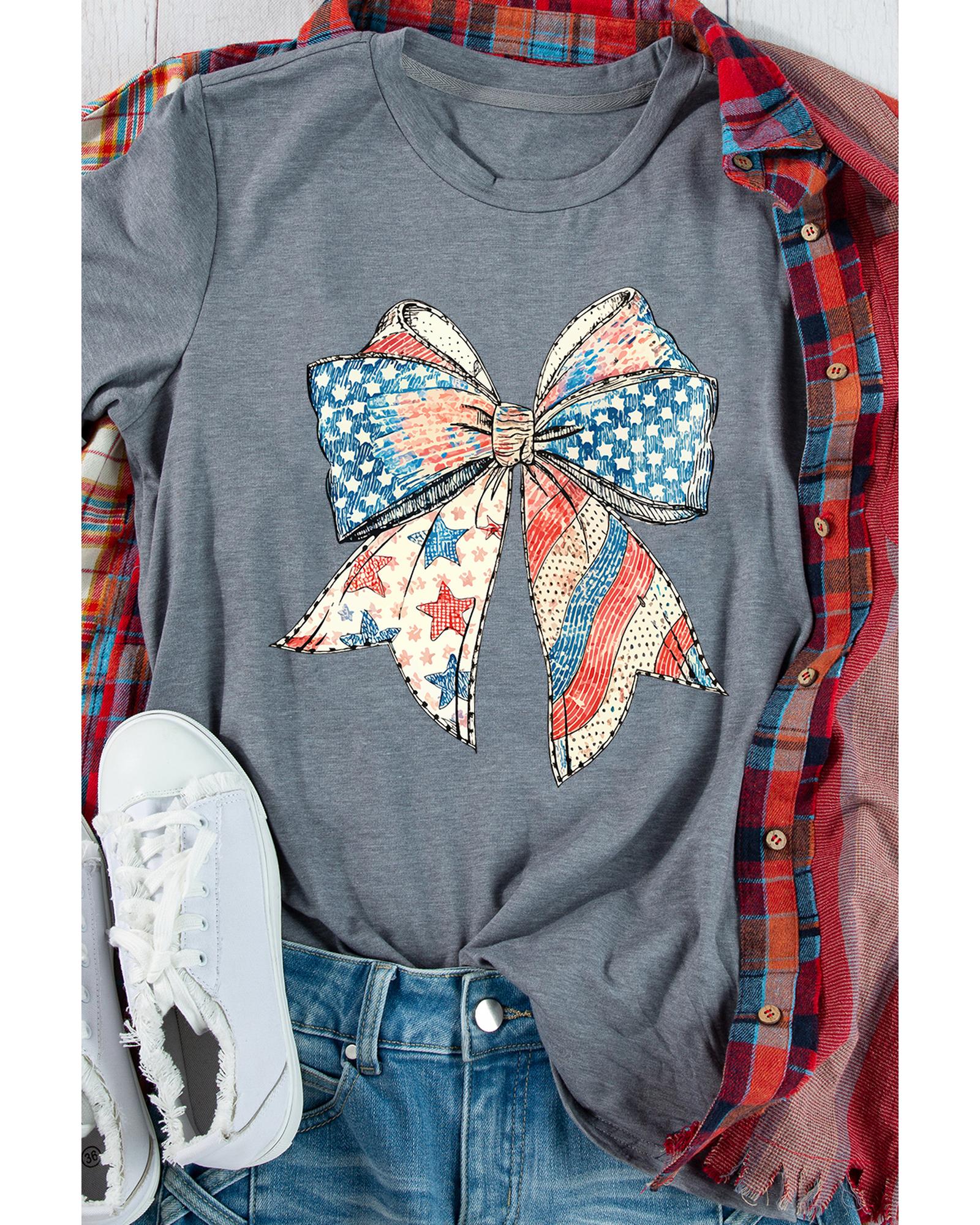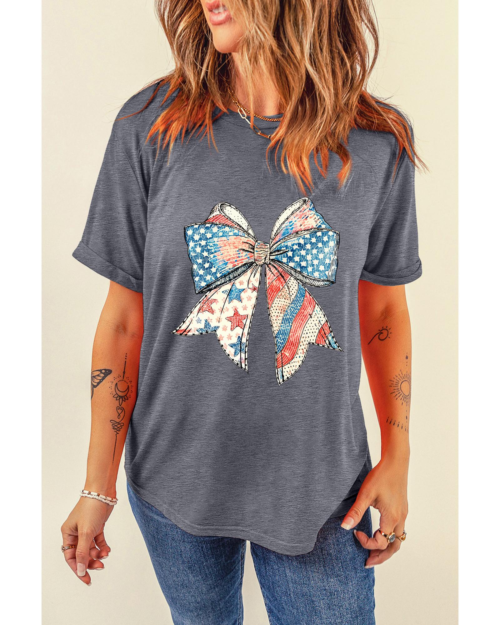Gray US Flag Bow Print Round Neck Loose T Shirt – L