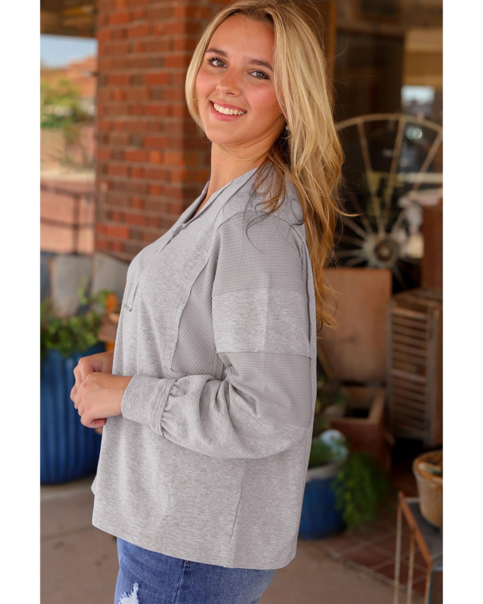 Perfect for casual and relaxed occasions Soft and cozy waffle knit fabric for all - day comfort Buttoned neckline for versatile styling options Unique patchwork sleeves for a trendy and eye