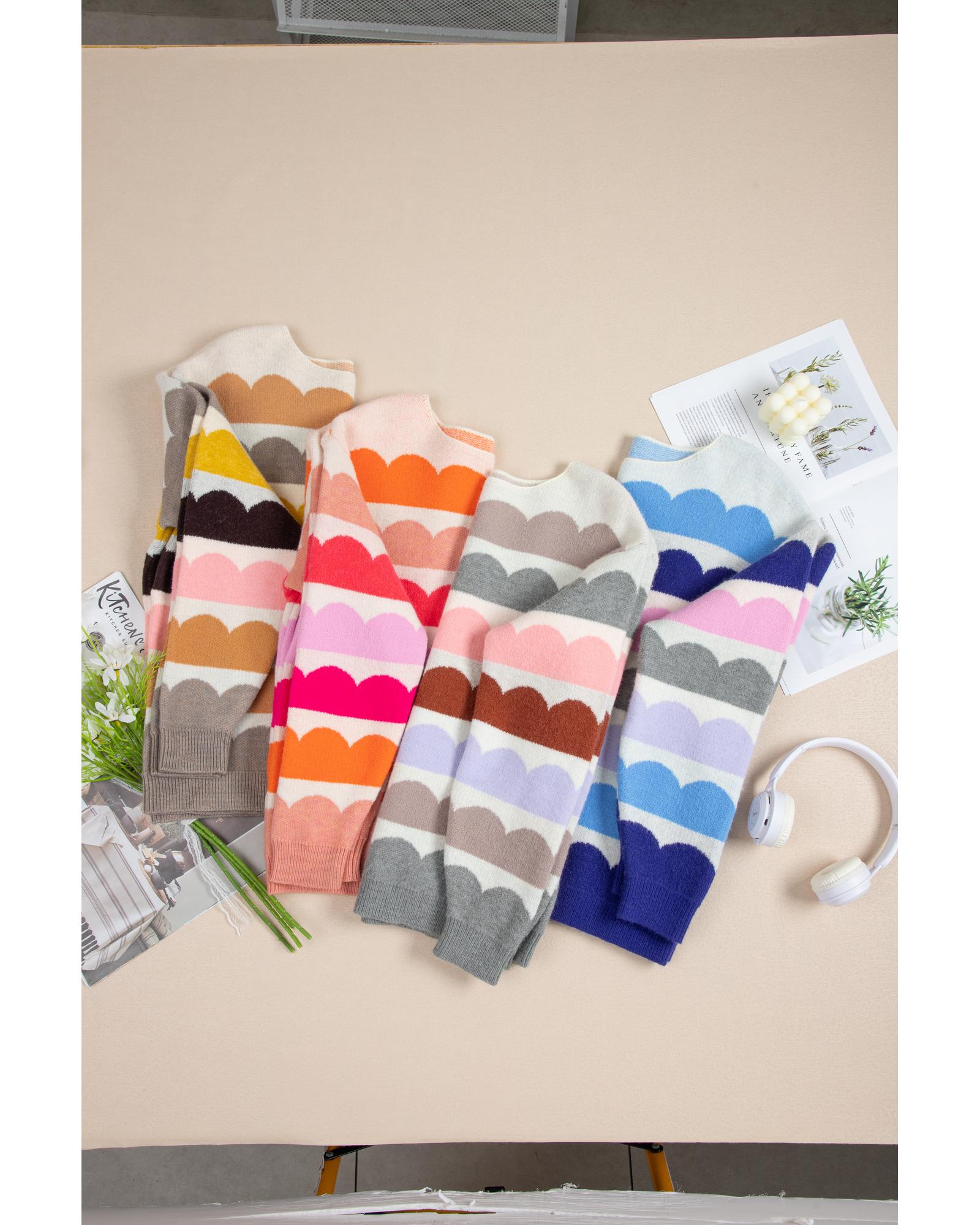 Gray Wave Striped Balloon Sleeve Drop Shoulder Sweater – M