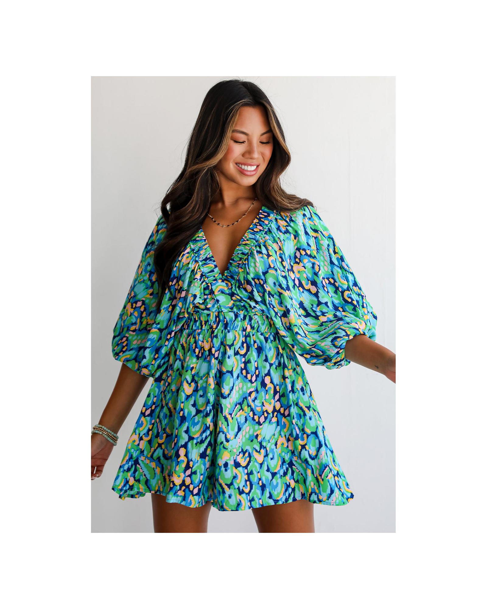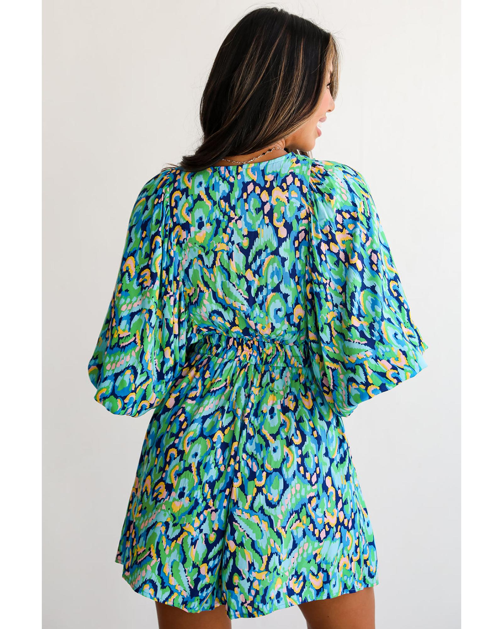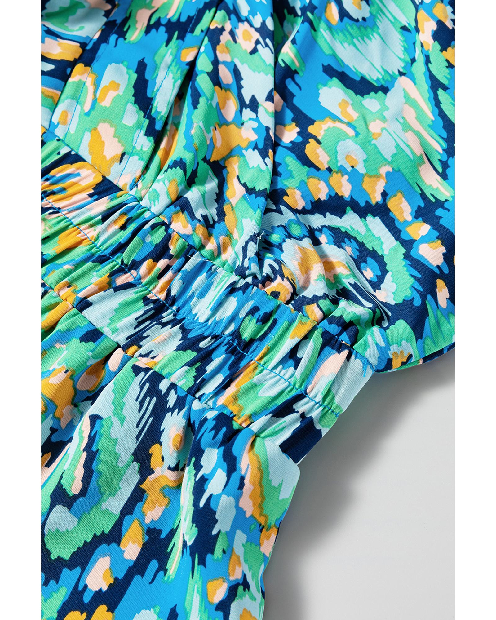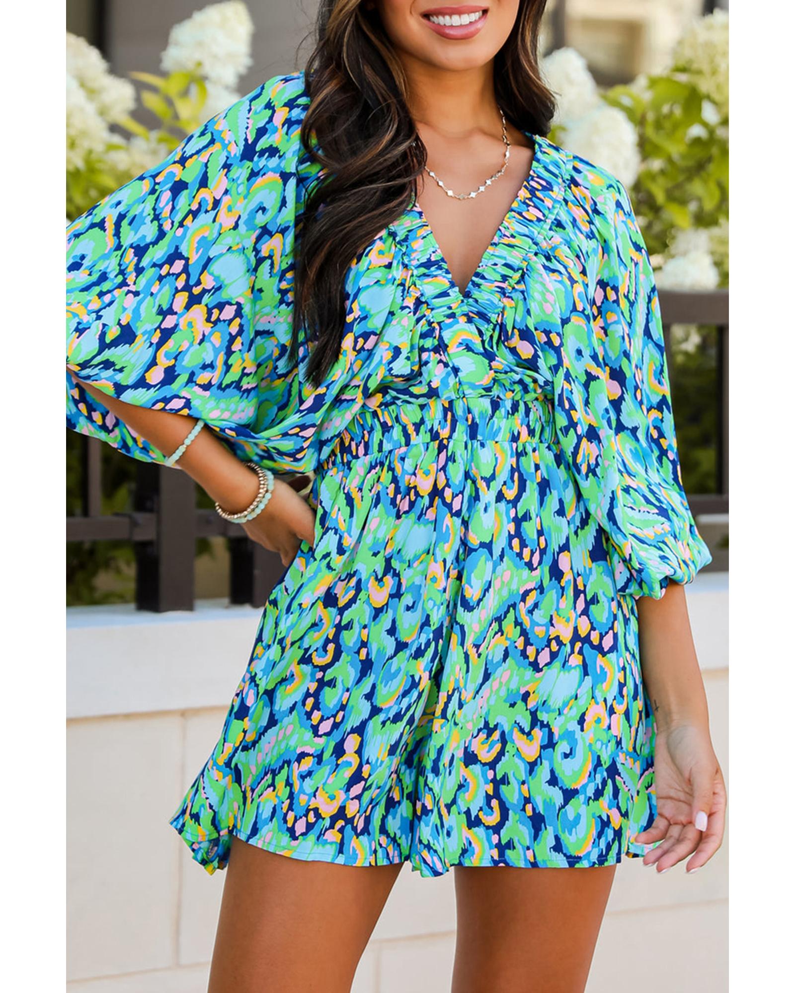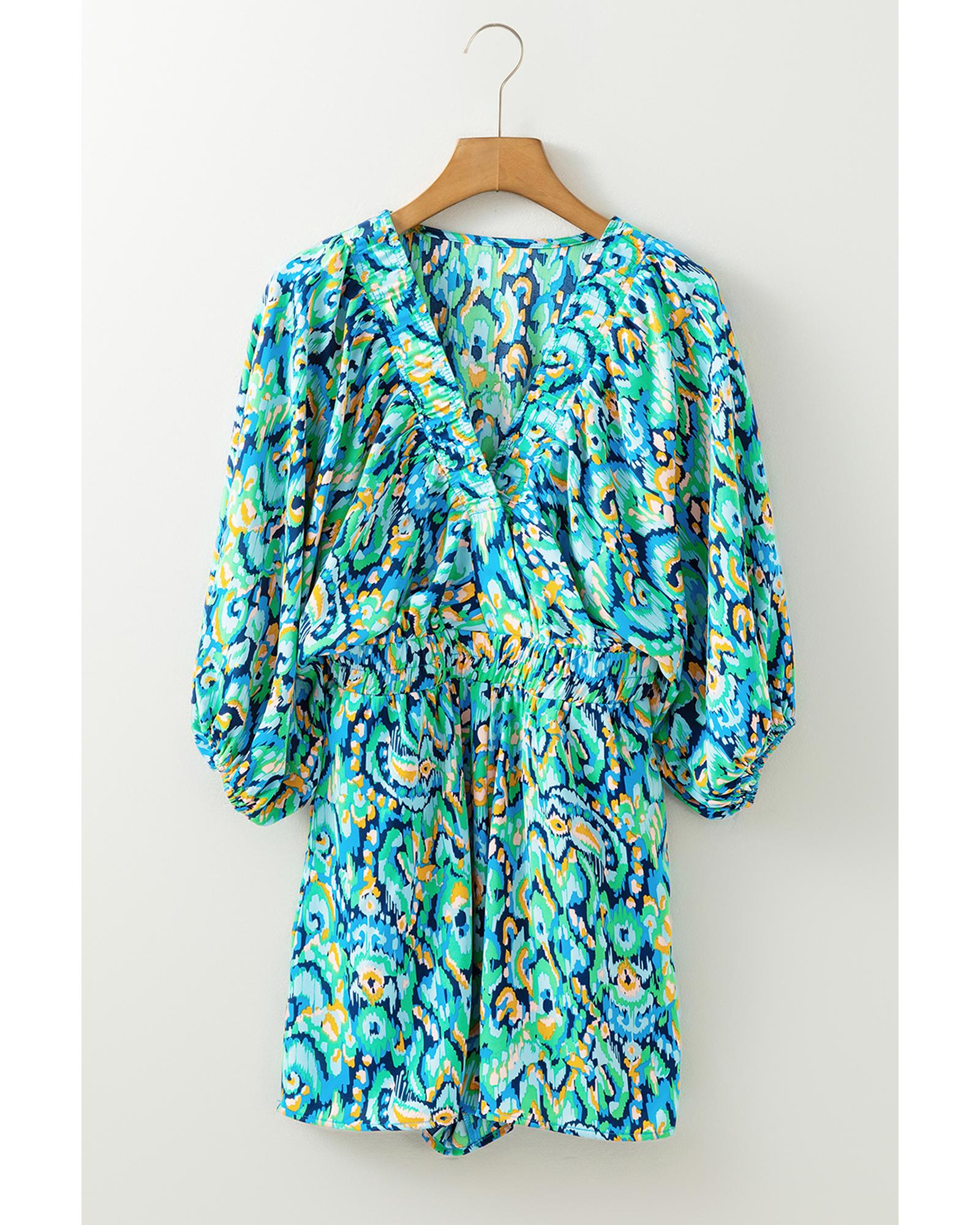 Green Abstract Print Puff Sleeve V Neck High Waist Romper – L