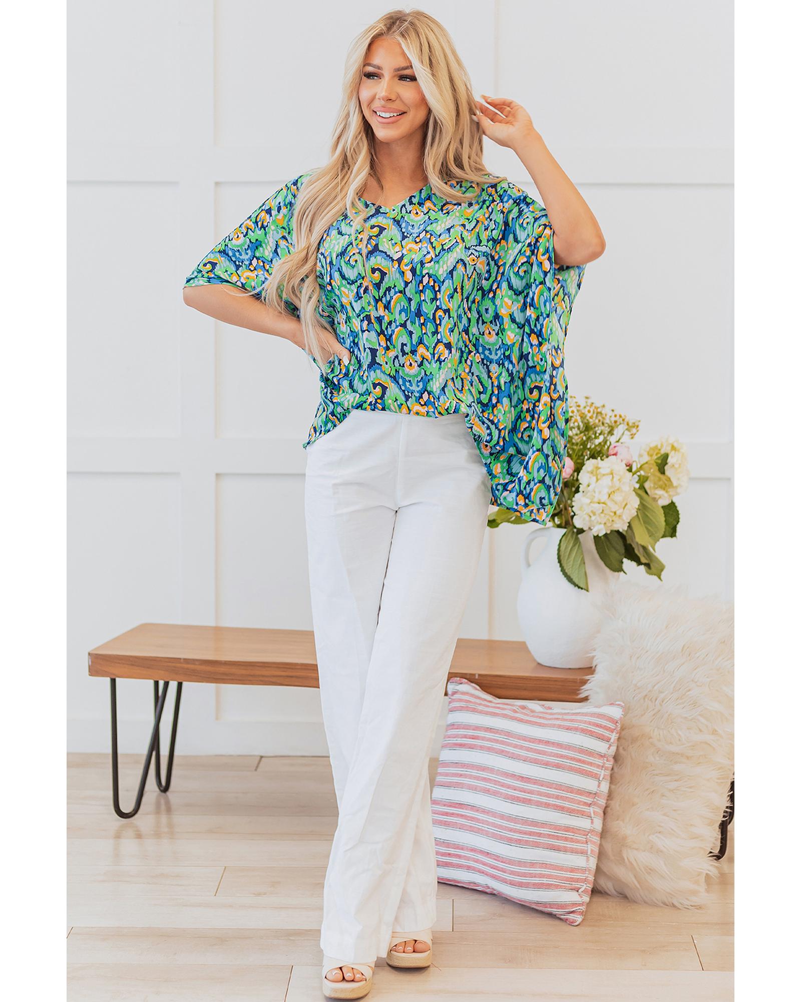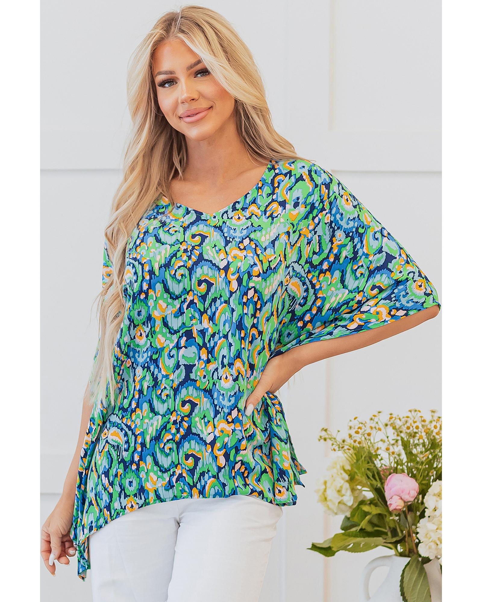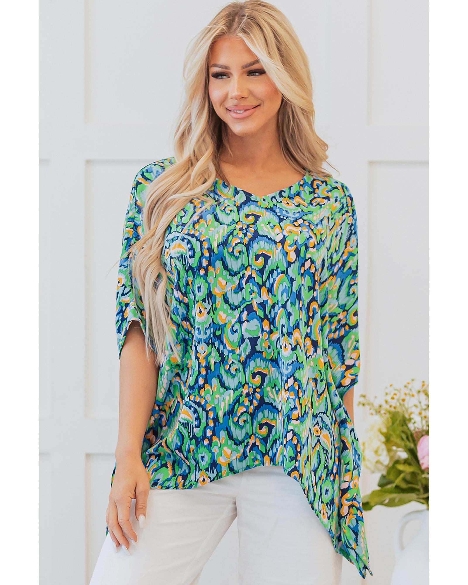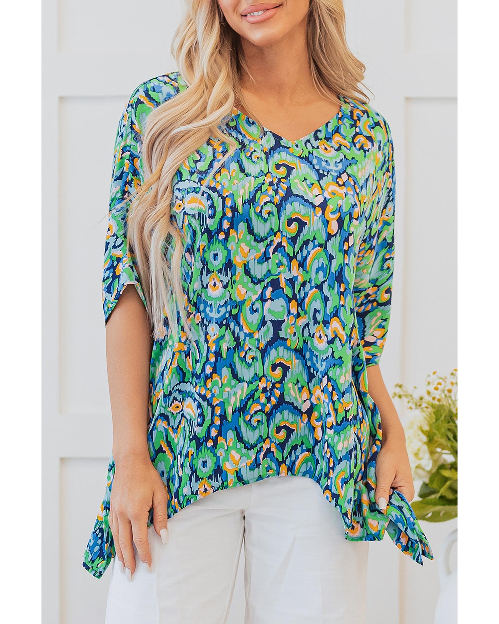 Green Abstract Print V Neck Half Sleeve Loose Fit Tunic Blouse – L