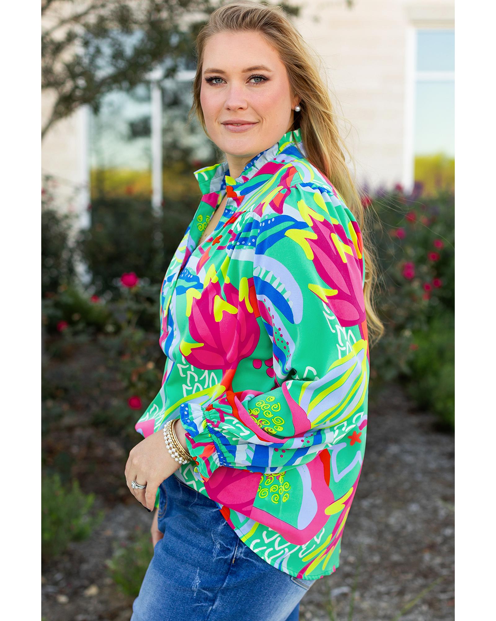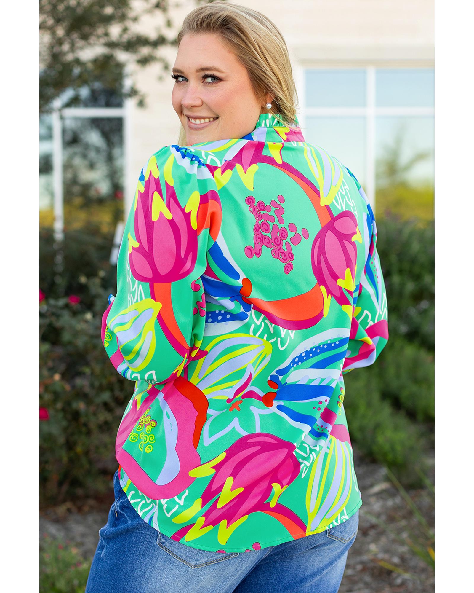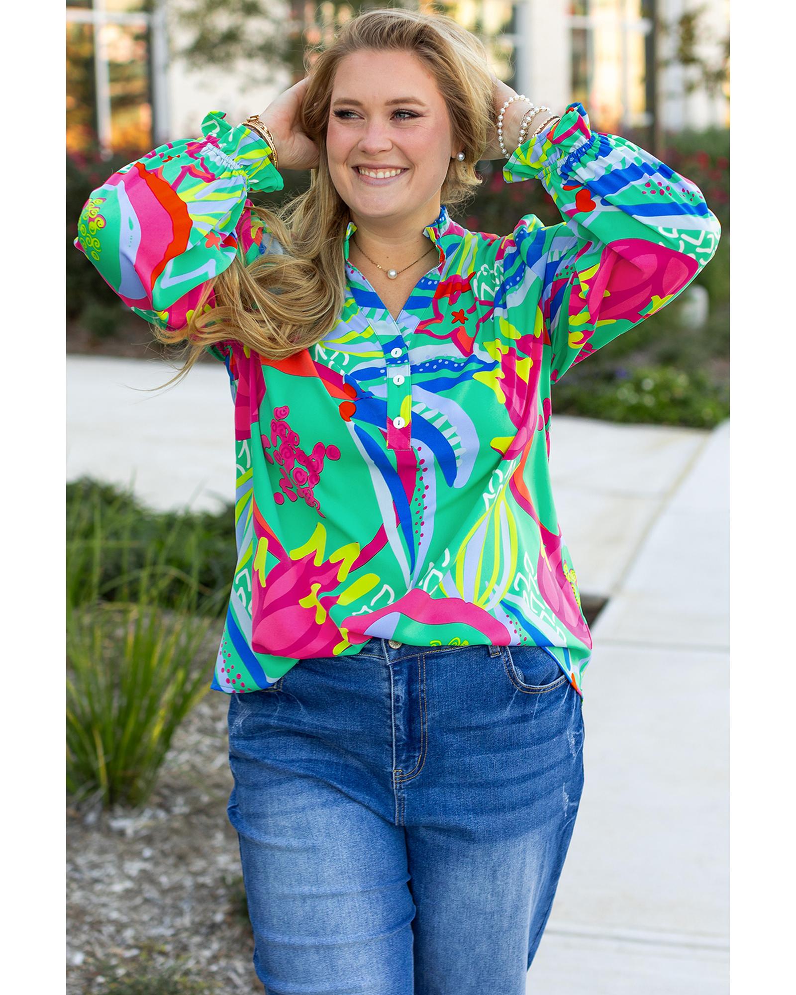 Green Abstract Printed Flounce Sleeve V Neck Buttoned Plus Size Blouse – 3X