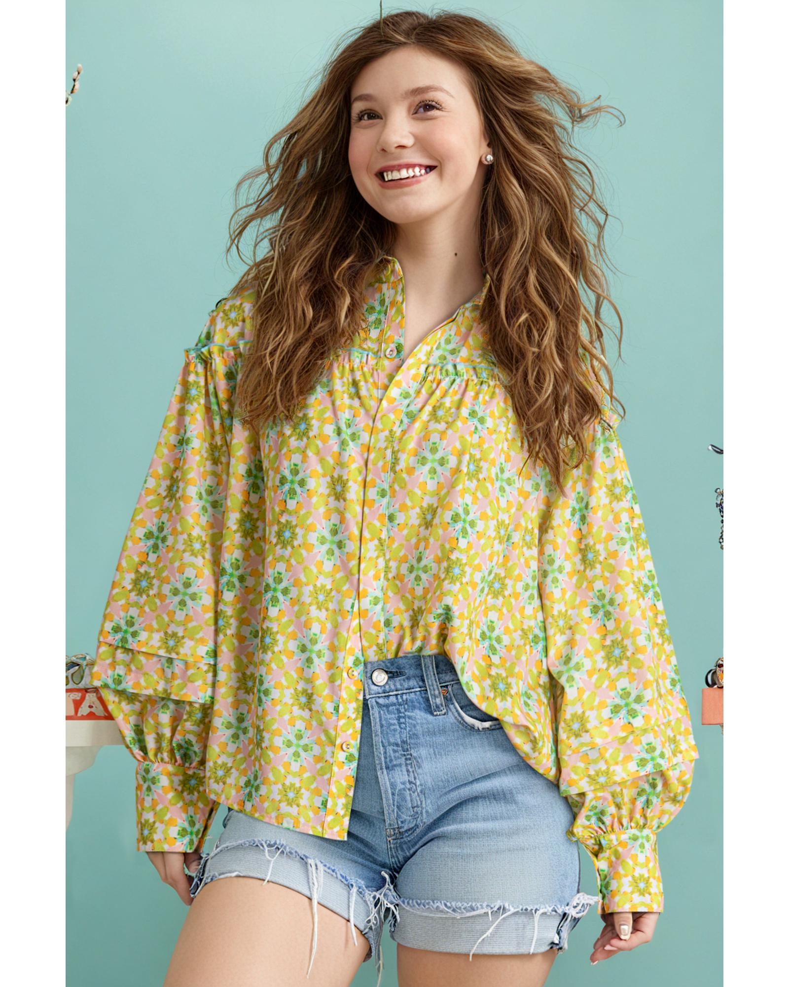 Green Boho Floral Print Frilly Detail Puff Sleeve Shirt – XL