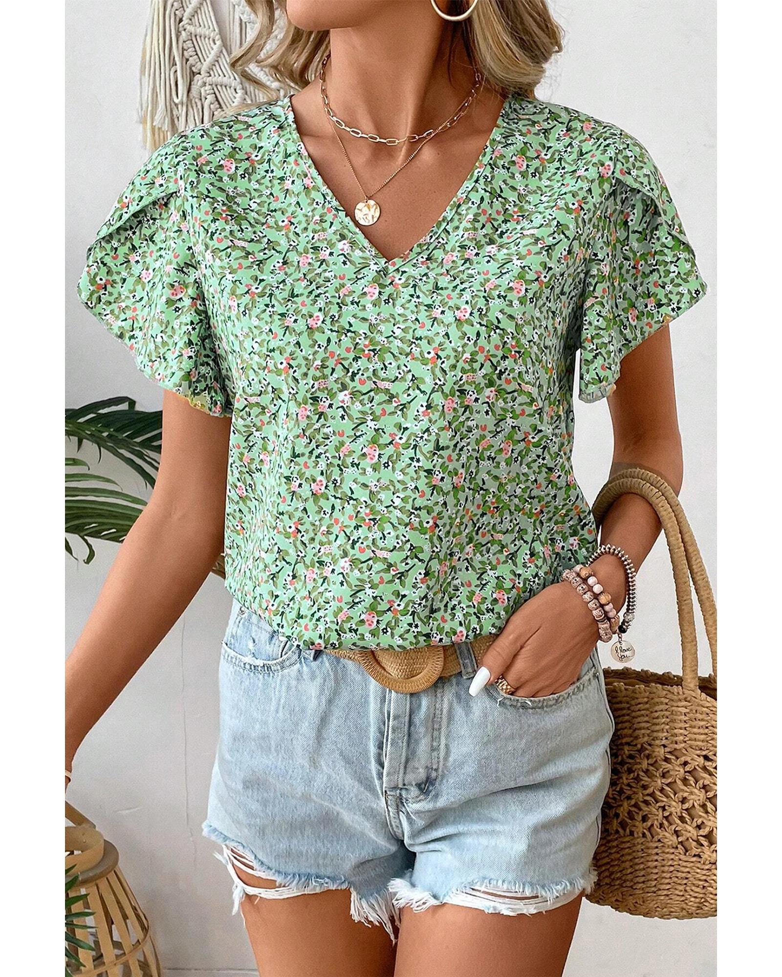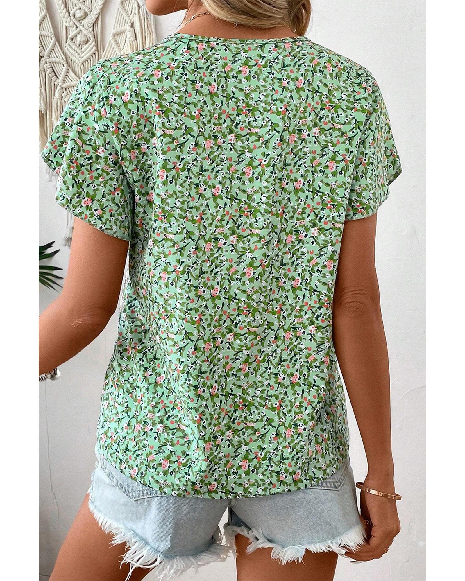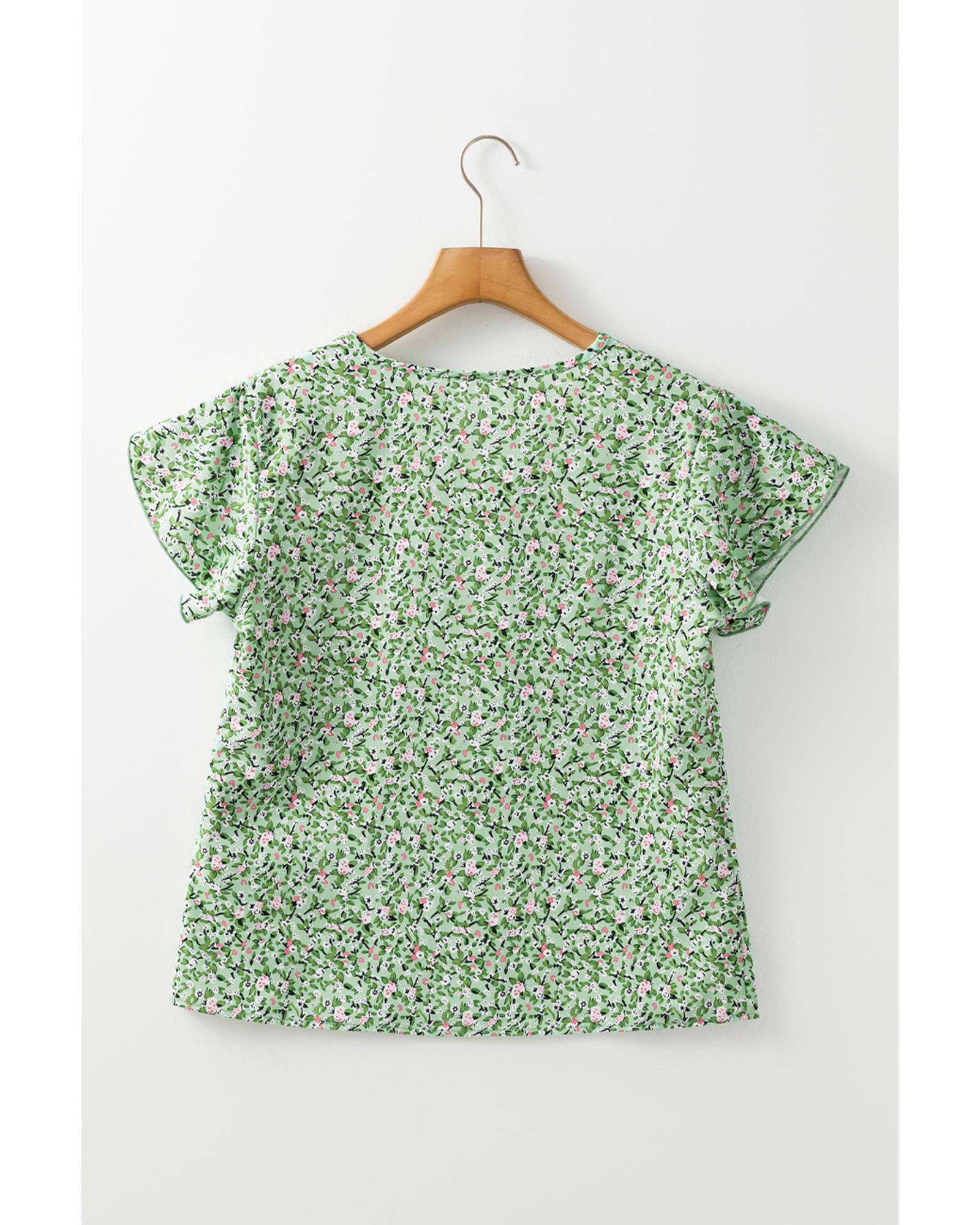 Green Boho Floral V Neck Wrap Short Sleeve Blouse – M