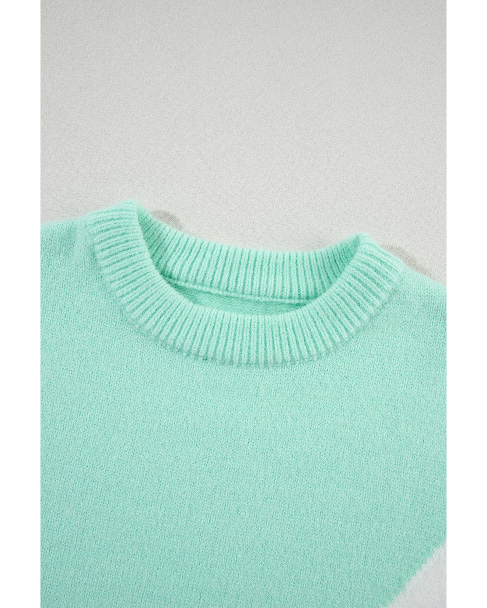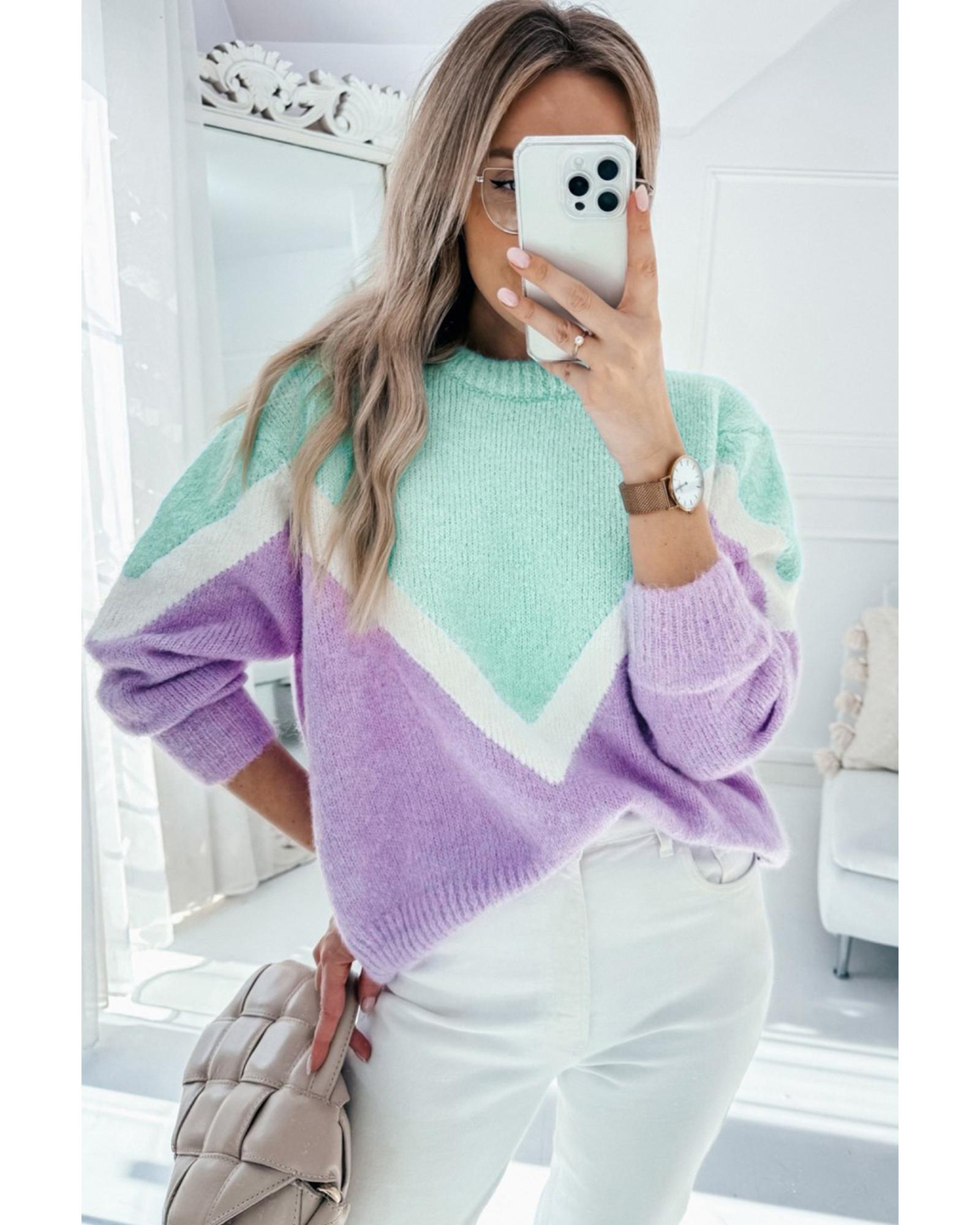 Green Chevron Colorblock Ribbed Knit Drop Shoulder Sweater – L