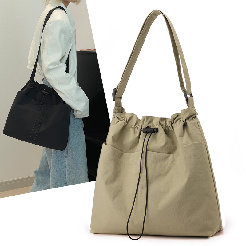Green Chic Lightweight Nylon Drawstring Tote Bag – Multi-Pocket Casual Shoulder & Crossbody