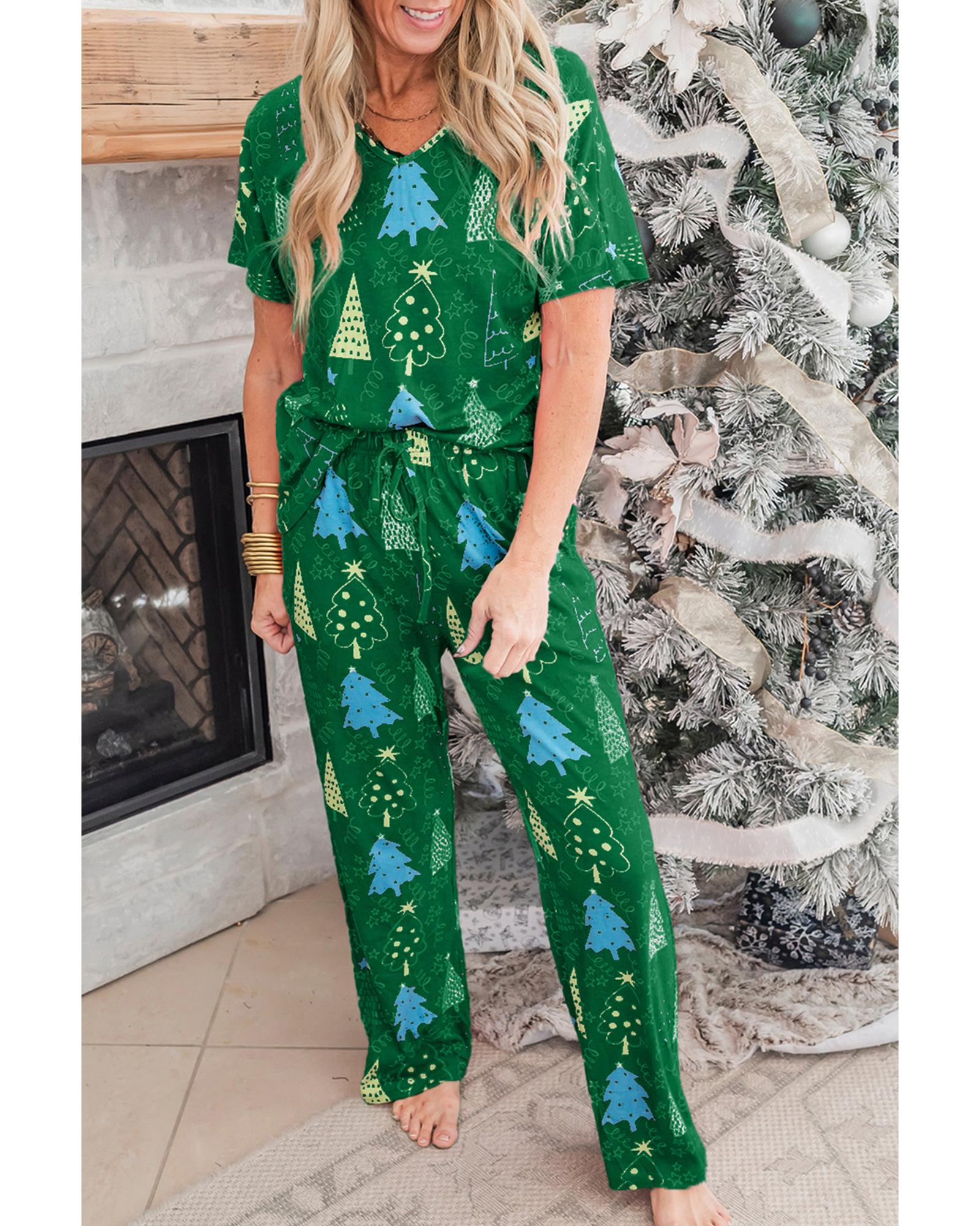 • Stylish Green Christmas Tree Print V Neck Tee and Pants Lounge Set