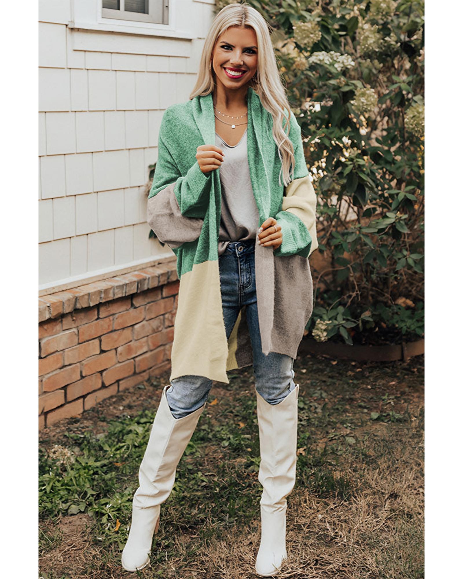 Green Colorblock Draped Open Front Chunky Cardigan – M