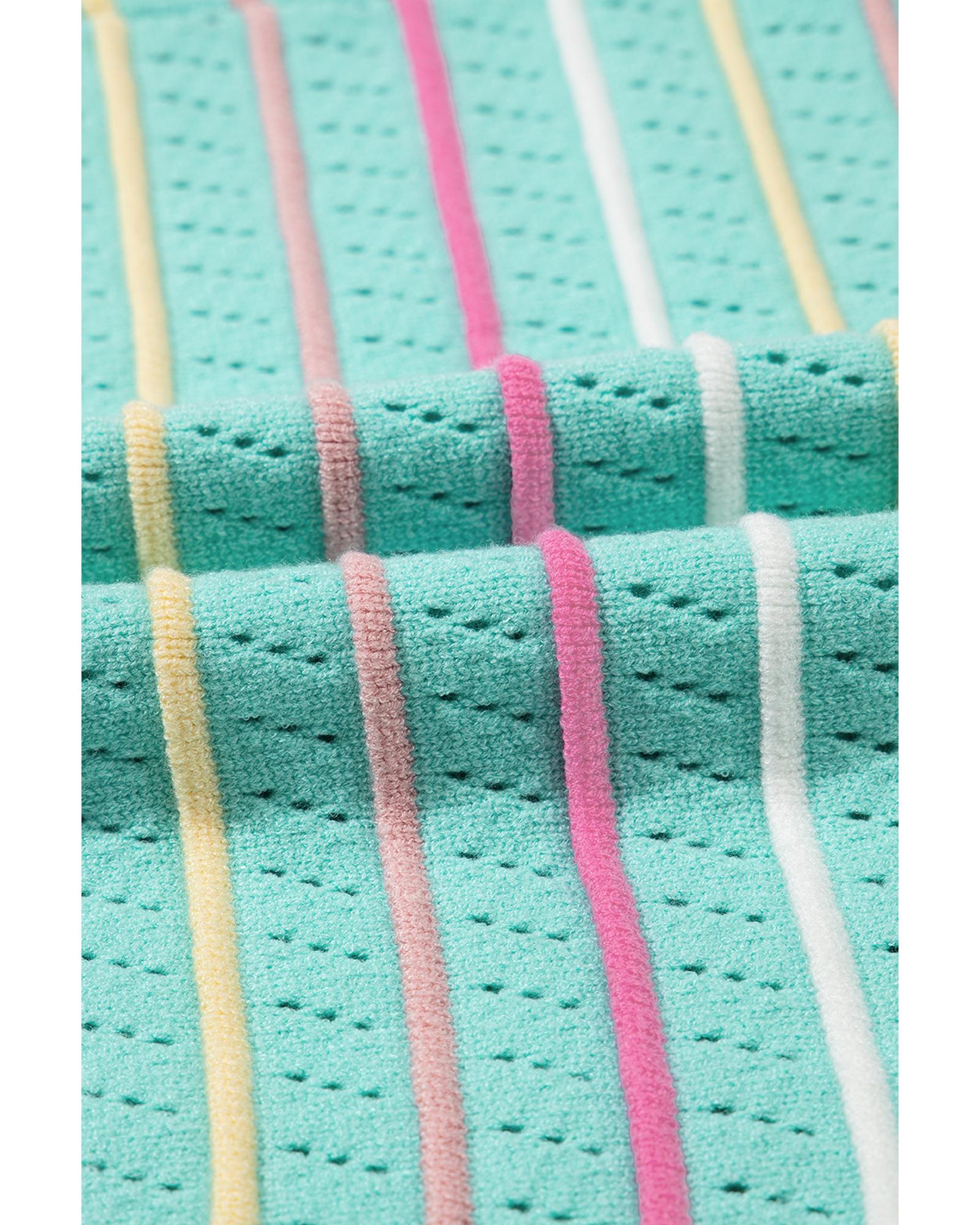 Green Colorful Striped Eyelet Knit Ruffled Sleeve Sweater T Shirt – L