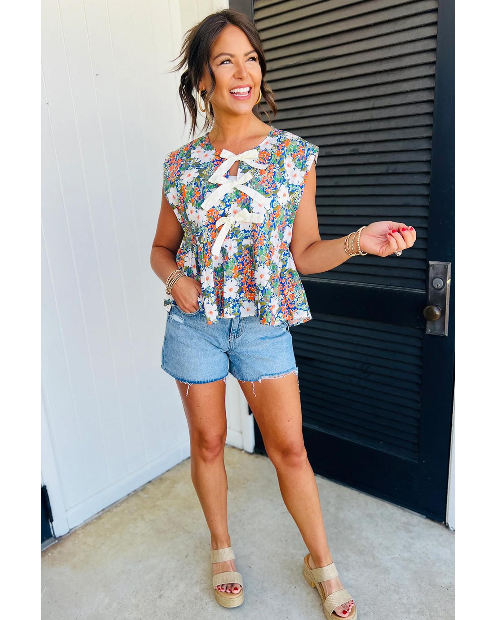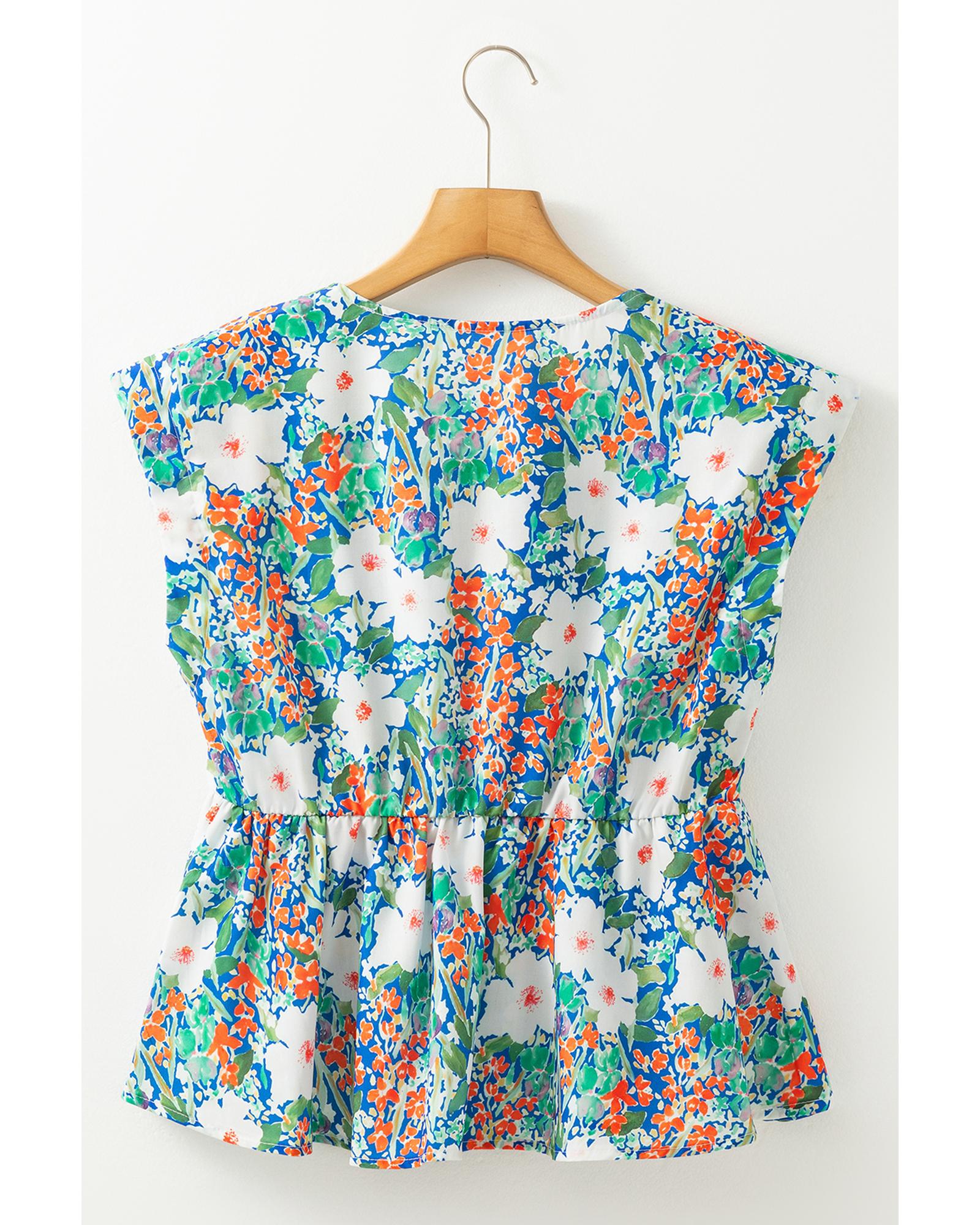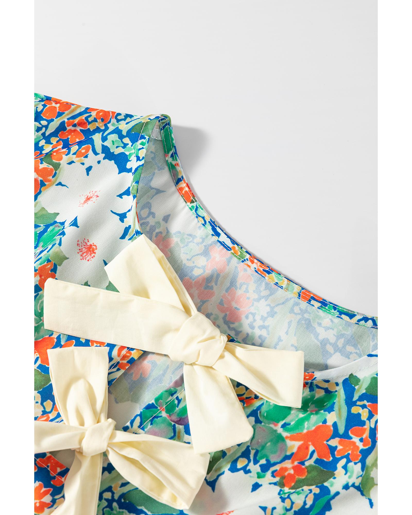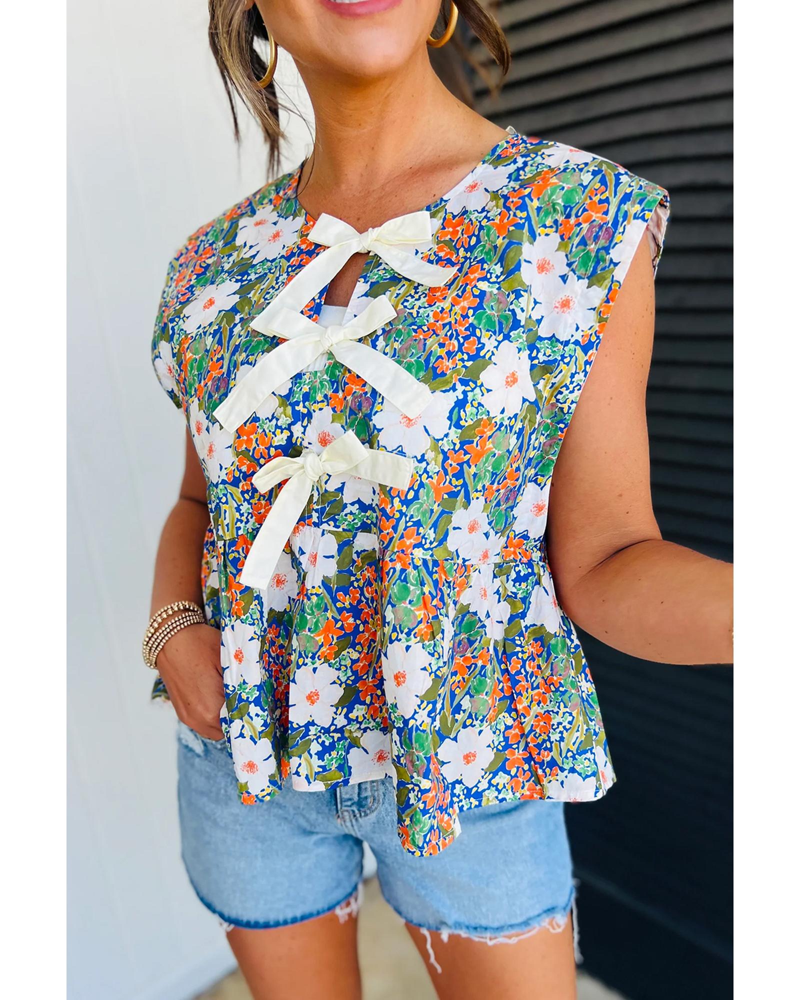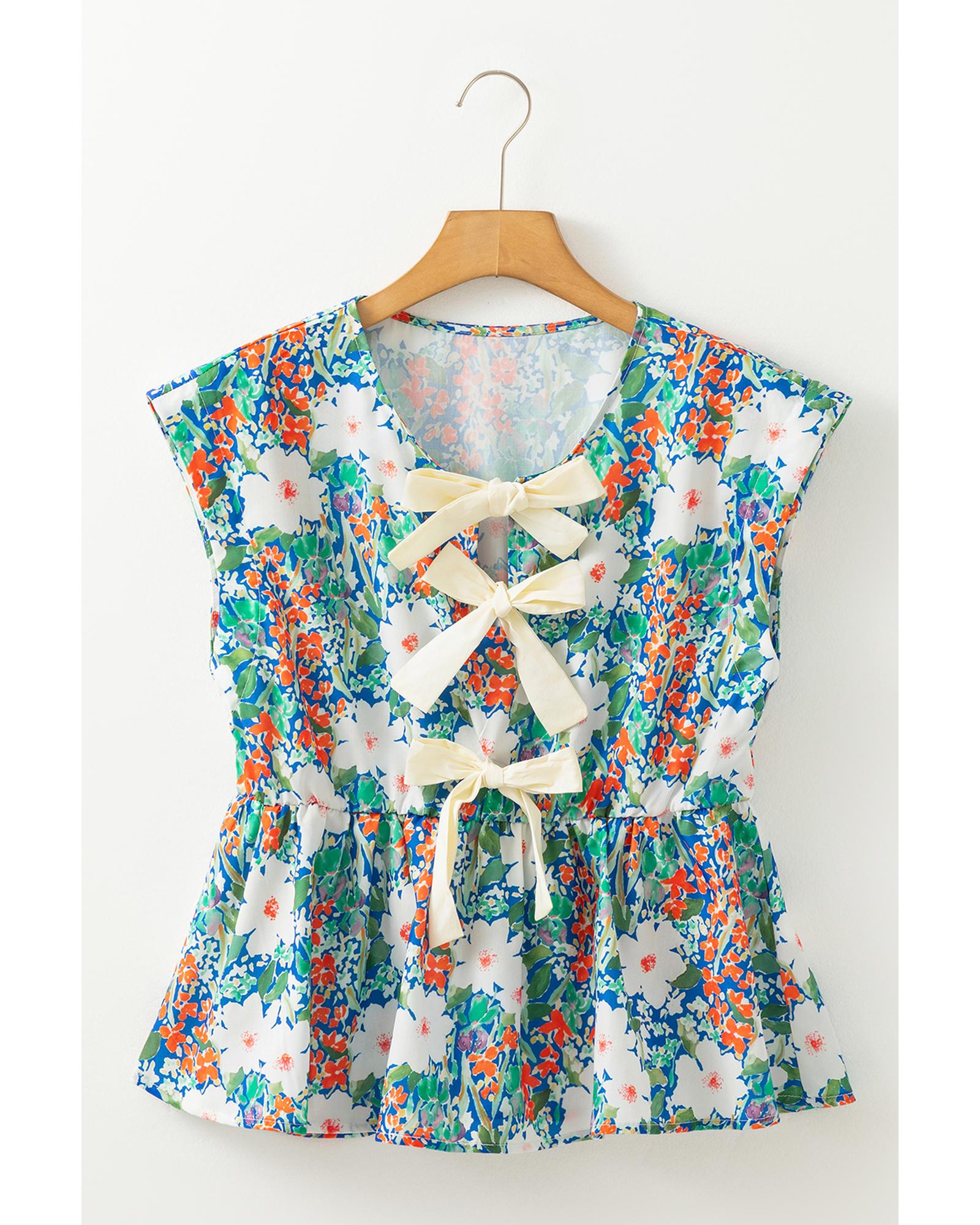 Green Floral Print Bow Applique Slit Sleeveless Peplum Blouse – XL