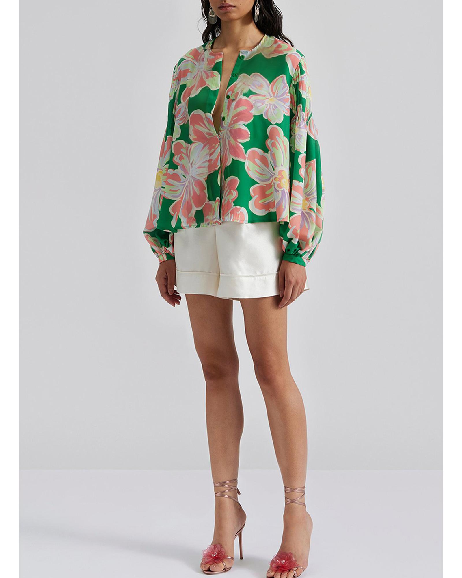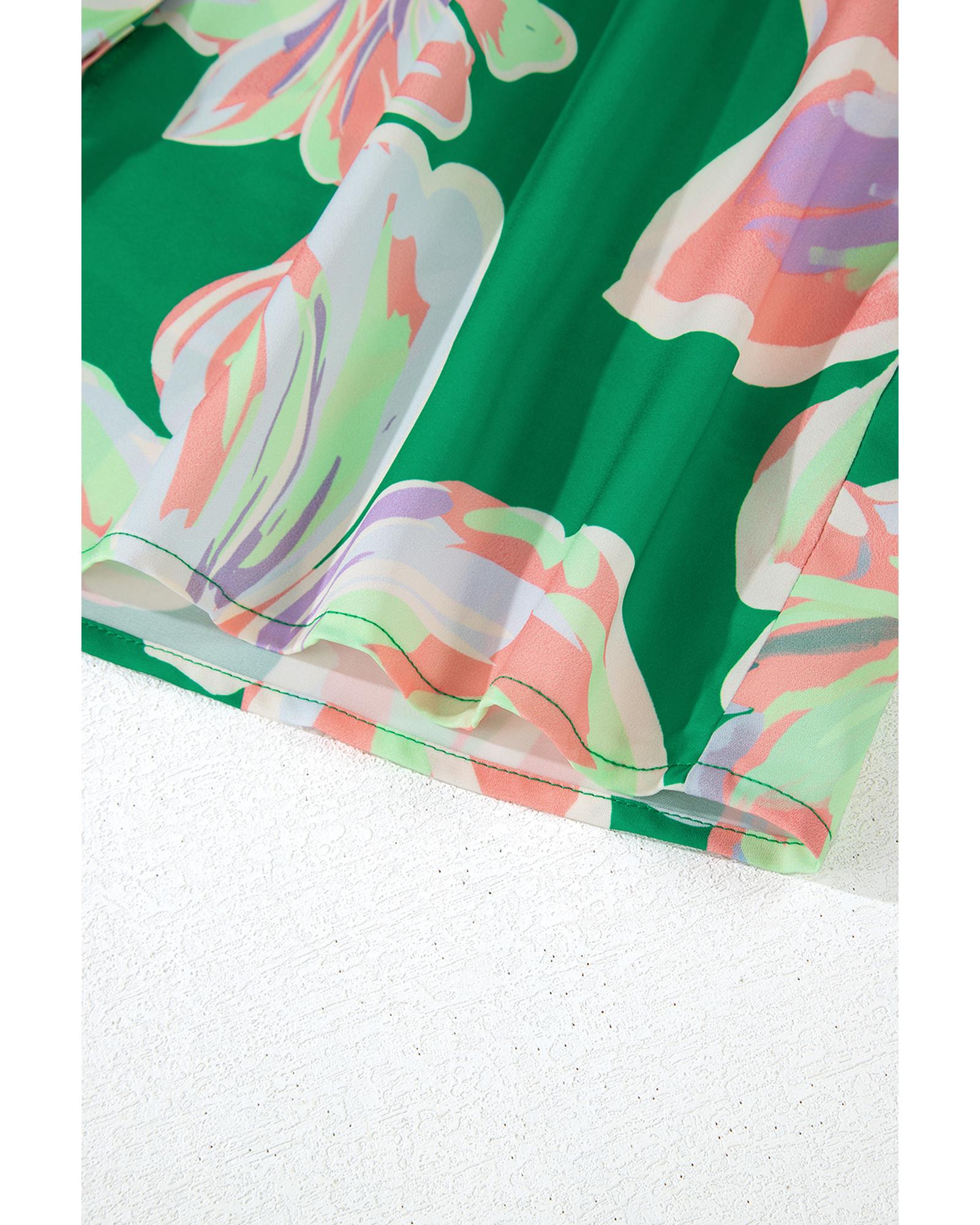 Green Floral Print Button up Pleated Puff Sleeve Loose Shirt – XL