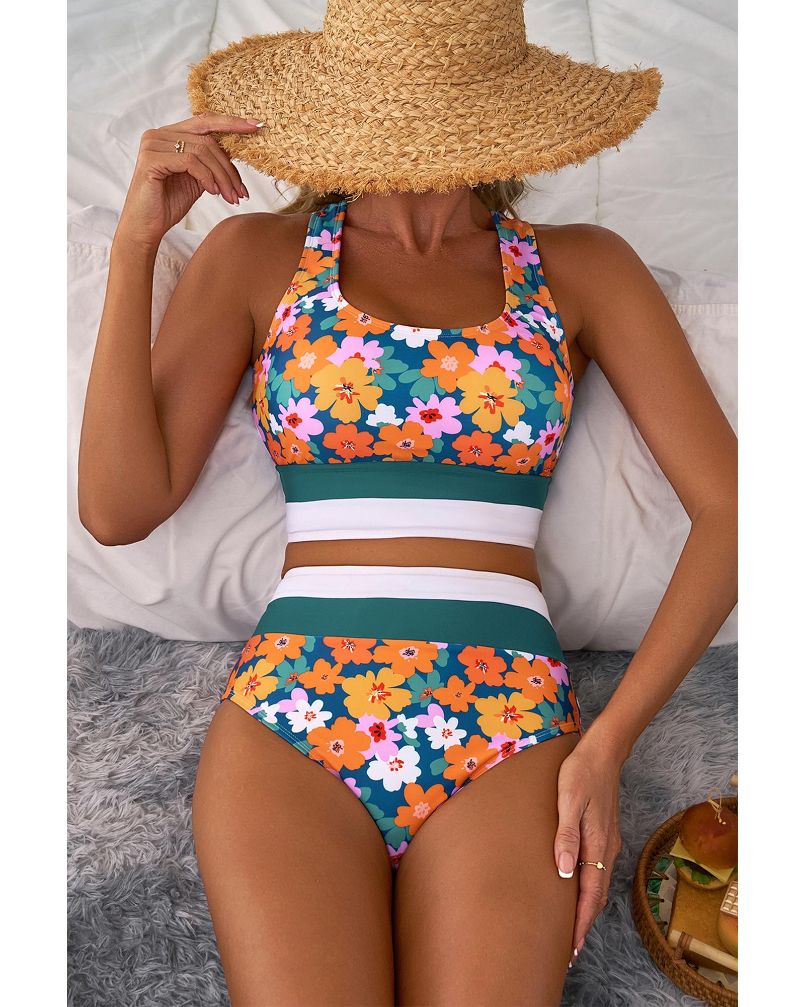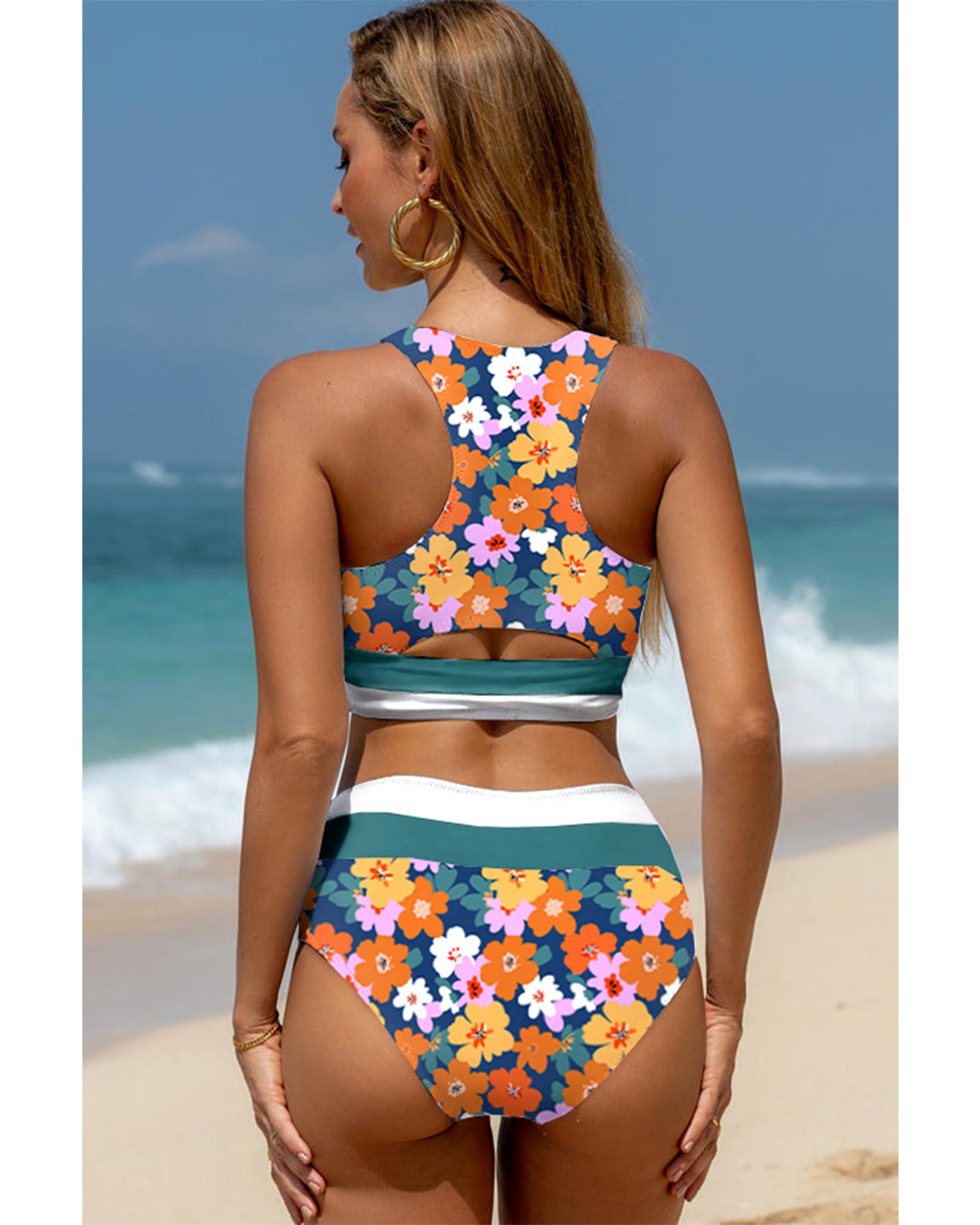 Green Floral Print Racerback Cutout High Waist 2pcs Bikini – L