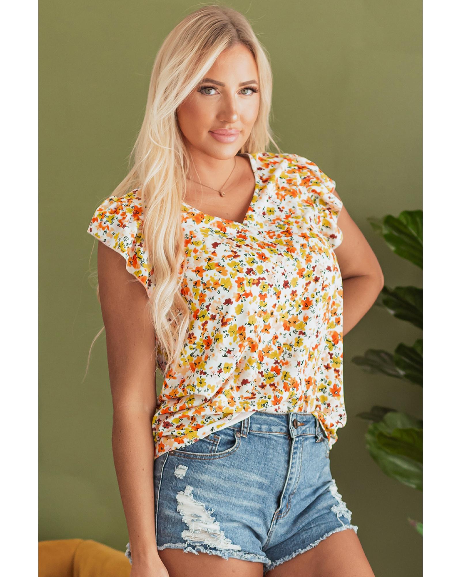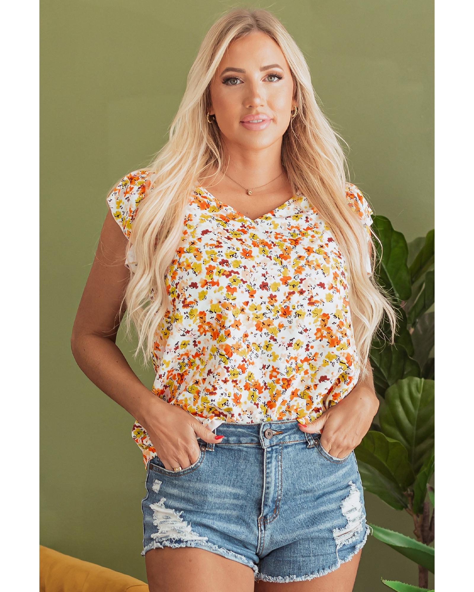 Green Floral Print Ruffled Sleeveless V Neck Tank Top – M