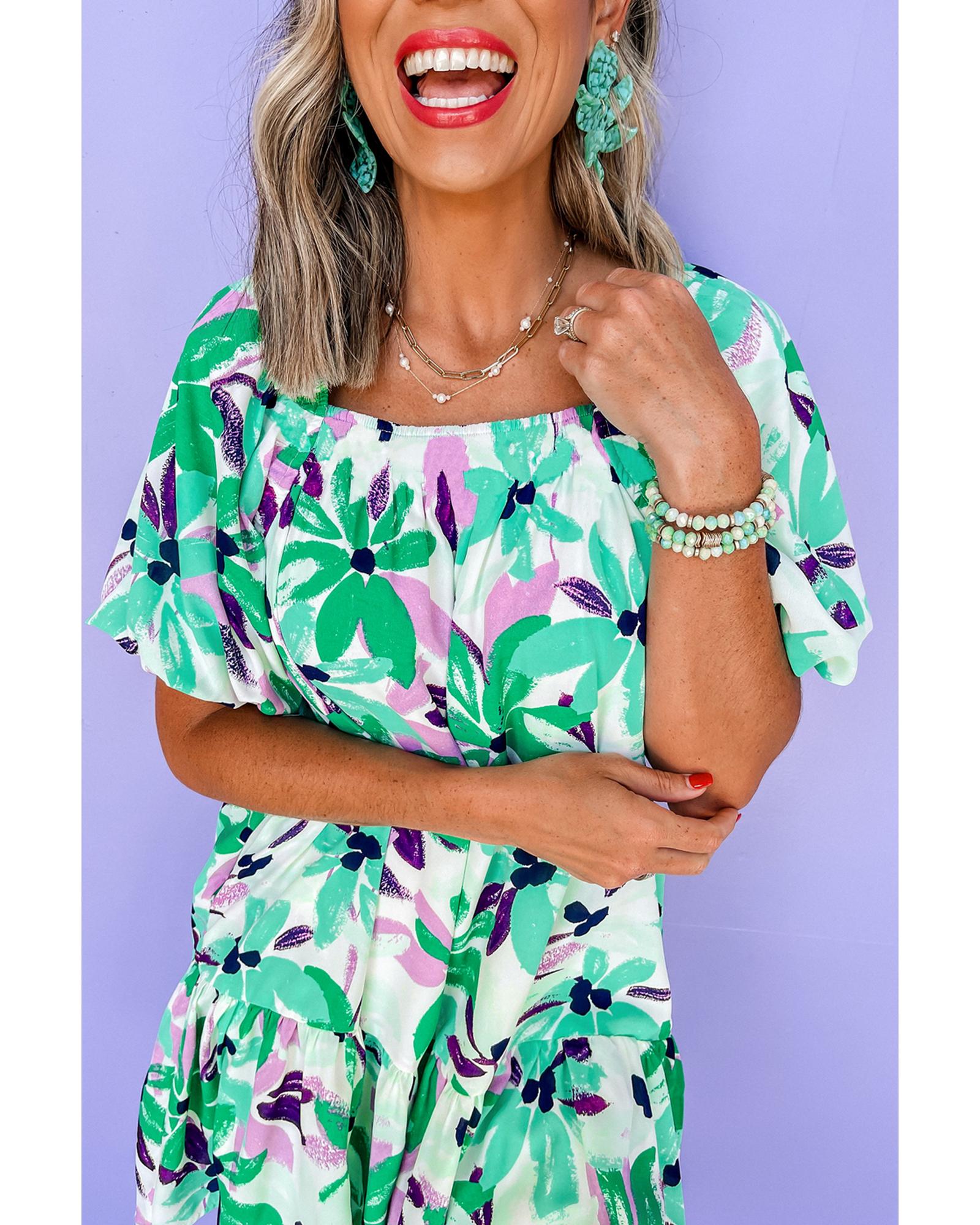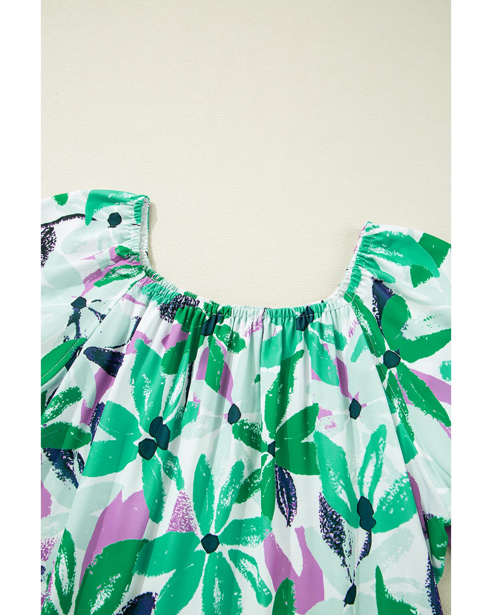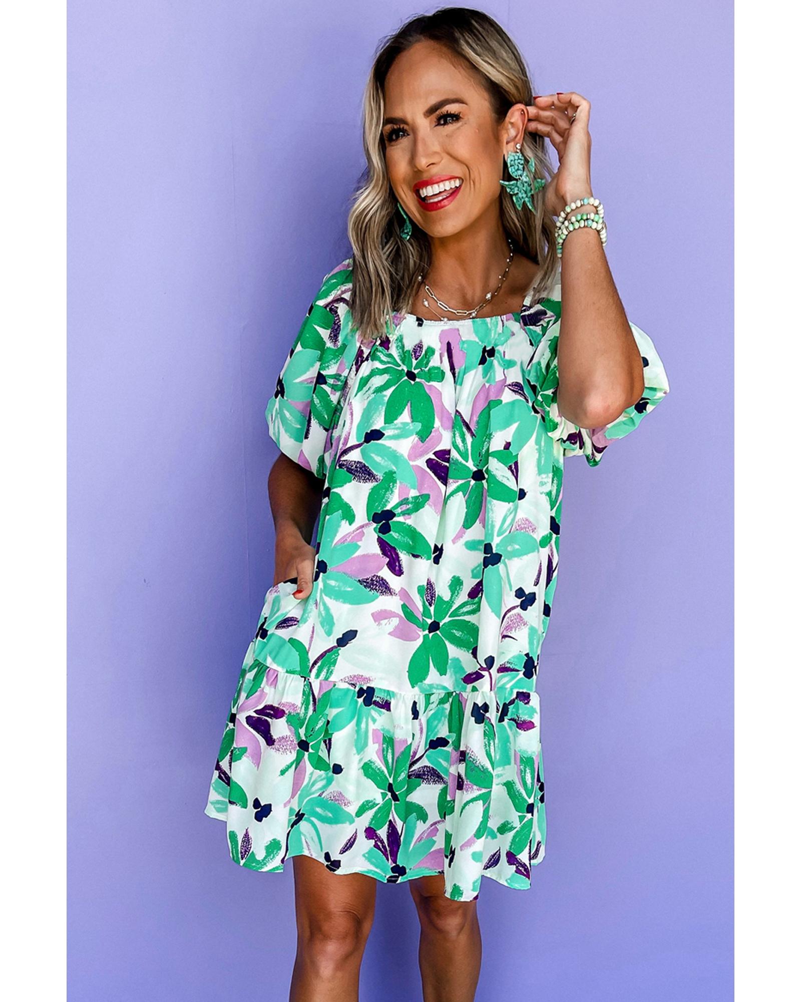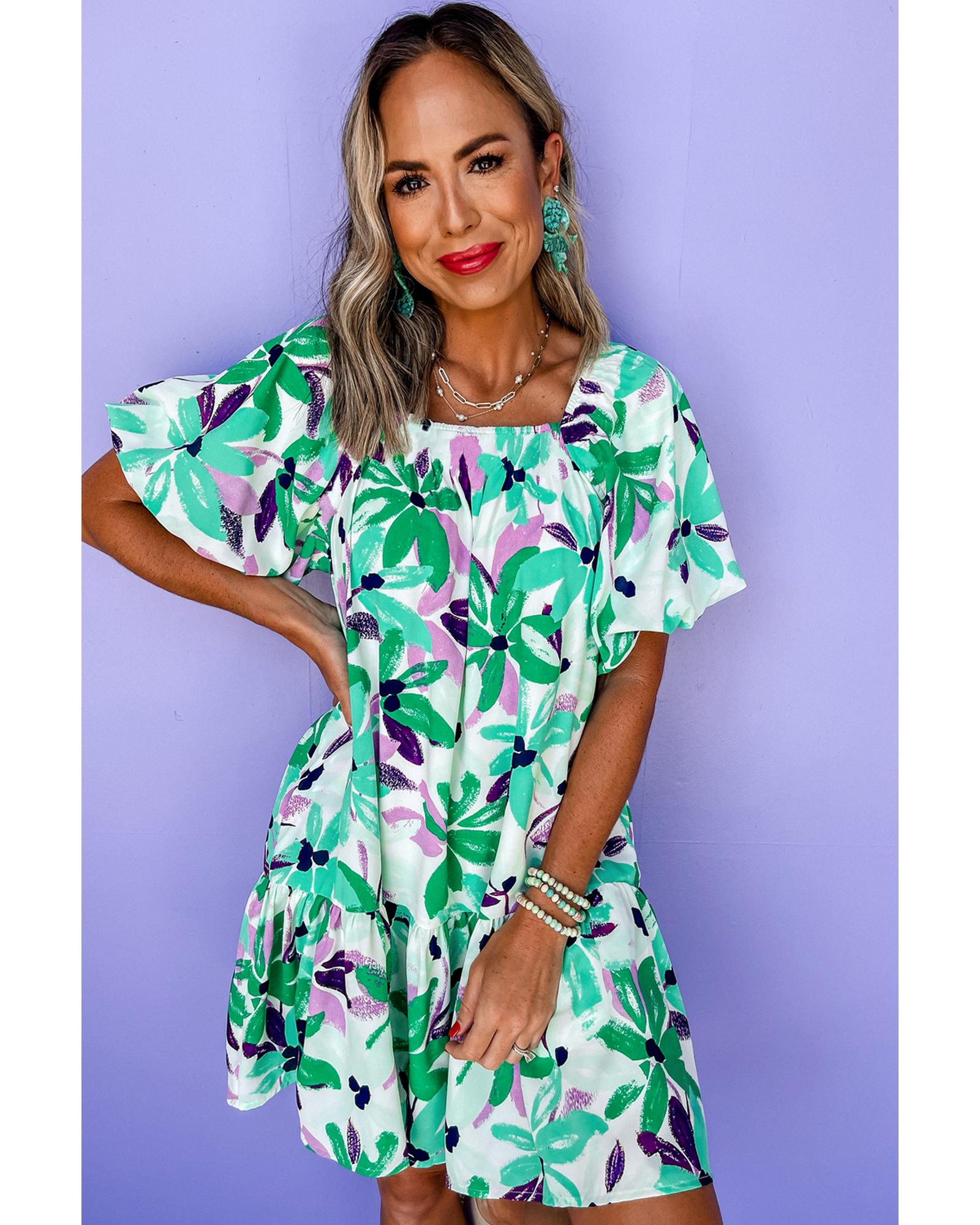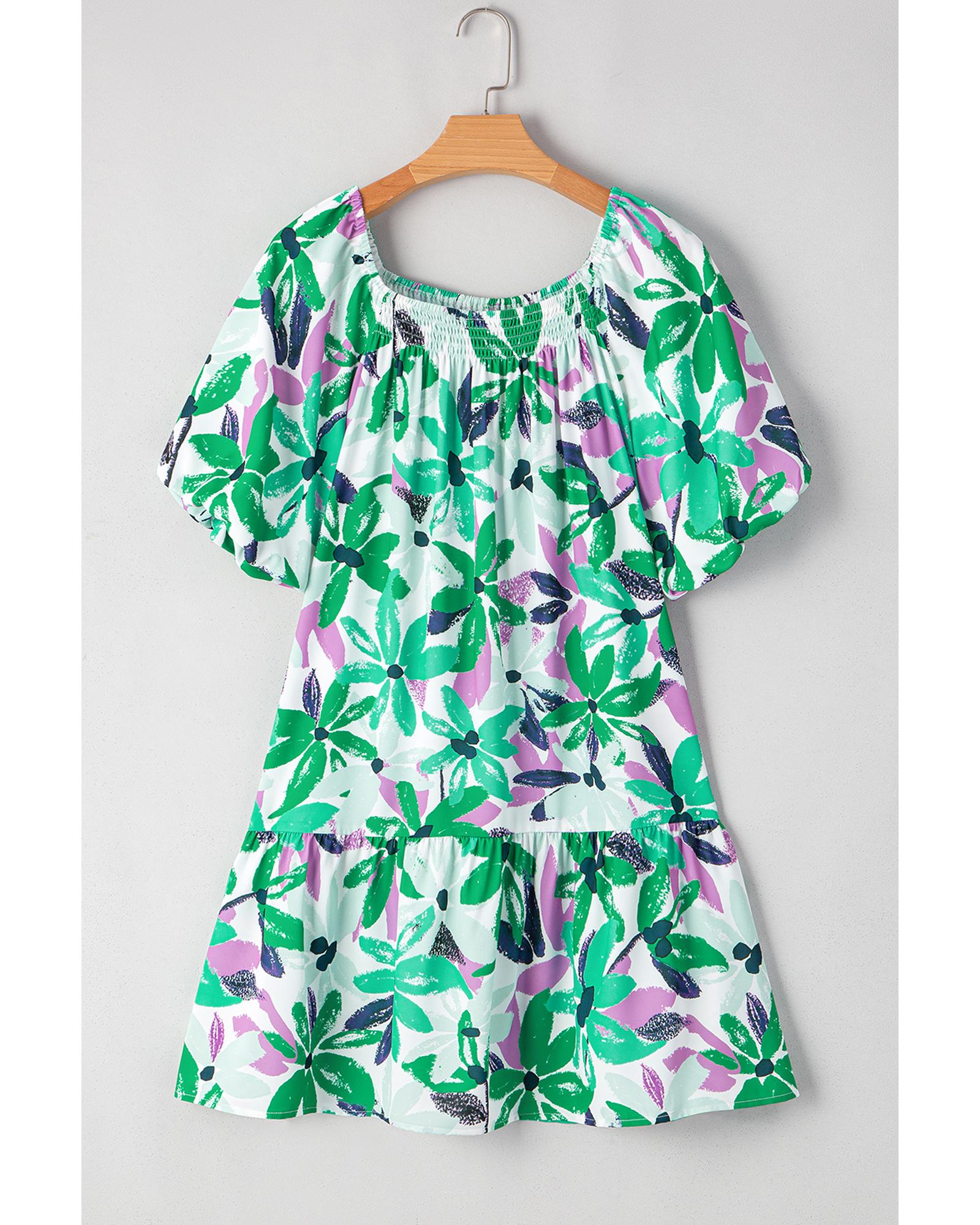 Green Floral Print Shirred Square Neck Loose Fit Mini Dress – M