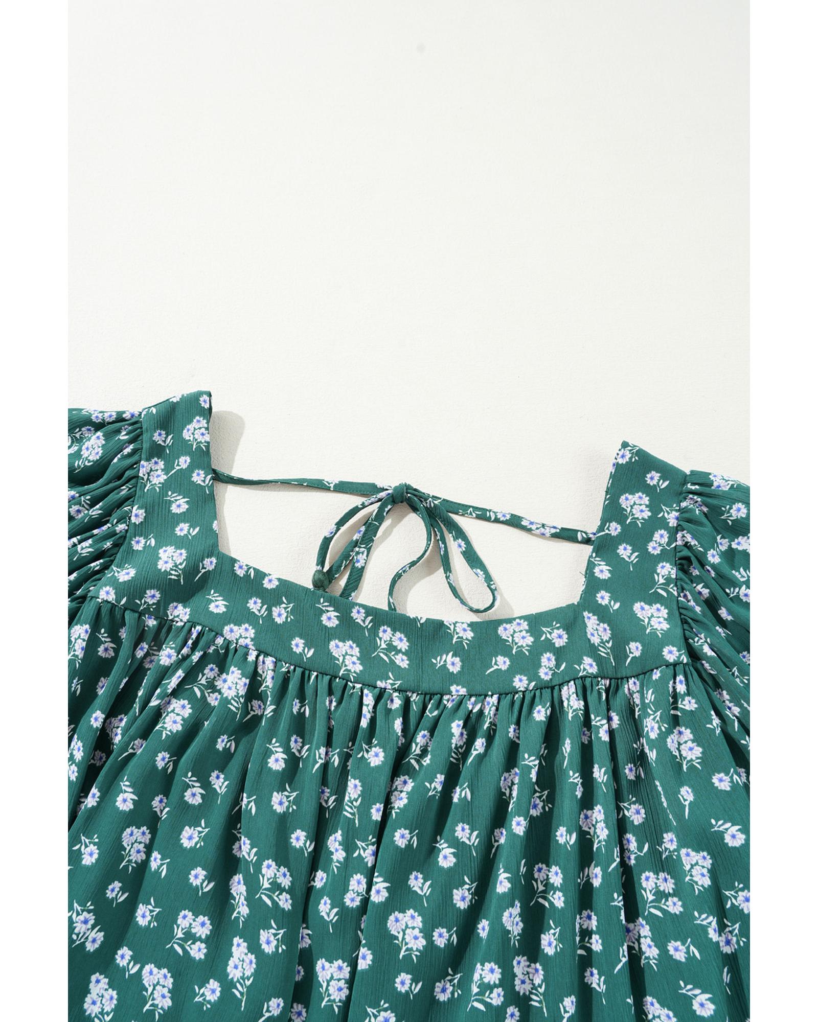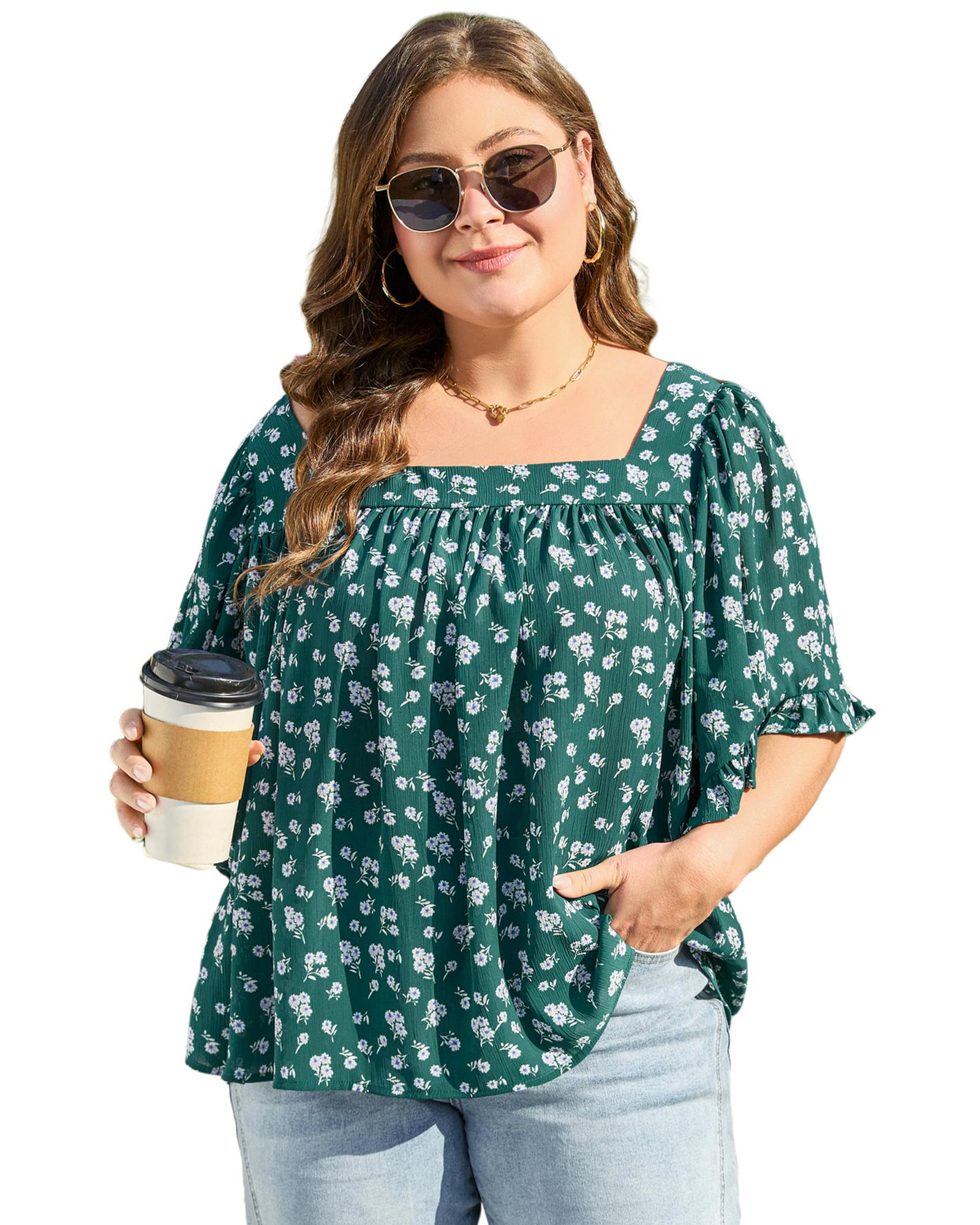 Green Floral Print Square Neck Ruffled Trim Plus Size Blouse – 3X