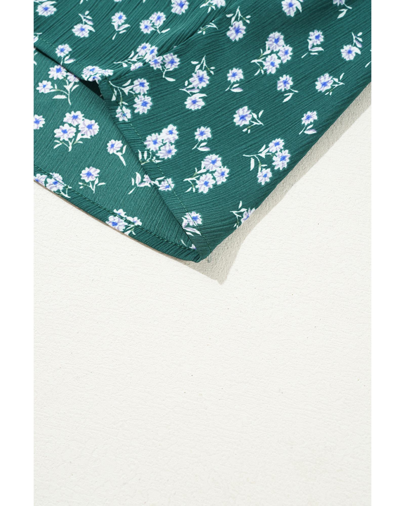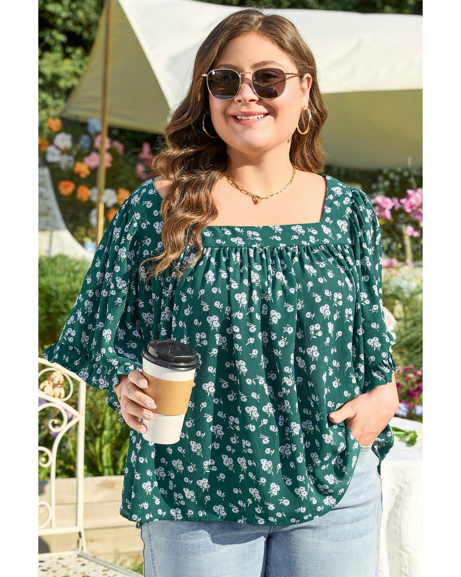 Green Floral Print Square Neck Ruffled Trim Plus Size Blouse – 4X