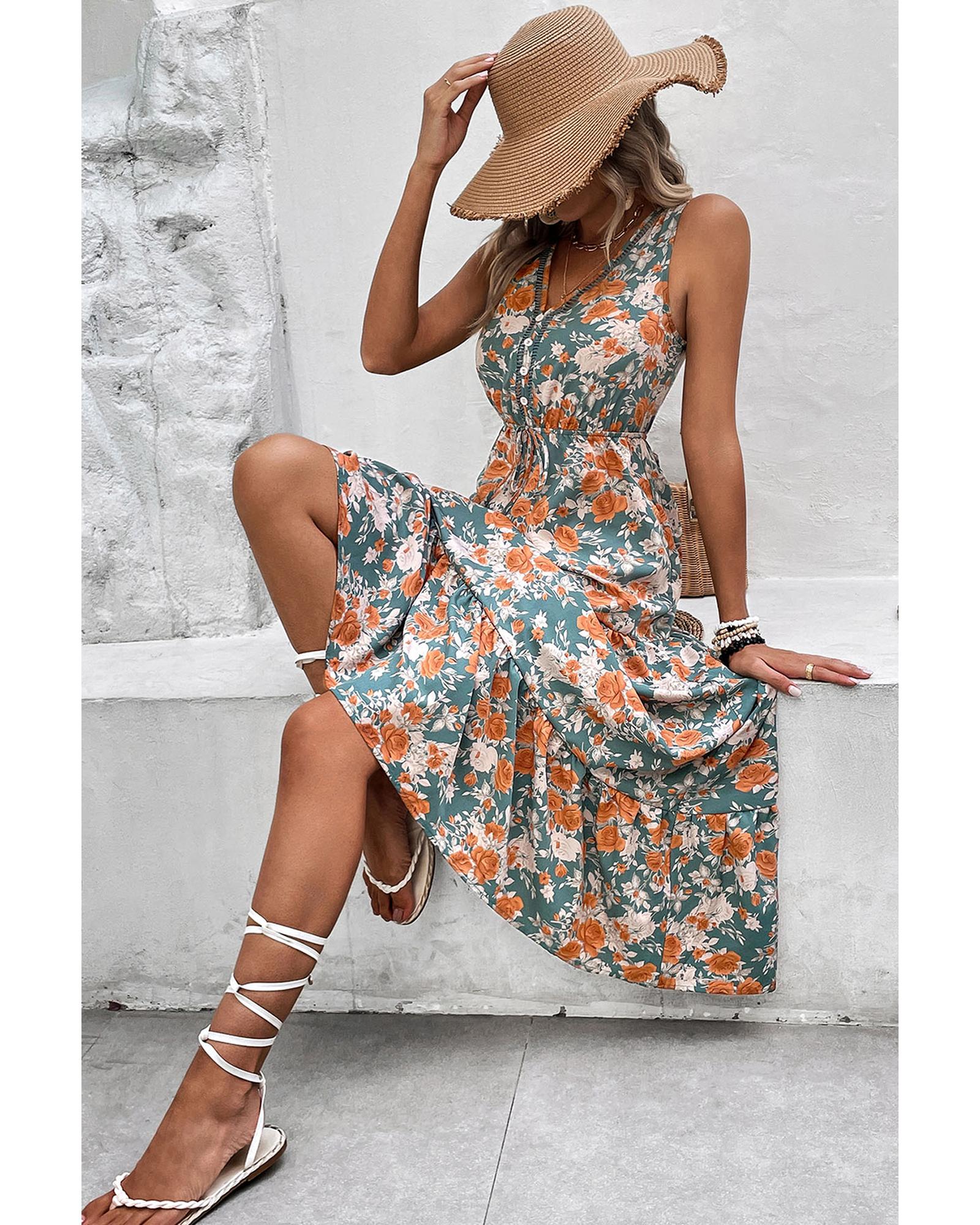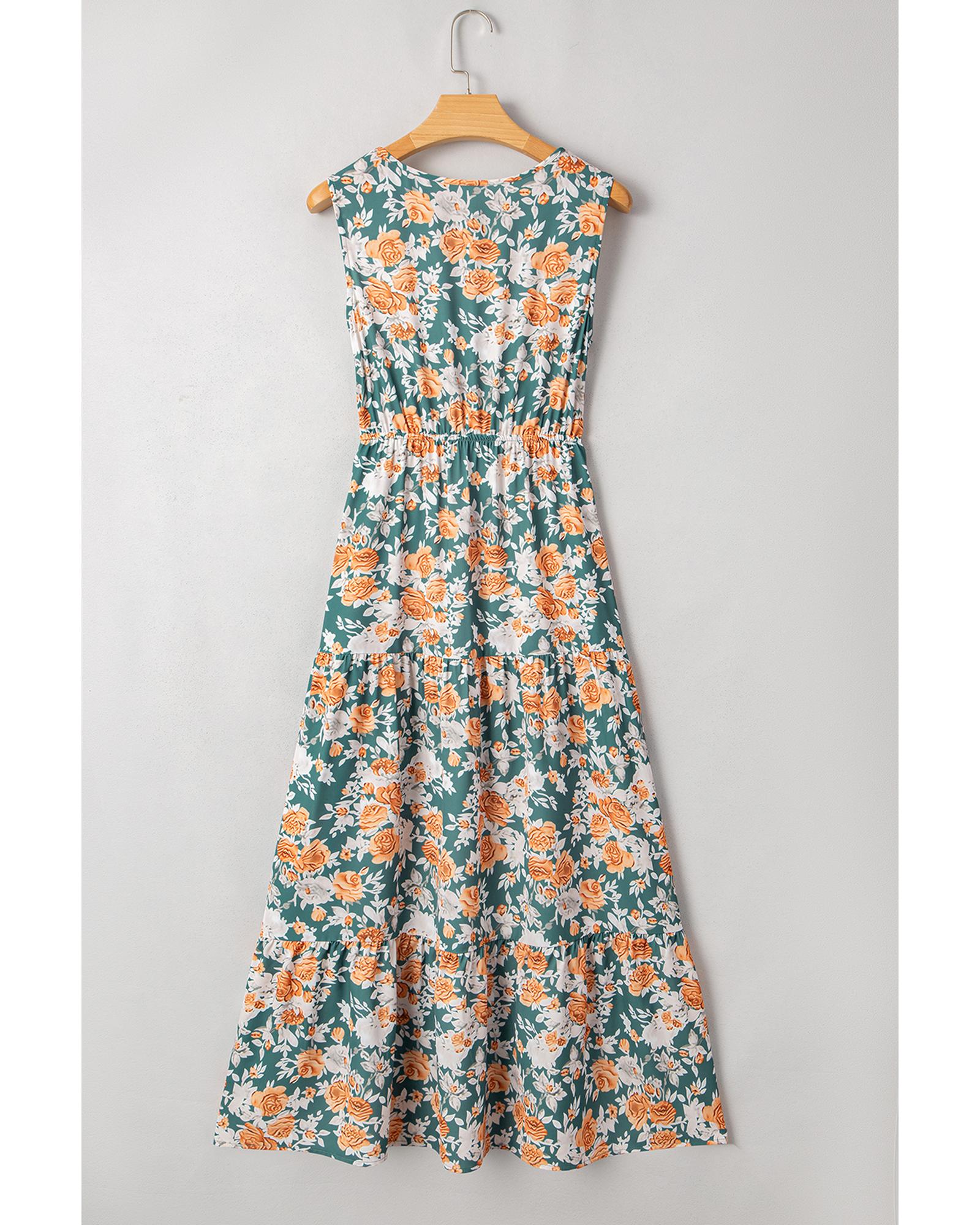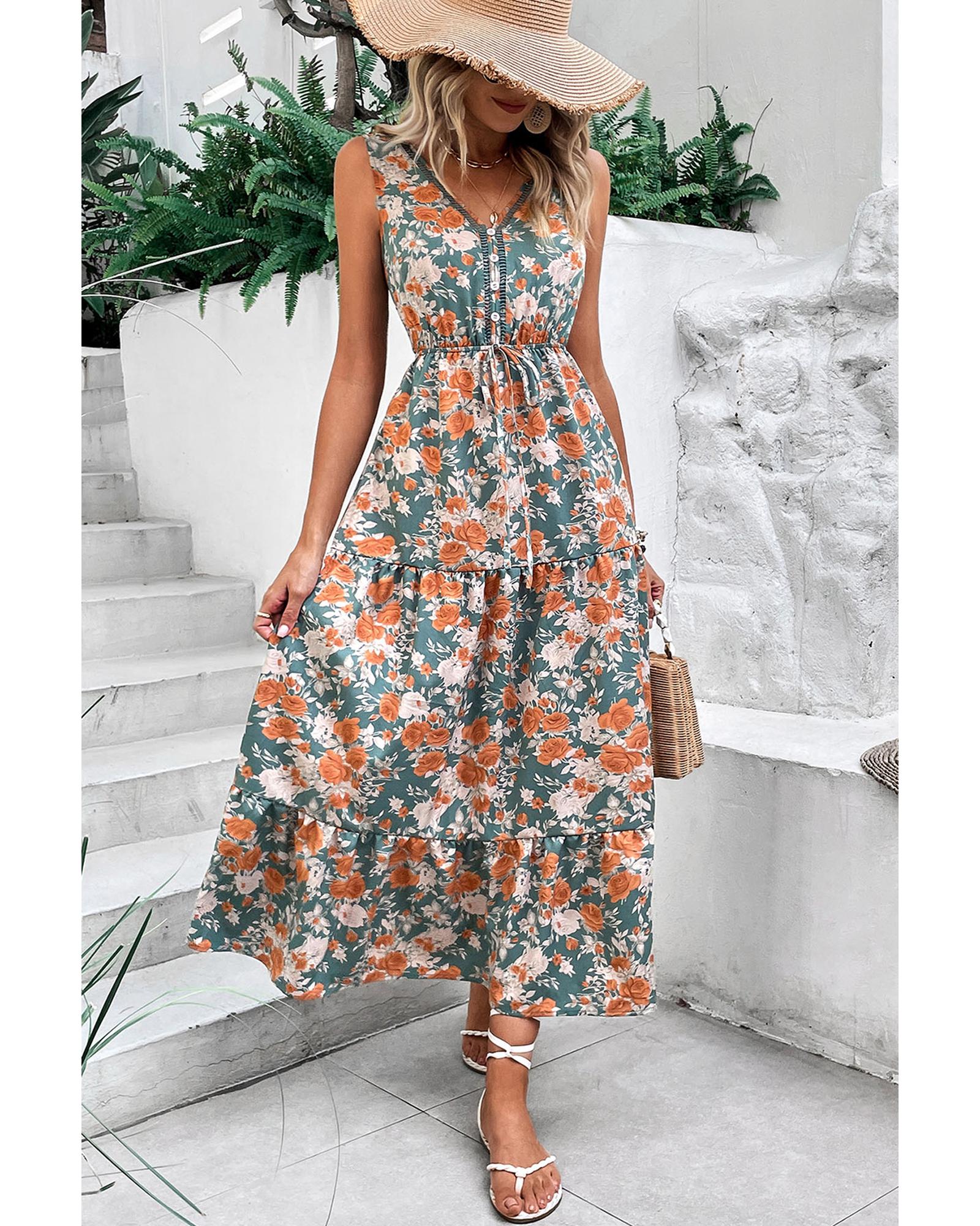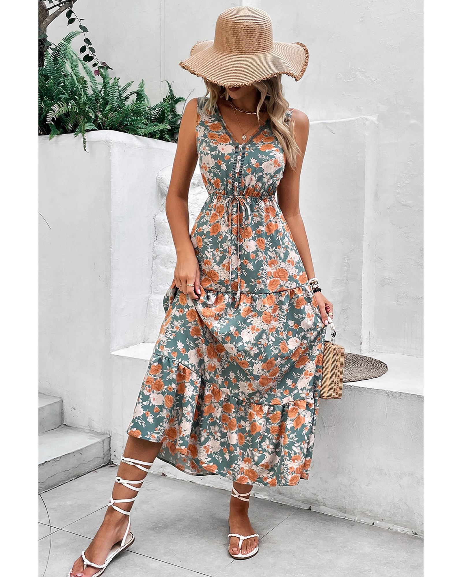Green Floral Print Trimmed V Neck Tie Waist Sleeveless Holiday Long Dress – L