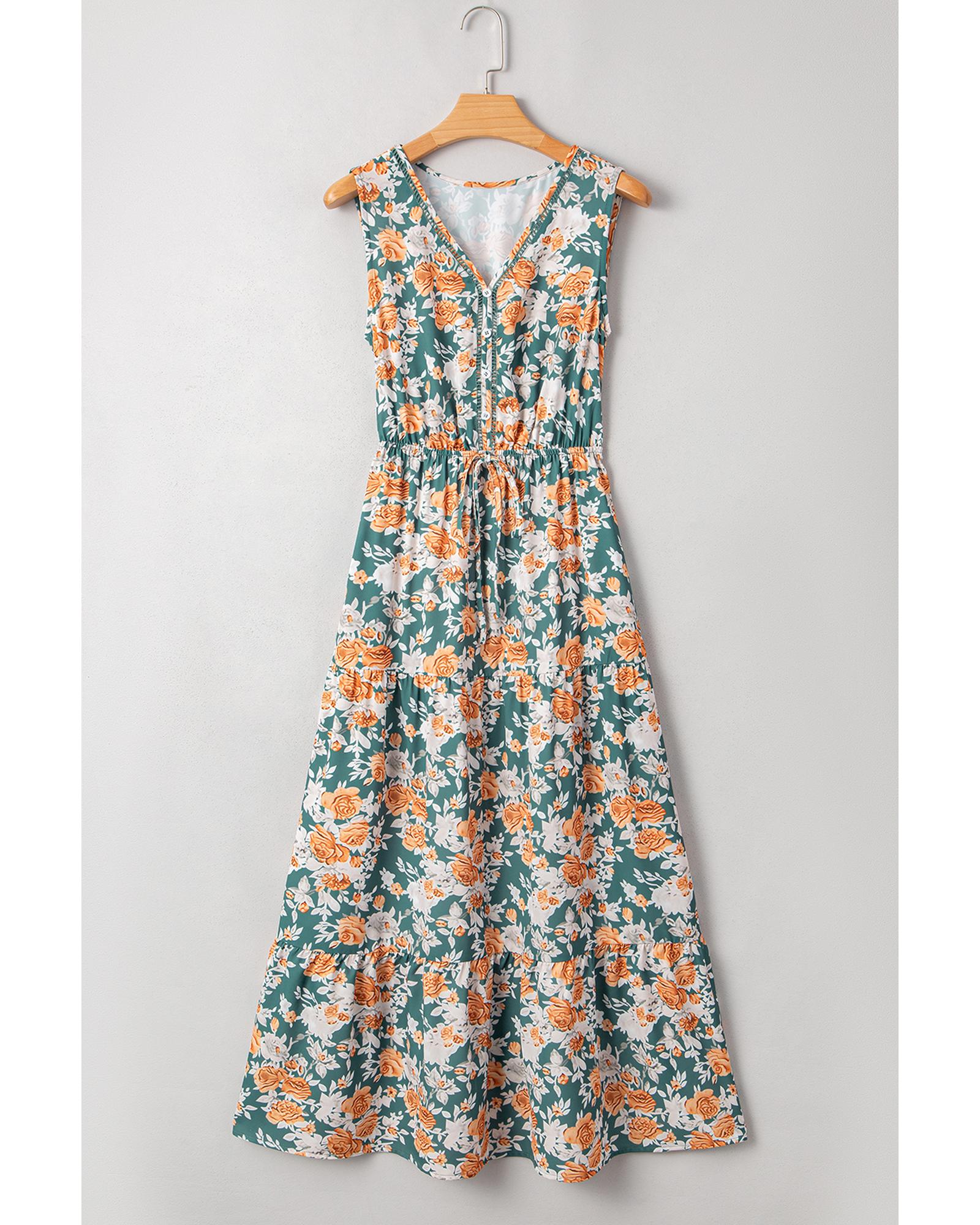Green Floral Print Trimmed V Neck Tie Waist Sleeveless Holiday Long Dress – M