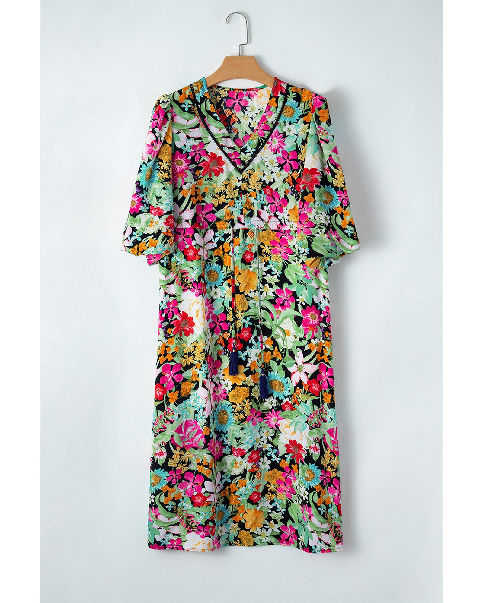 Green Floral Puff Sleeve V Neck Tassel Drawstring Dress – S