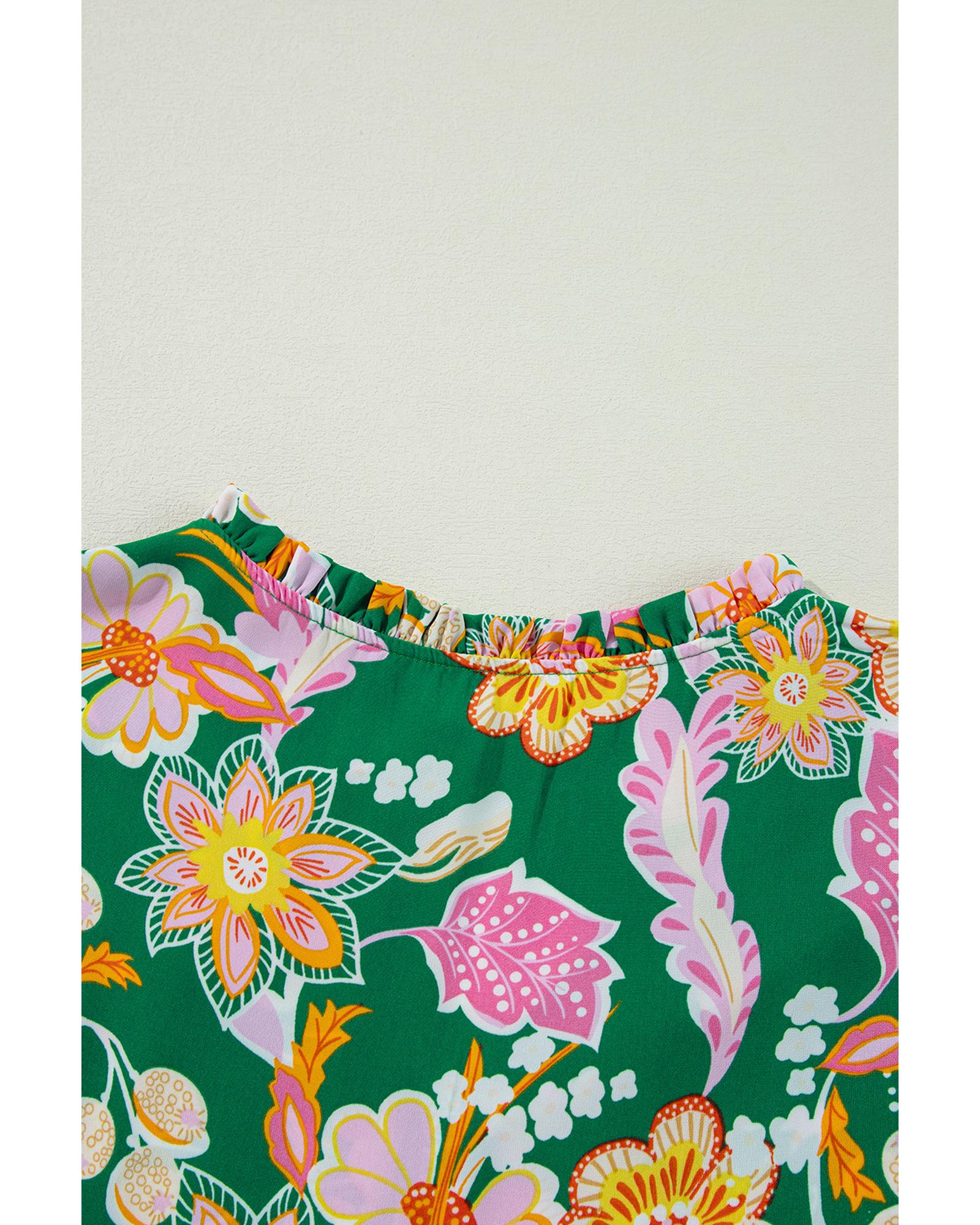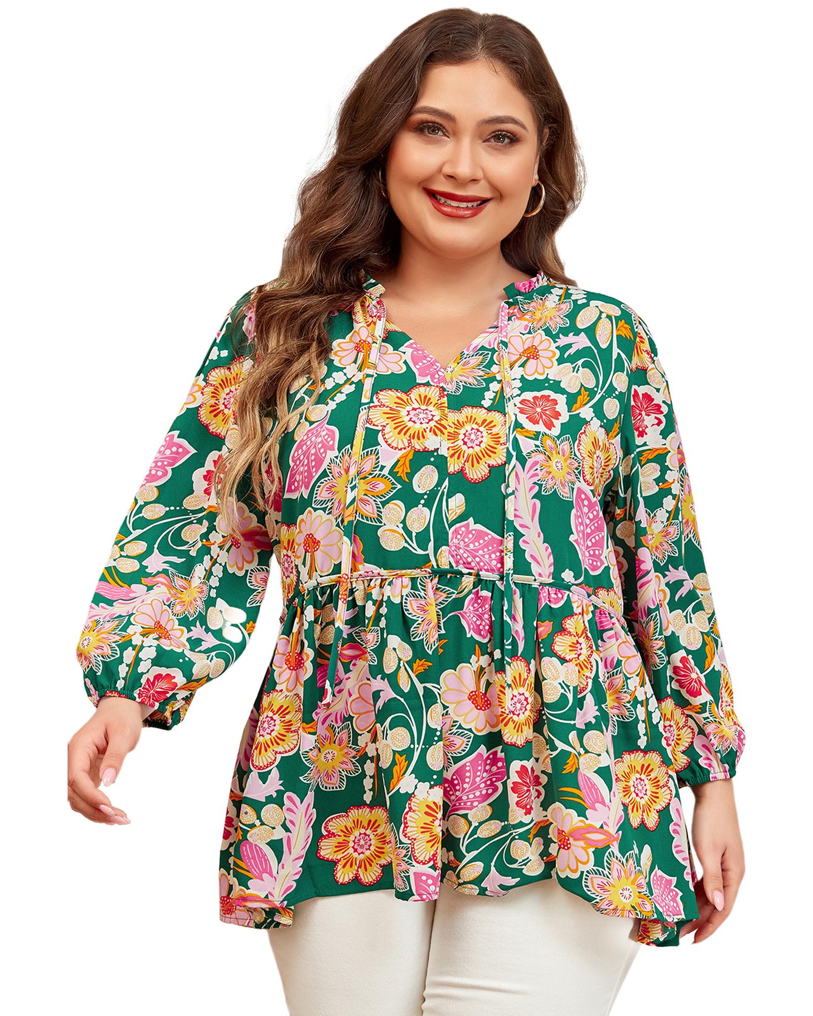 Green Floral Tied V Neck Long Sleeve Plus Size Babydoll Top – 2X
