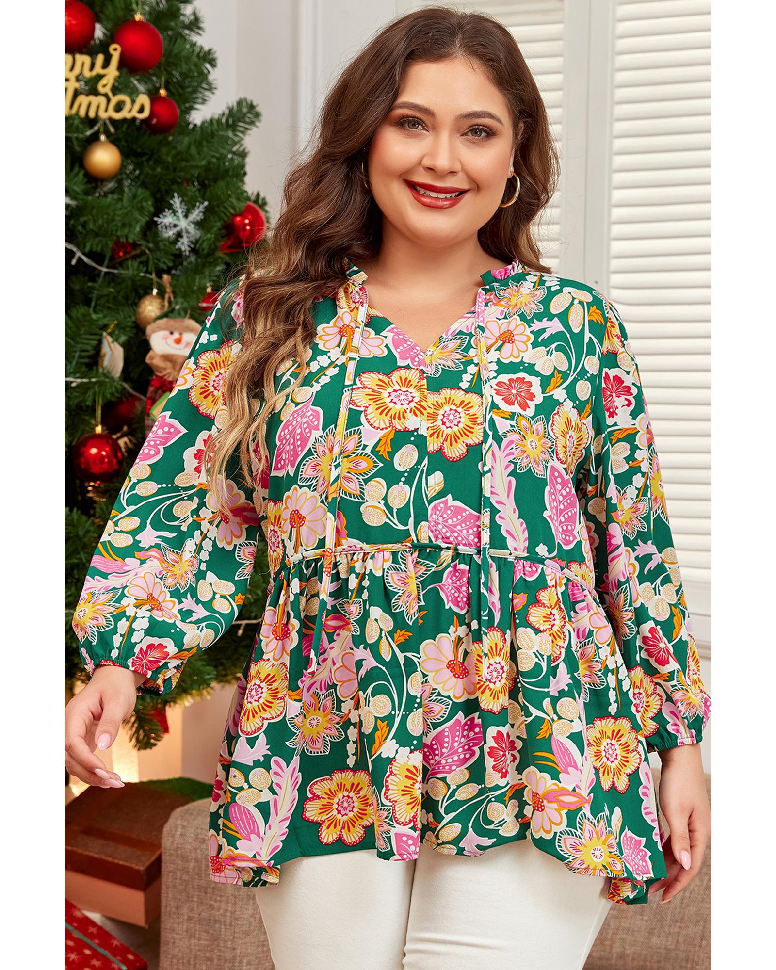 Green Floral Tied V Neck Long Sleeve Plus Size Babydoll Top – 4X