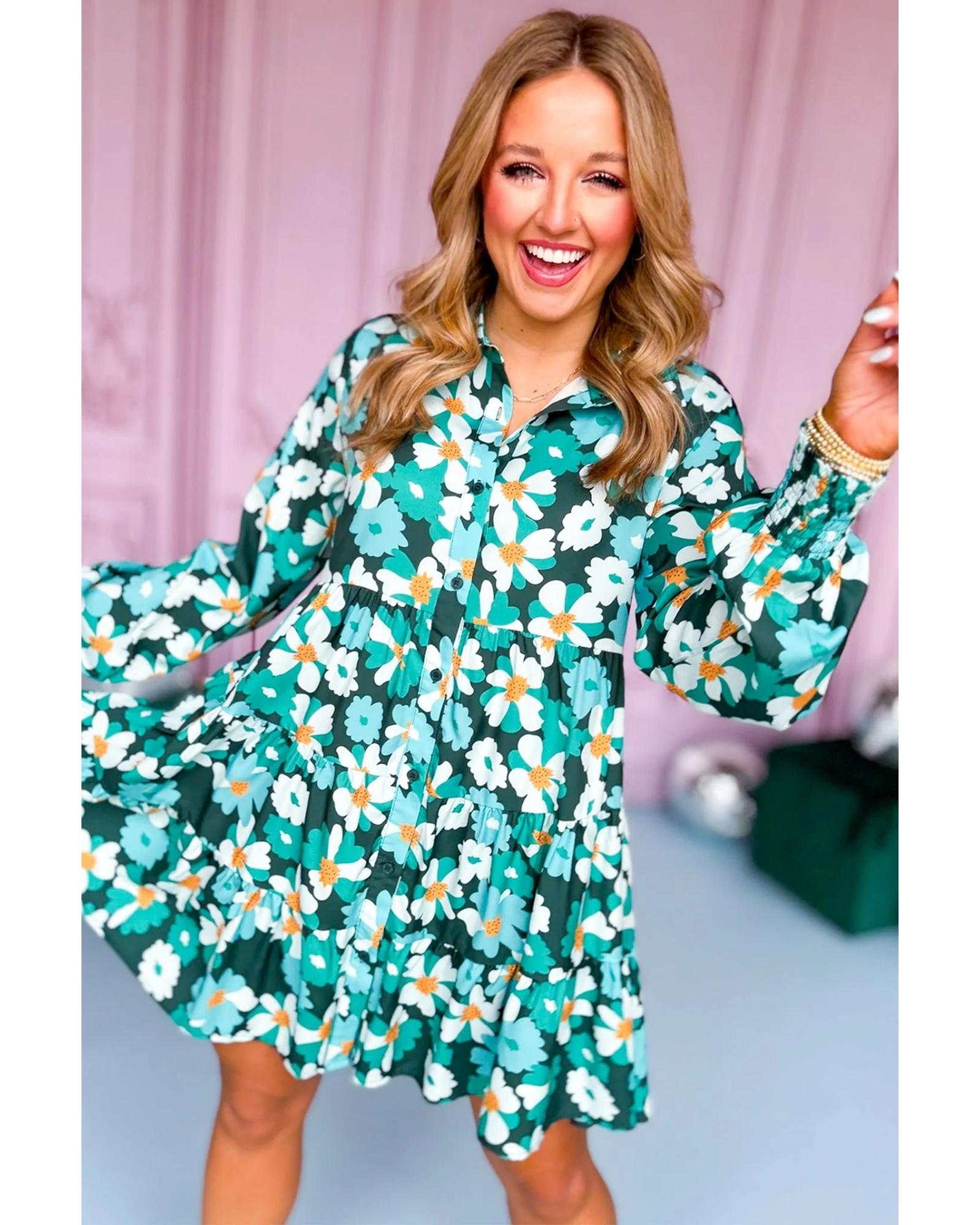 - Green floral tiered shirt dress