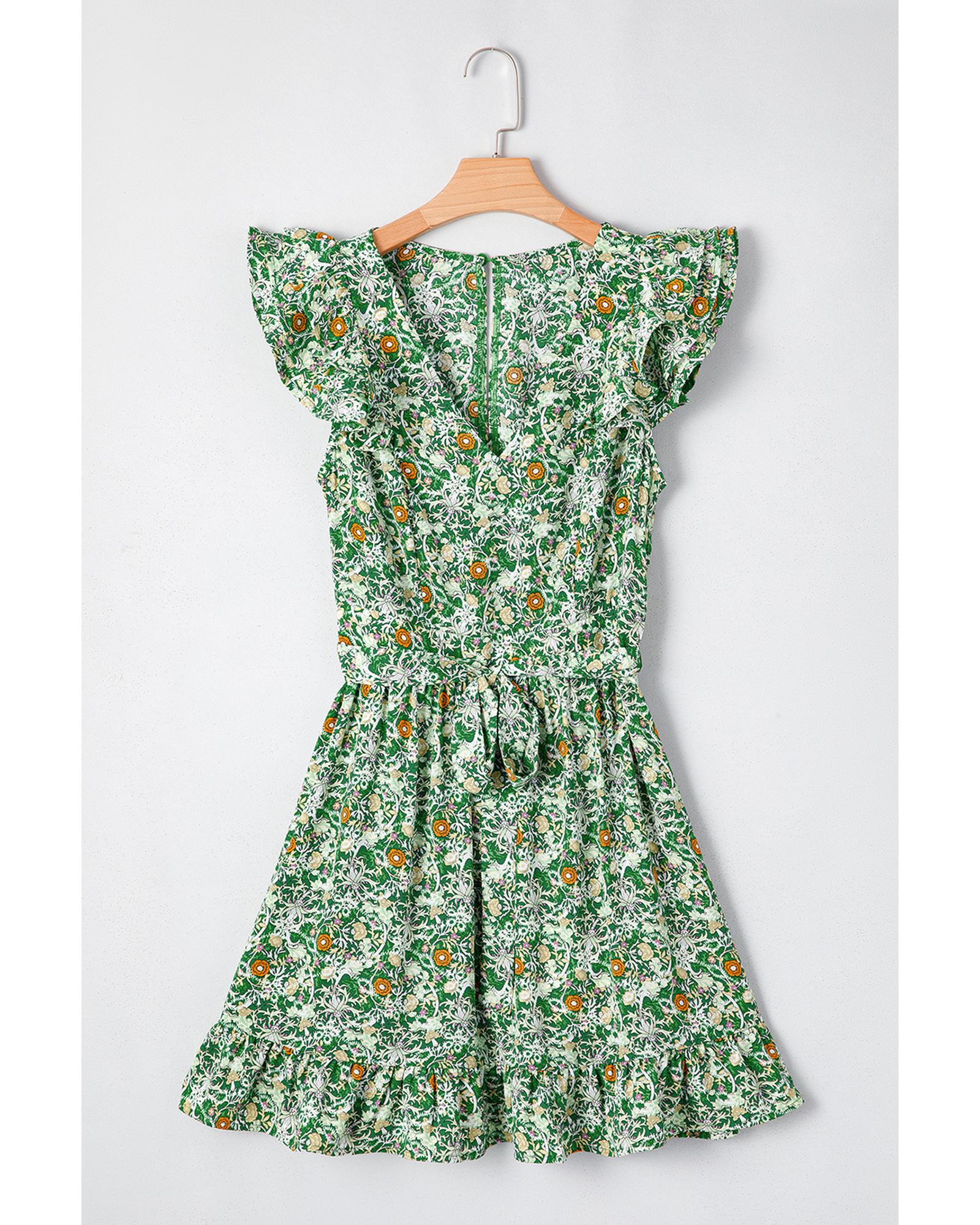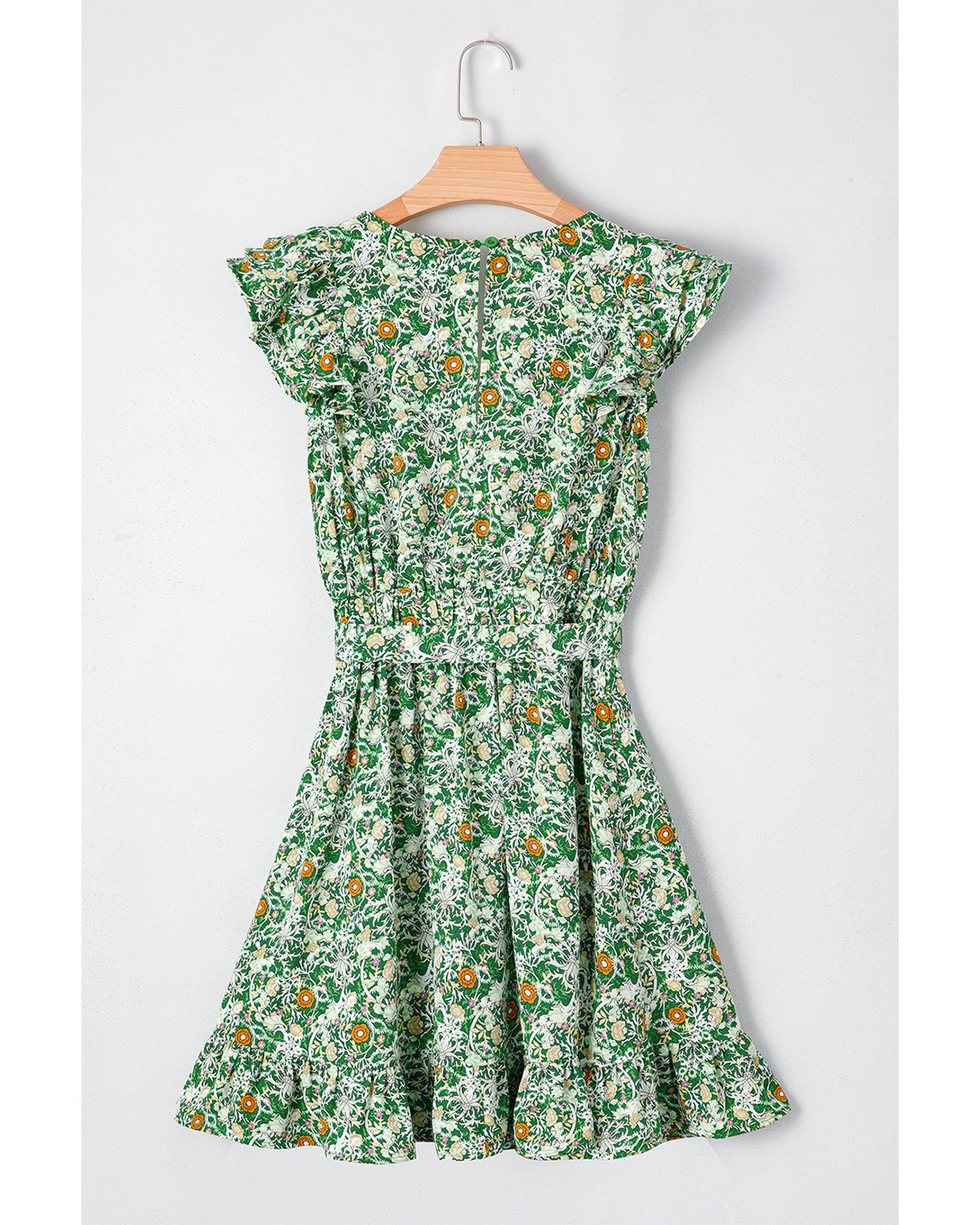 Green Flower Print Flutter Sleeve V Neck Sashed Ruffled Mini Dress – M