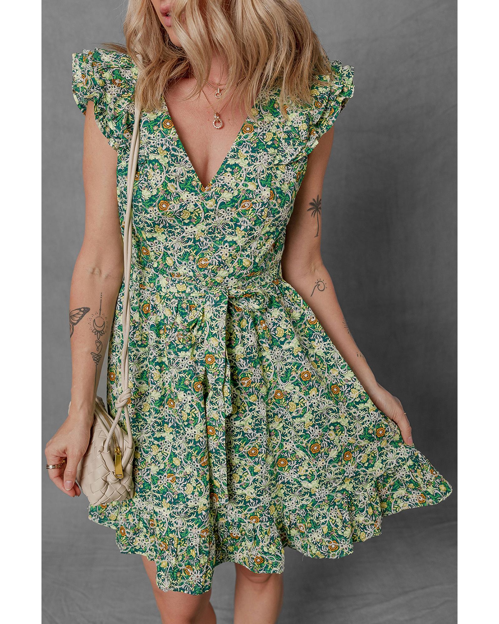 Green Flower Print Flutter Sleeve V Neck Sashed Ruffled Mini Dress – XL