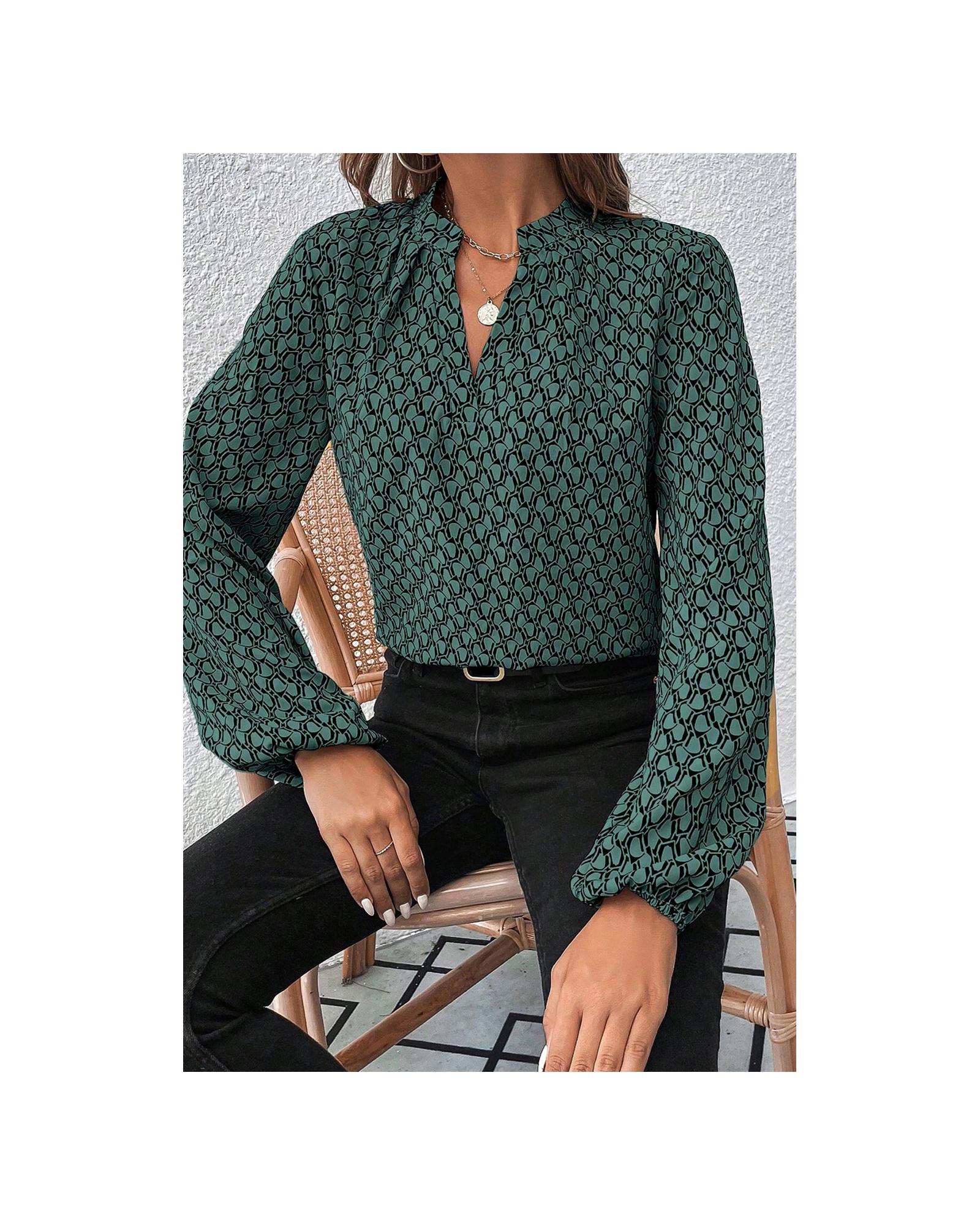 Green Geometric Print Notched Neck Puff Sleeve Blouse – L