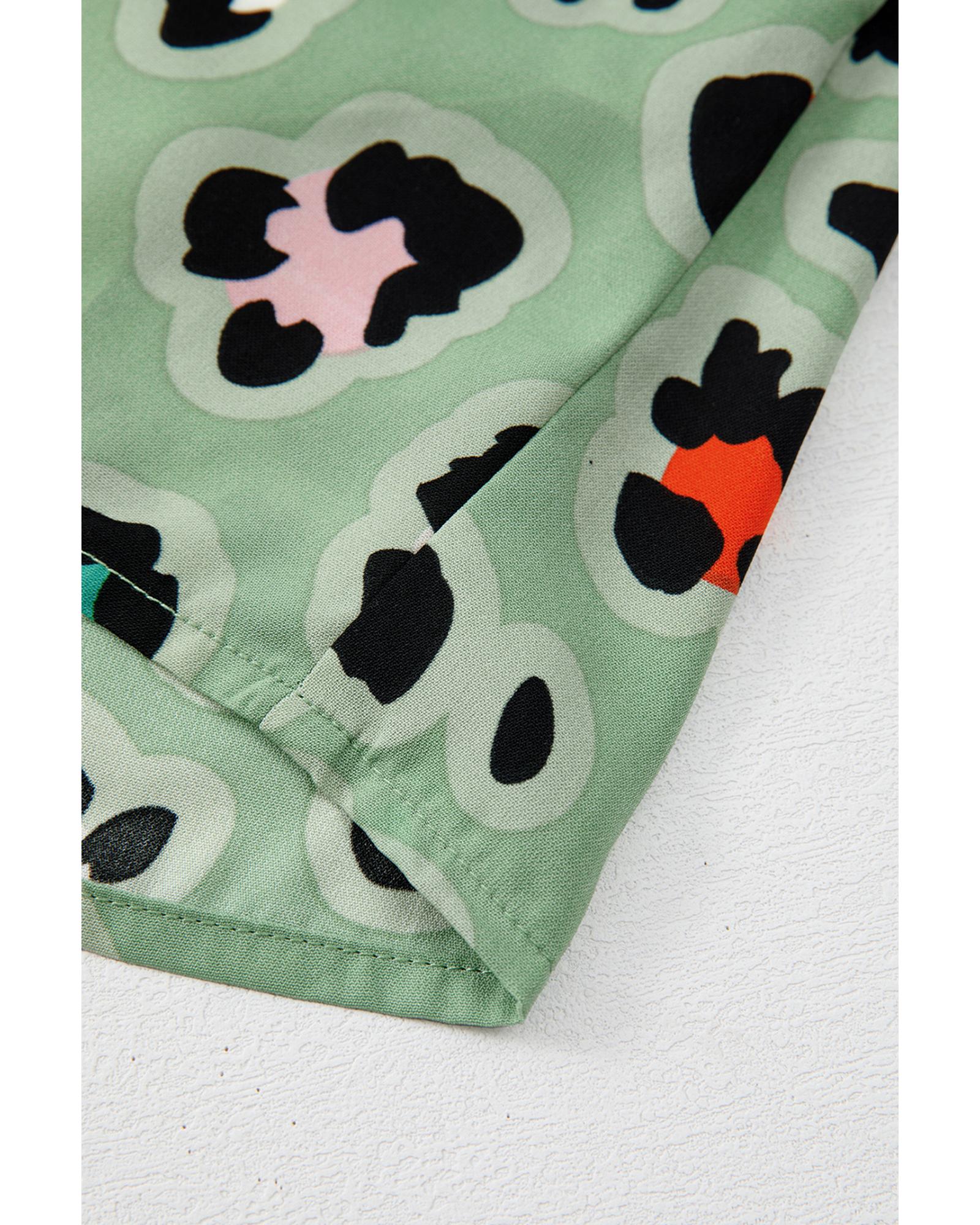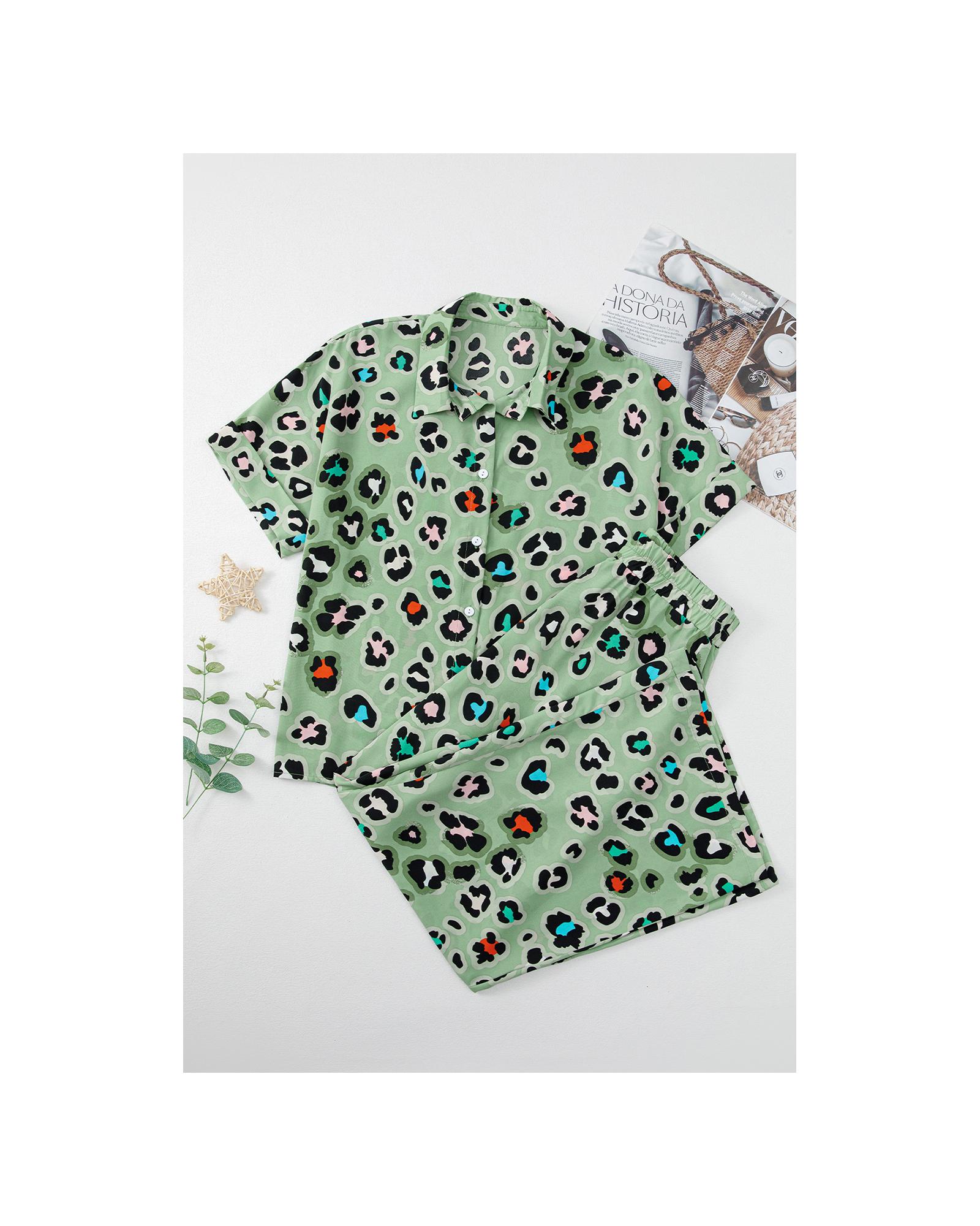- Green Leopard Print Short Sleeve Shirt and Wide Leg Pants Set