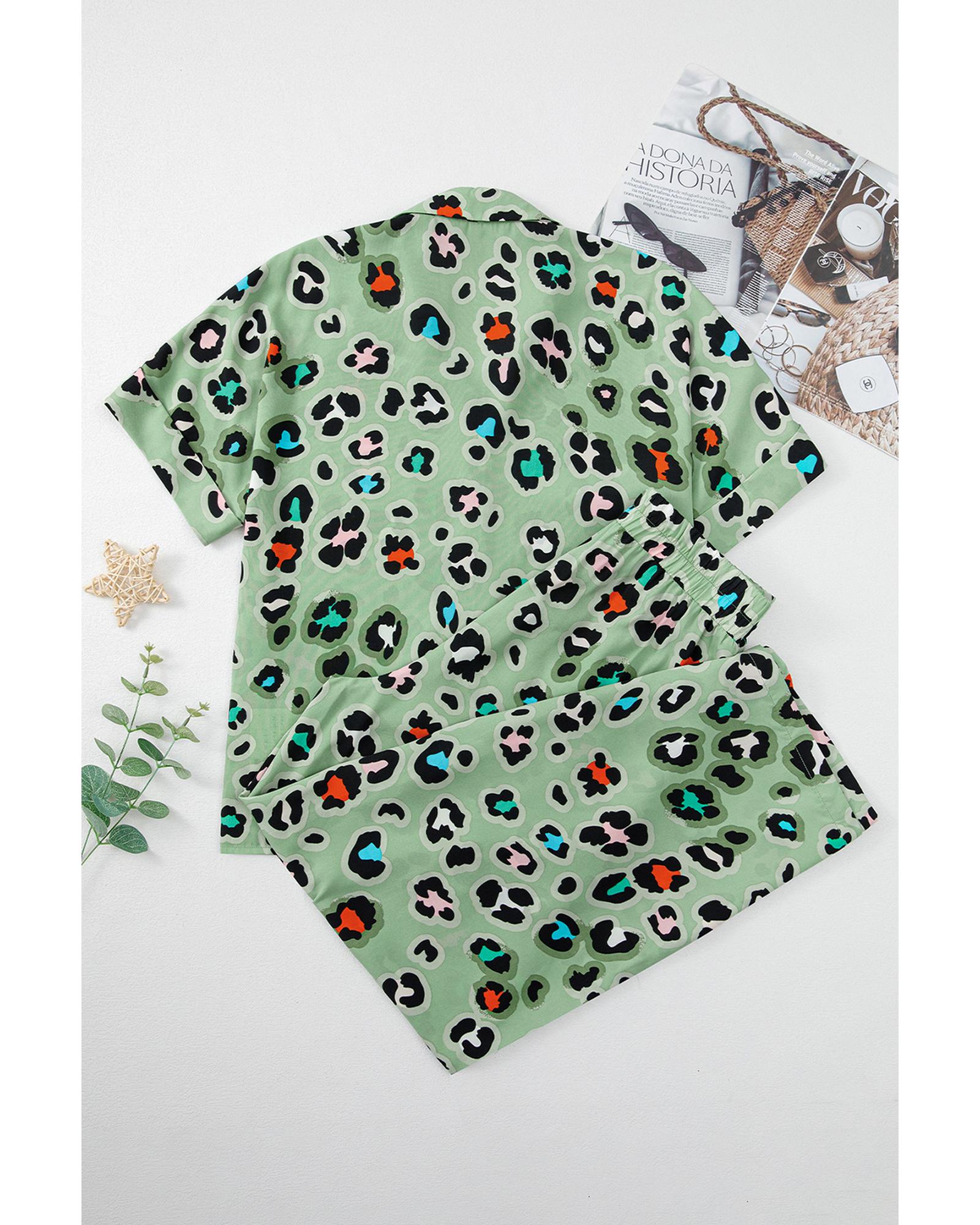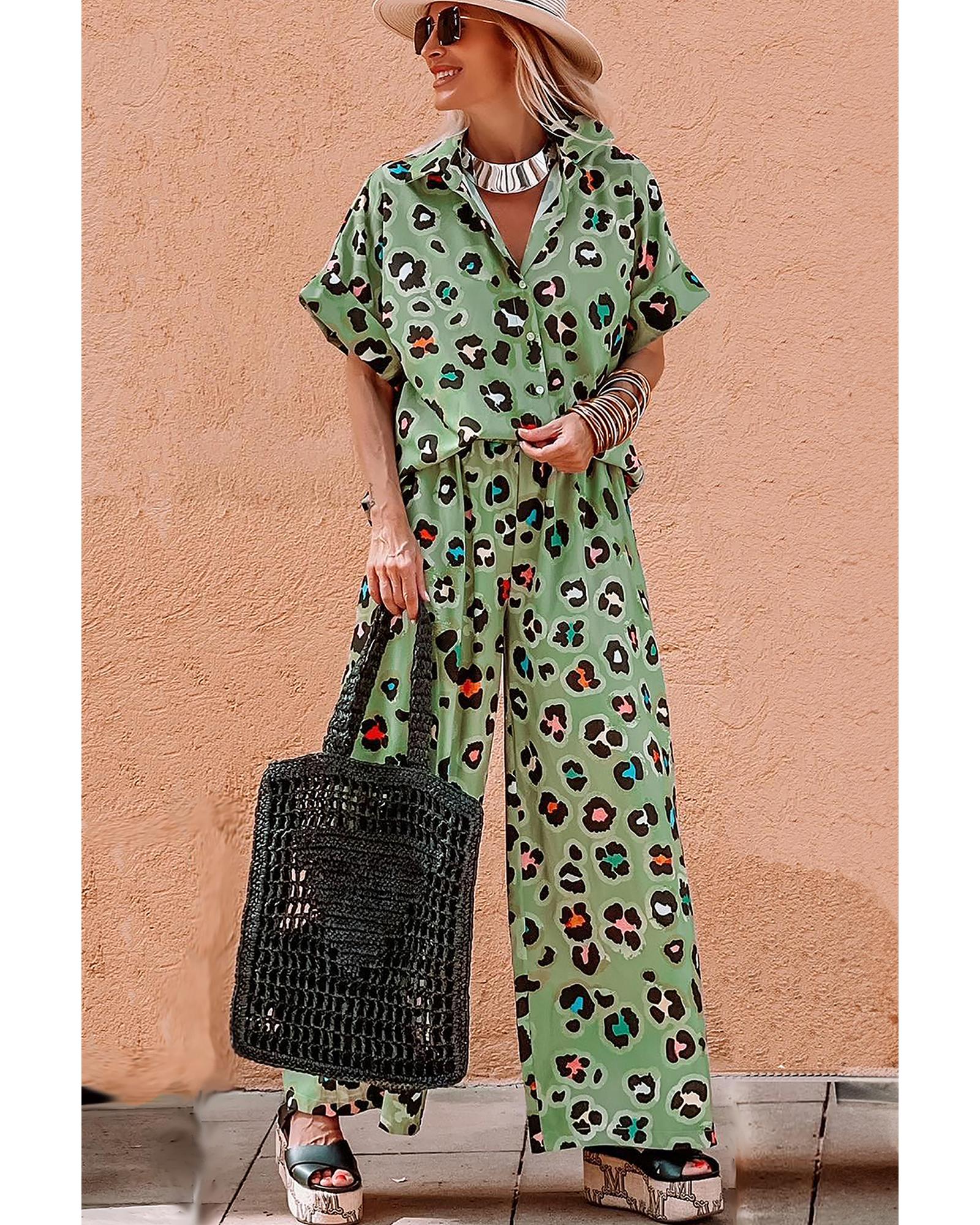- Green Leopard Print Short Sleeve Shirt and Wide Leg Pants Set