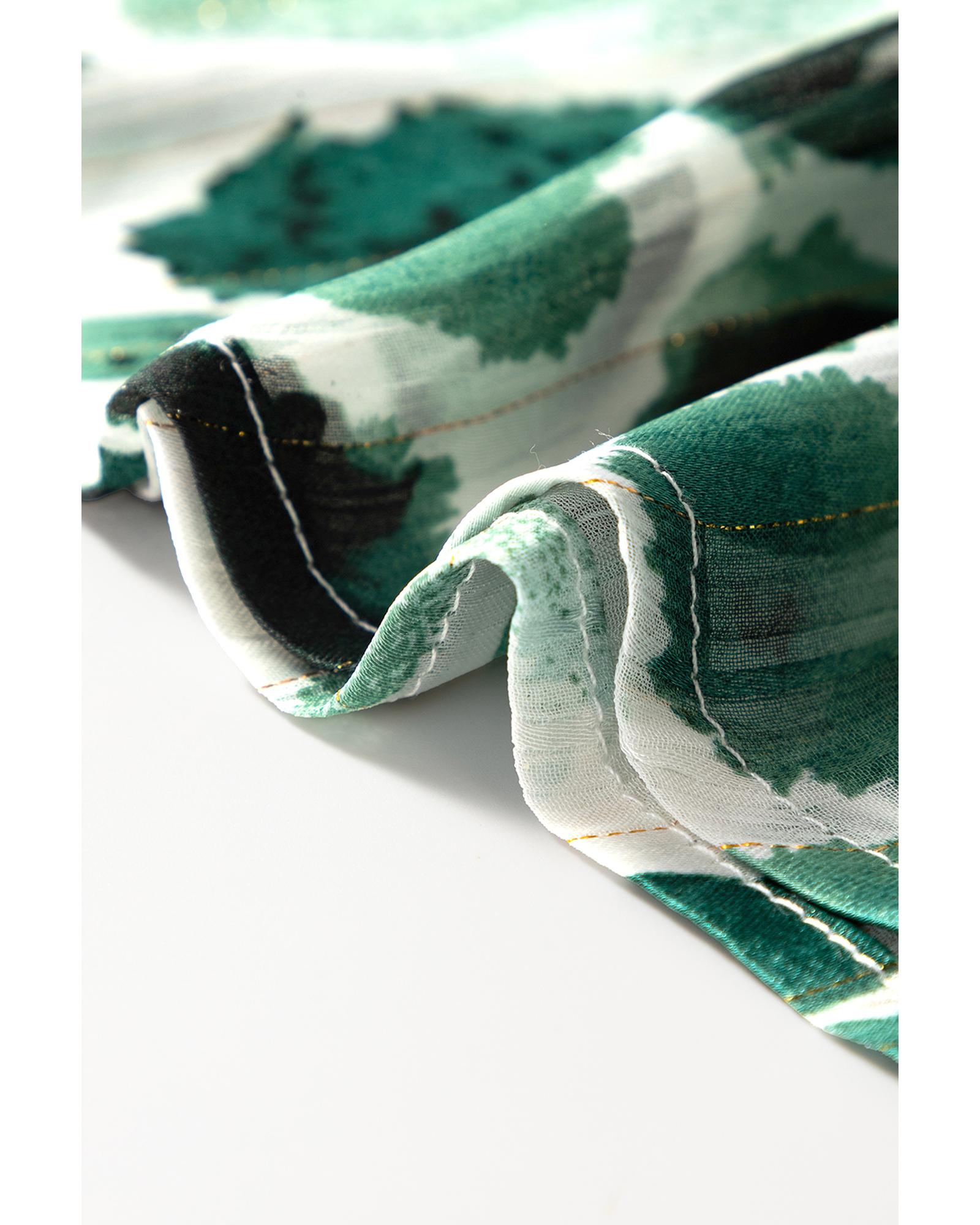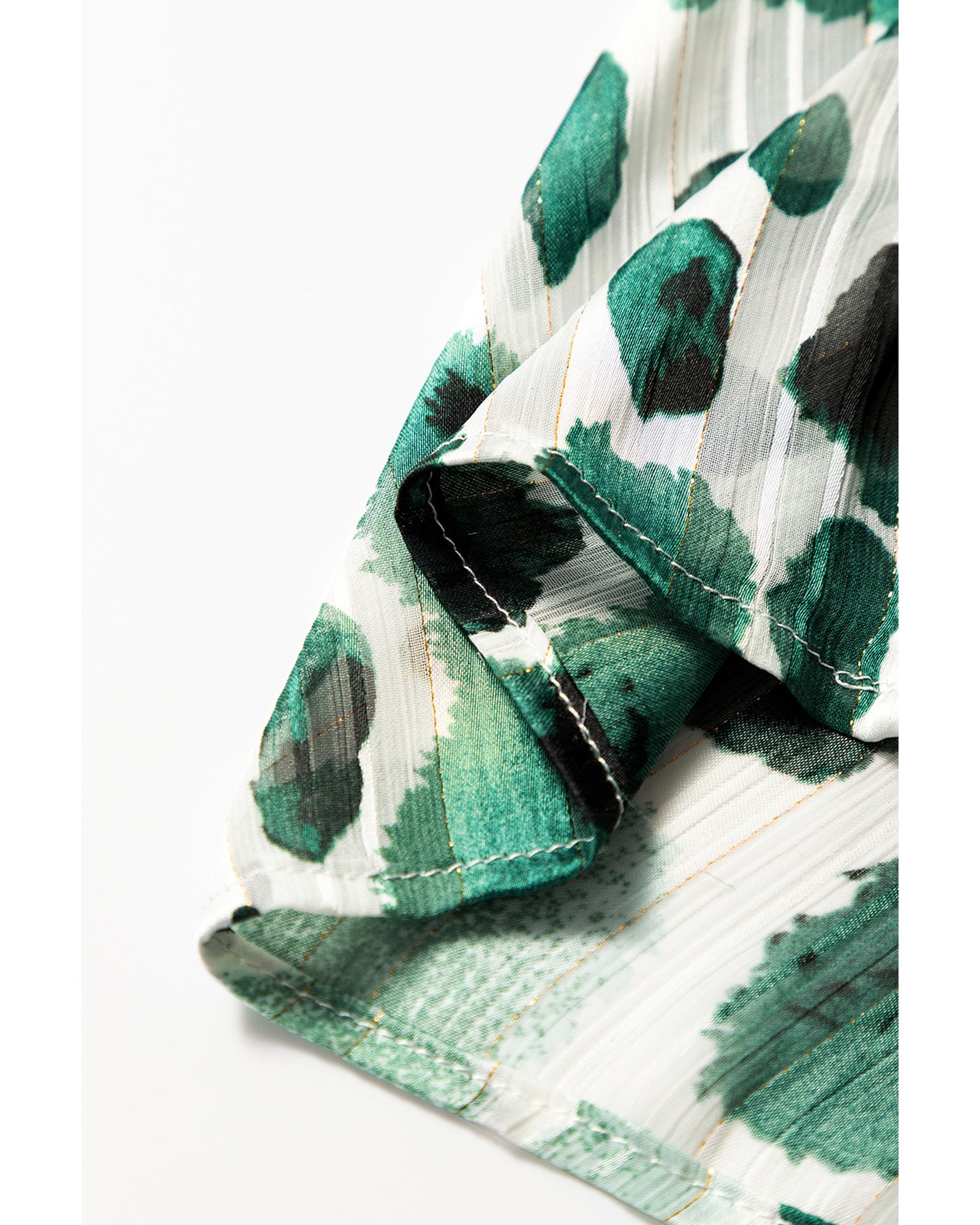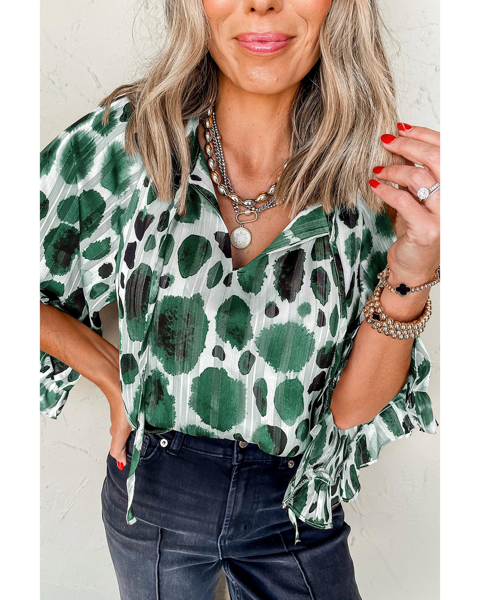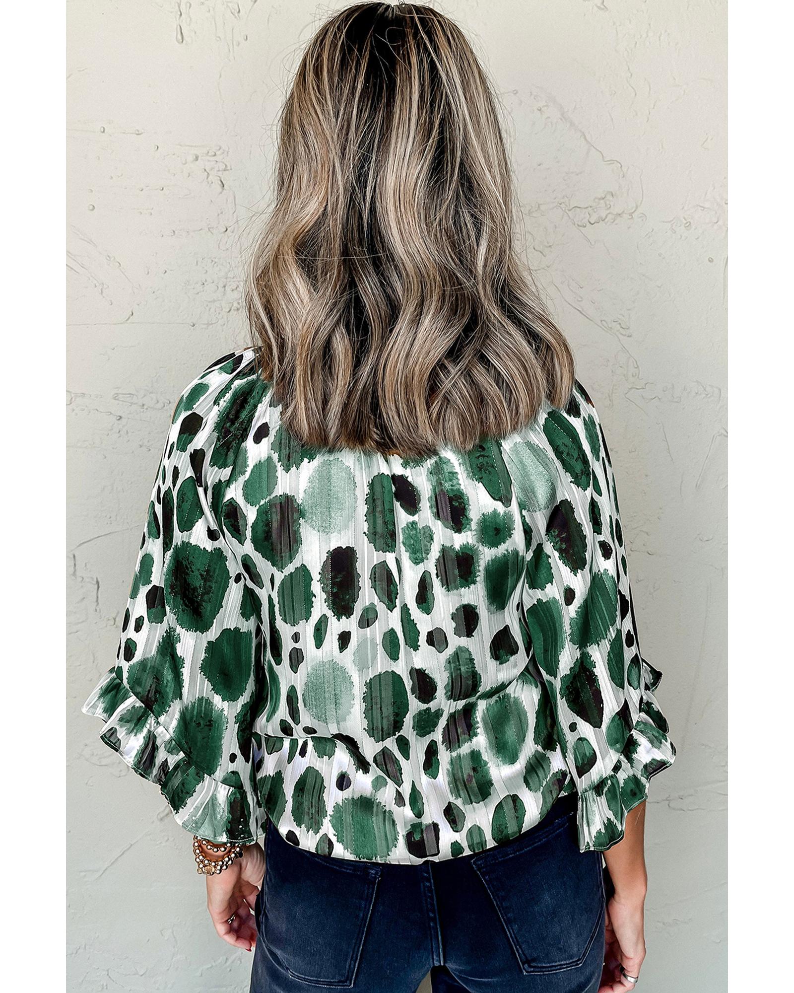 Green Metallic Threading Accents Pleated Abstract Printed Ruffled 3/4 Sleeve Blouse – S