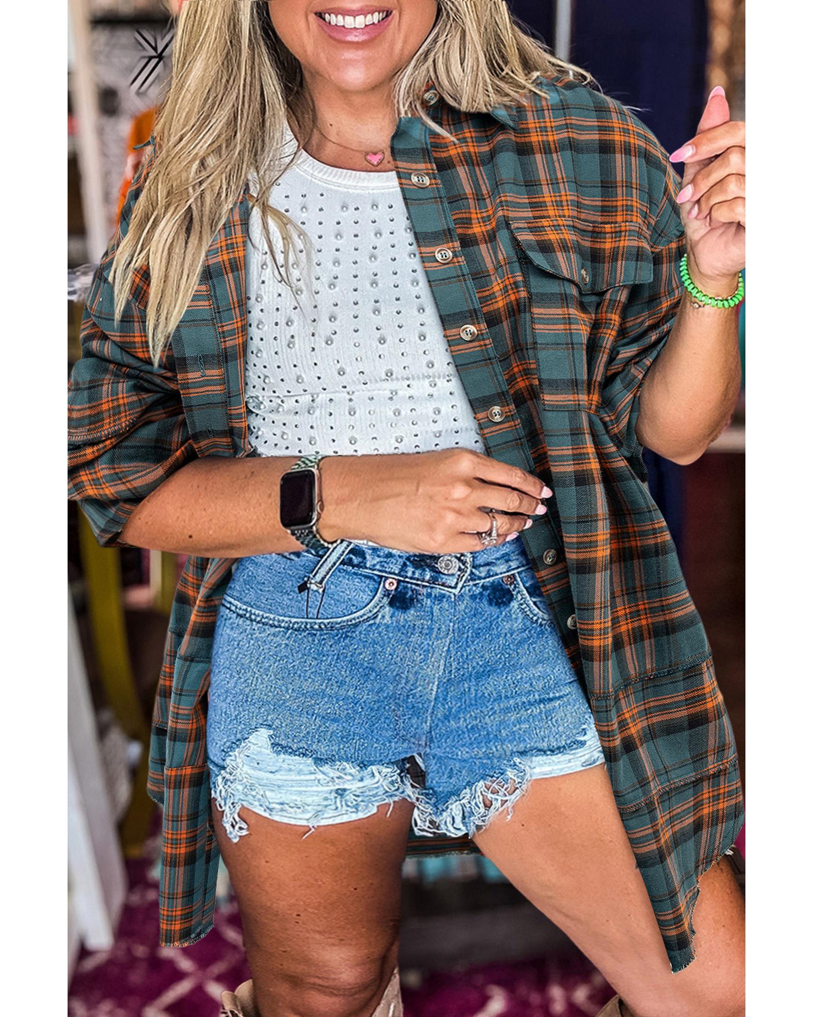 Green Plaid Long Sleeeve Side Split Distressed Hem Shirt – S