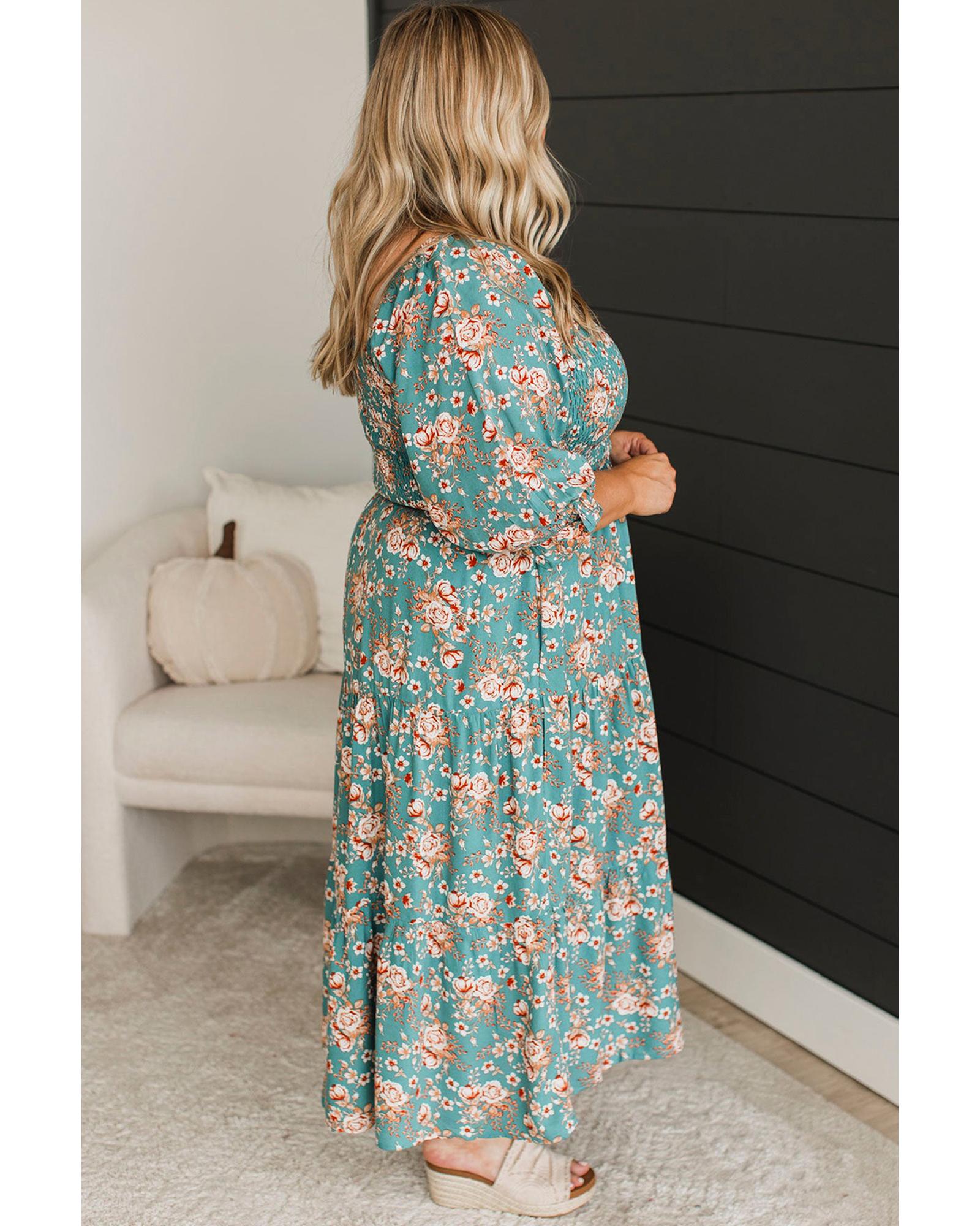 - Green Plus Size Floral Print Square Neck Smocked Maxi Dress