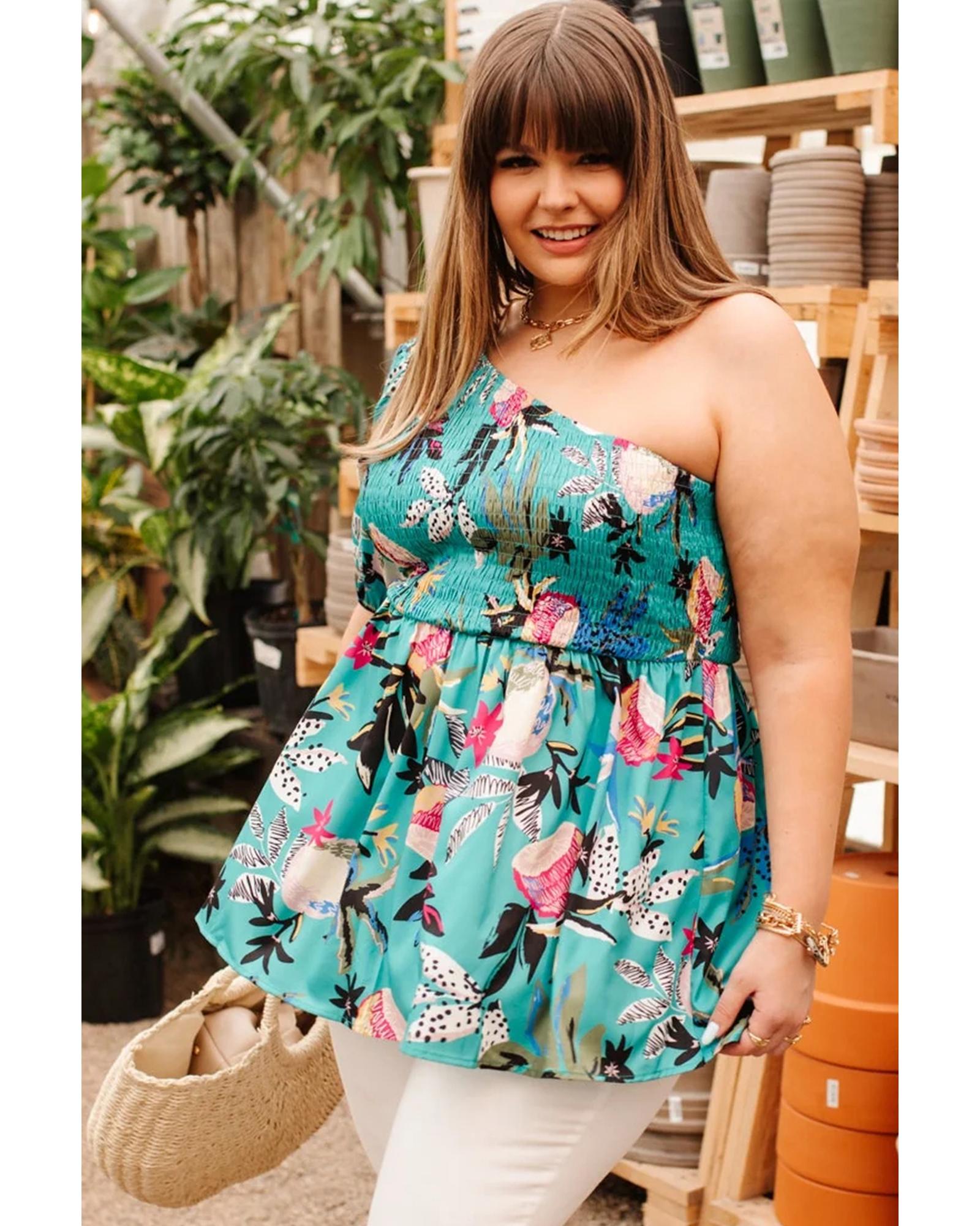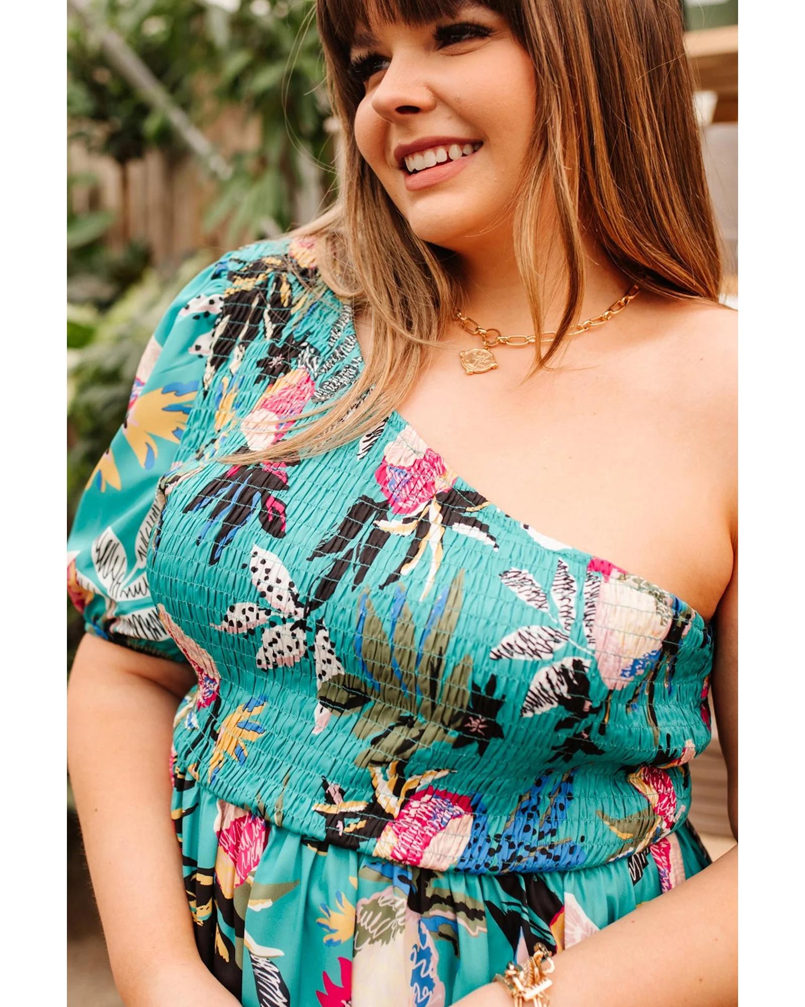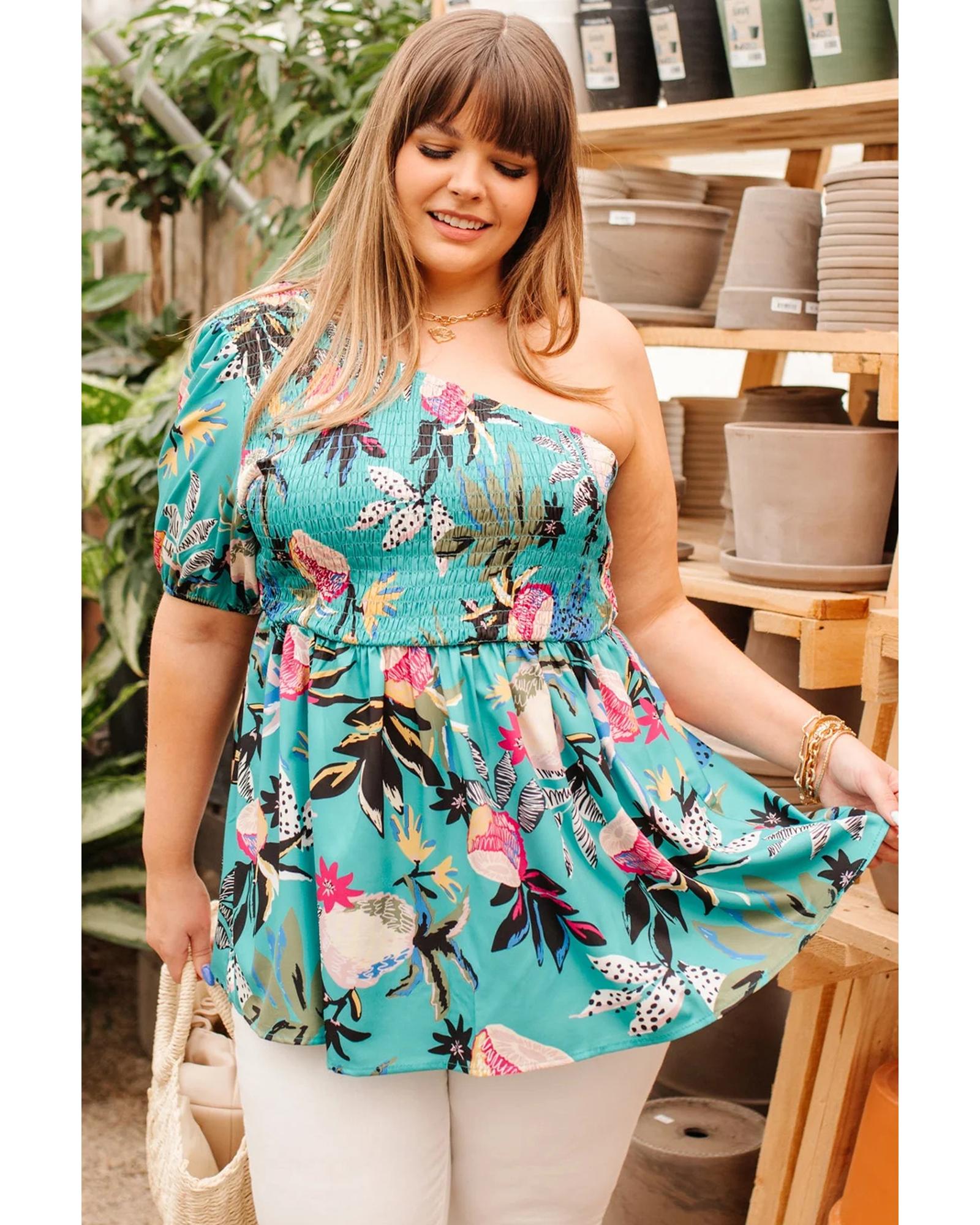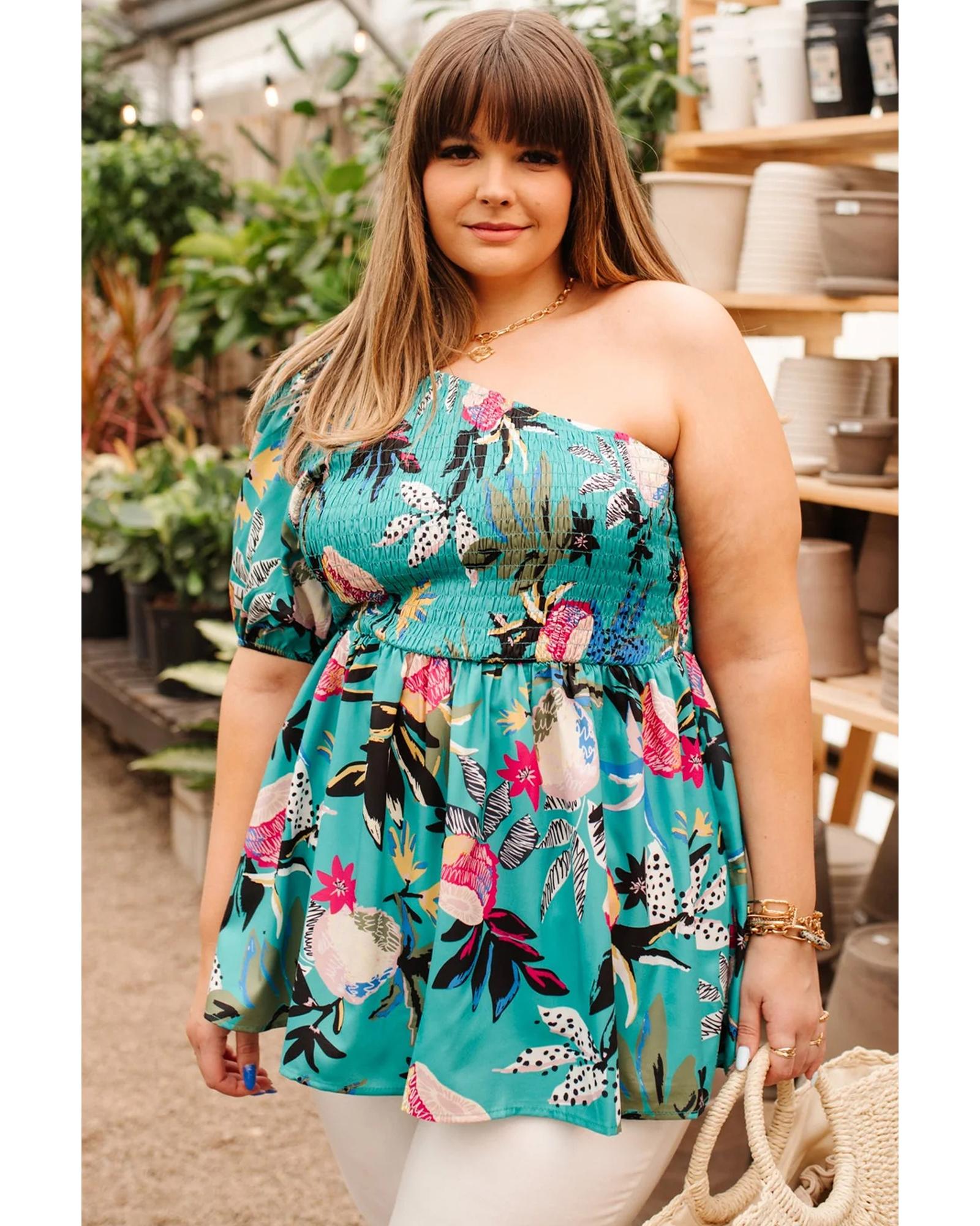 Green Plus Size Floral Smocked Bodice Single Puff Short Sleeve Babydoll Blouse – 1X