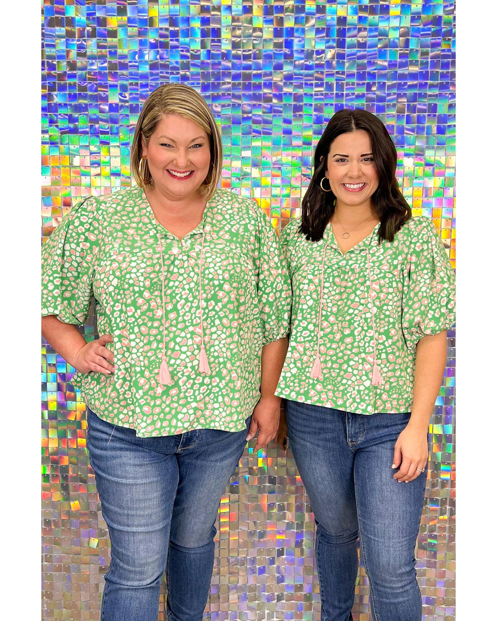 Green Plus Size Floral Tassel Tie Split Neck Puff Sleeve Blouse – 4X