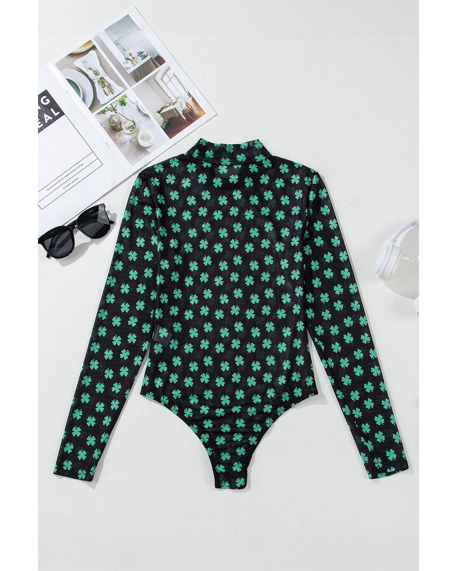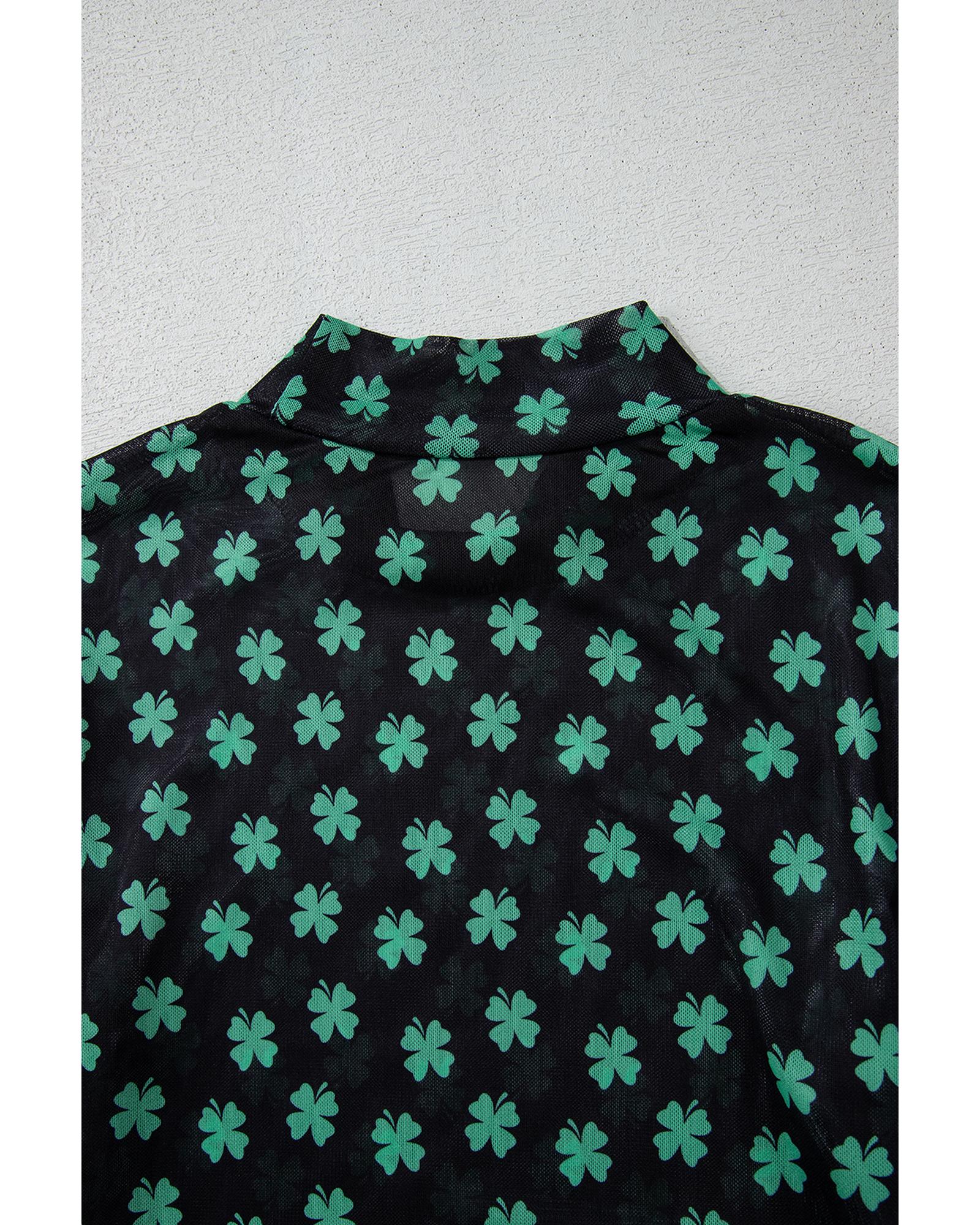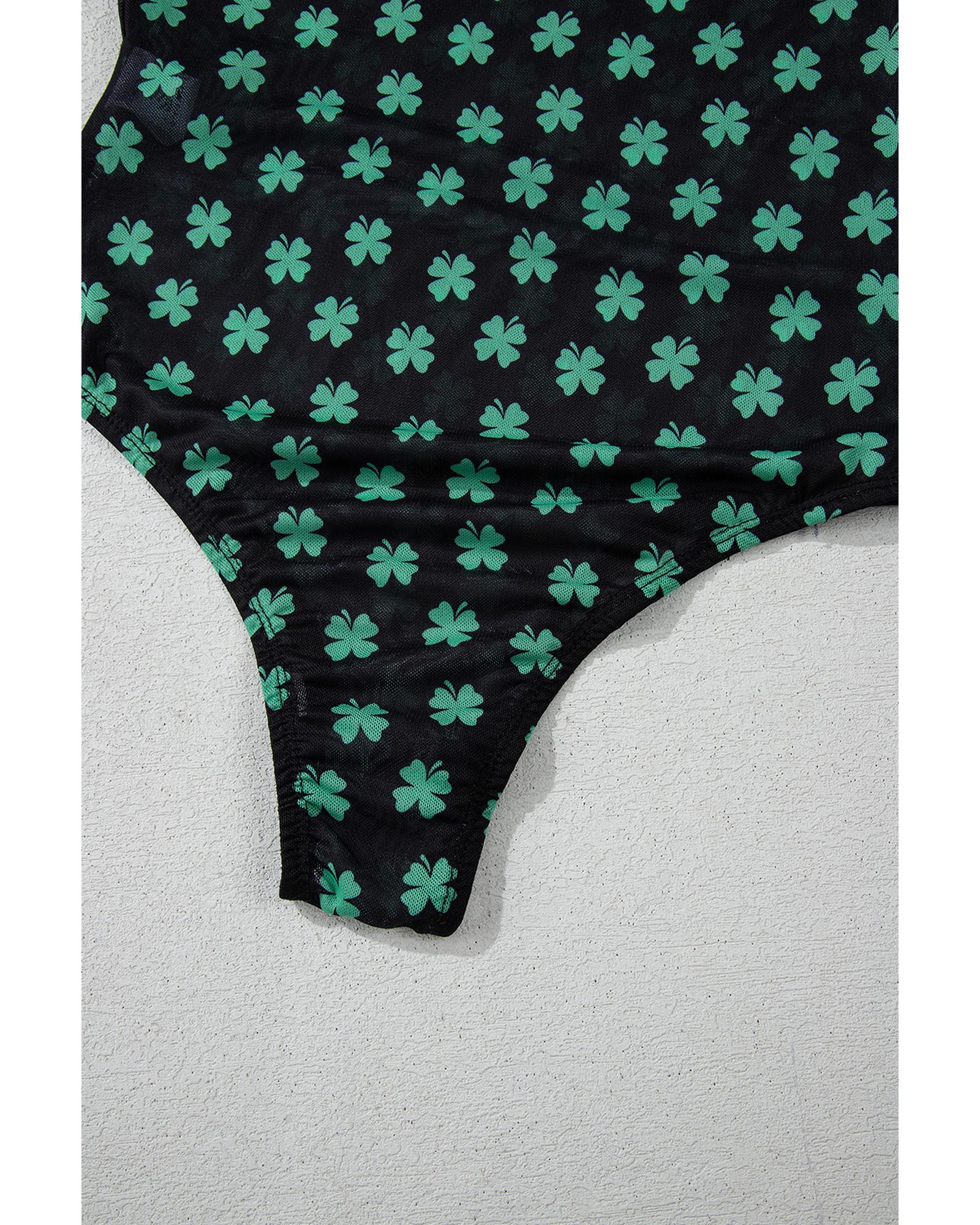 Green St Patrick Shamrock Printed Long Sleeve Mesh Bodysuit – S