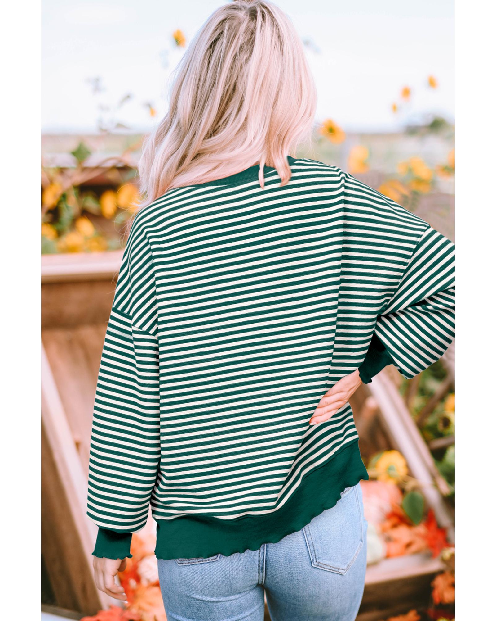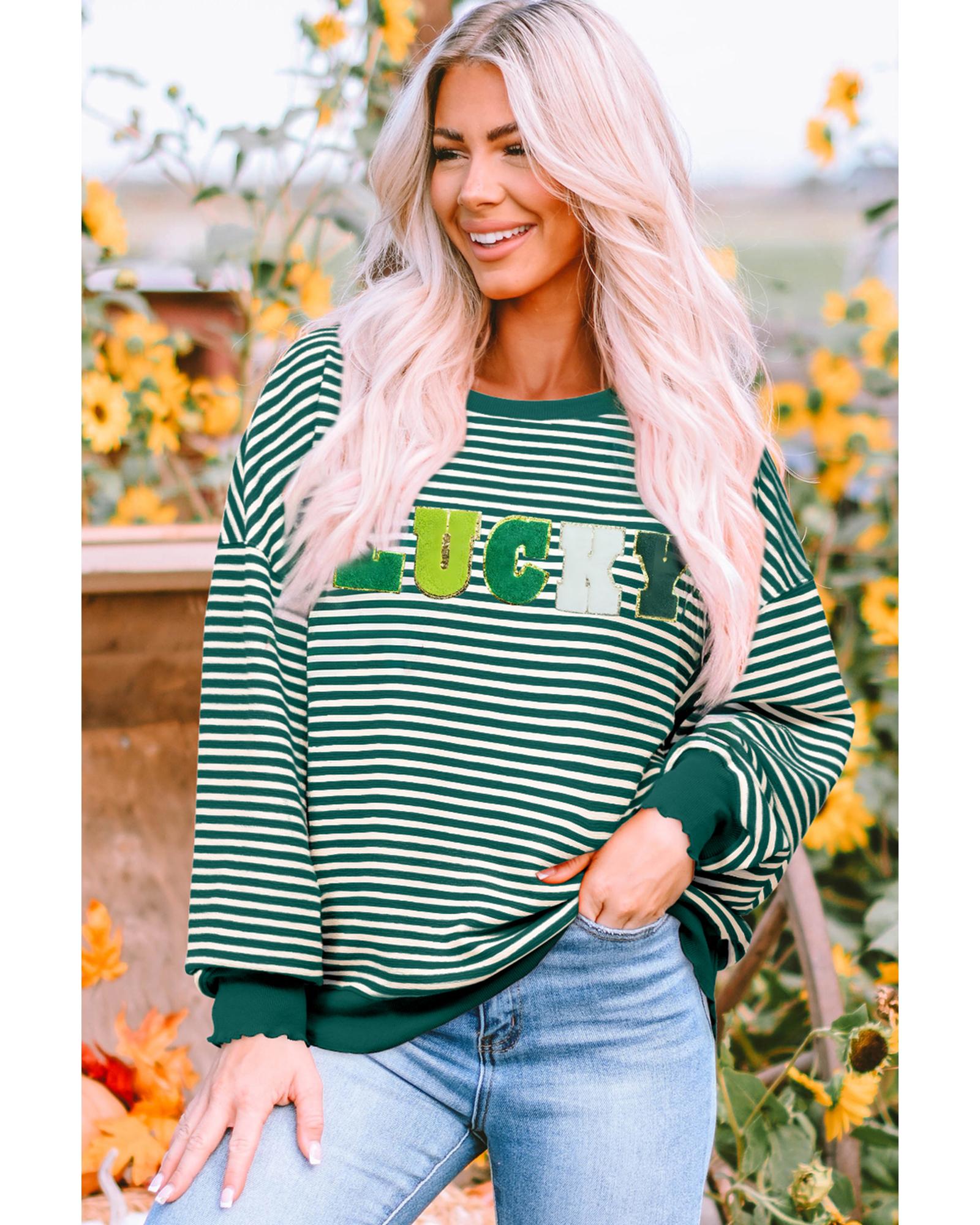 Green Stripe Chenille LUCKY Patched Pattern St Patrick Long Sleeve Top – S